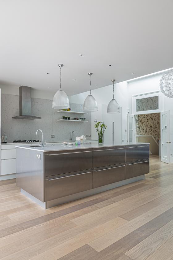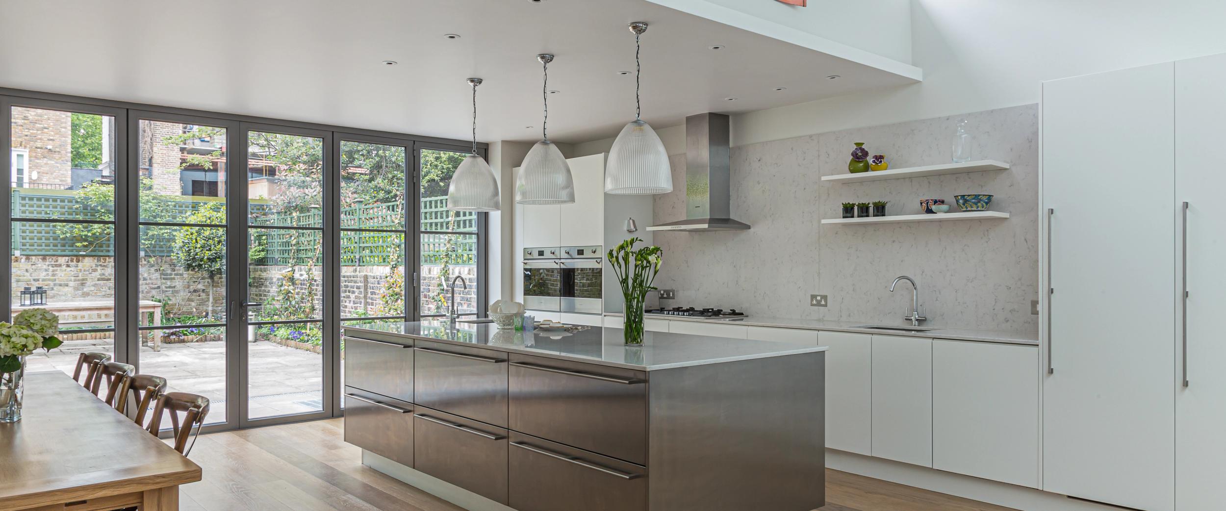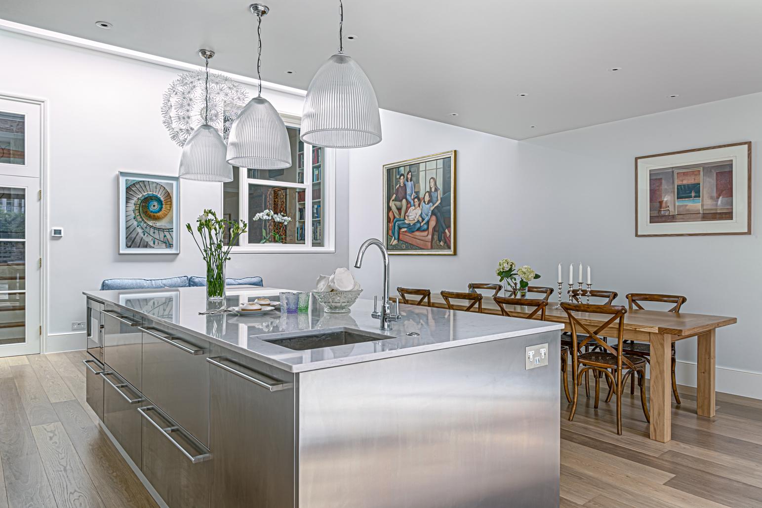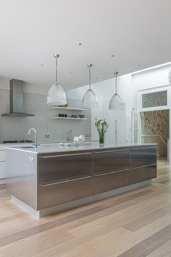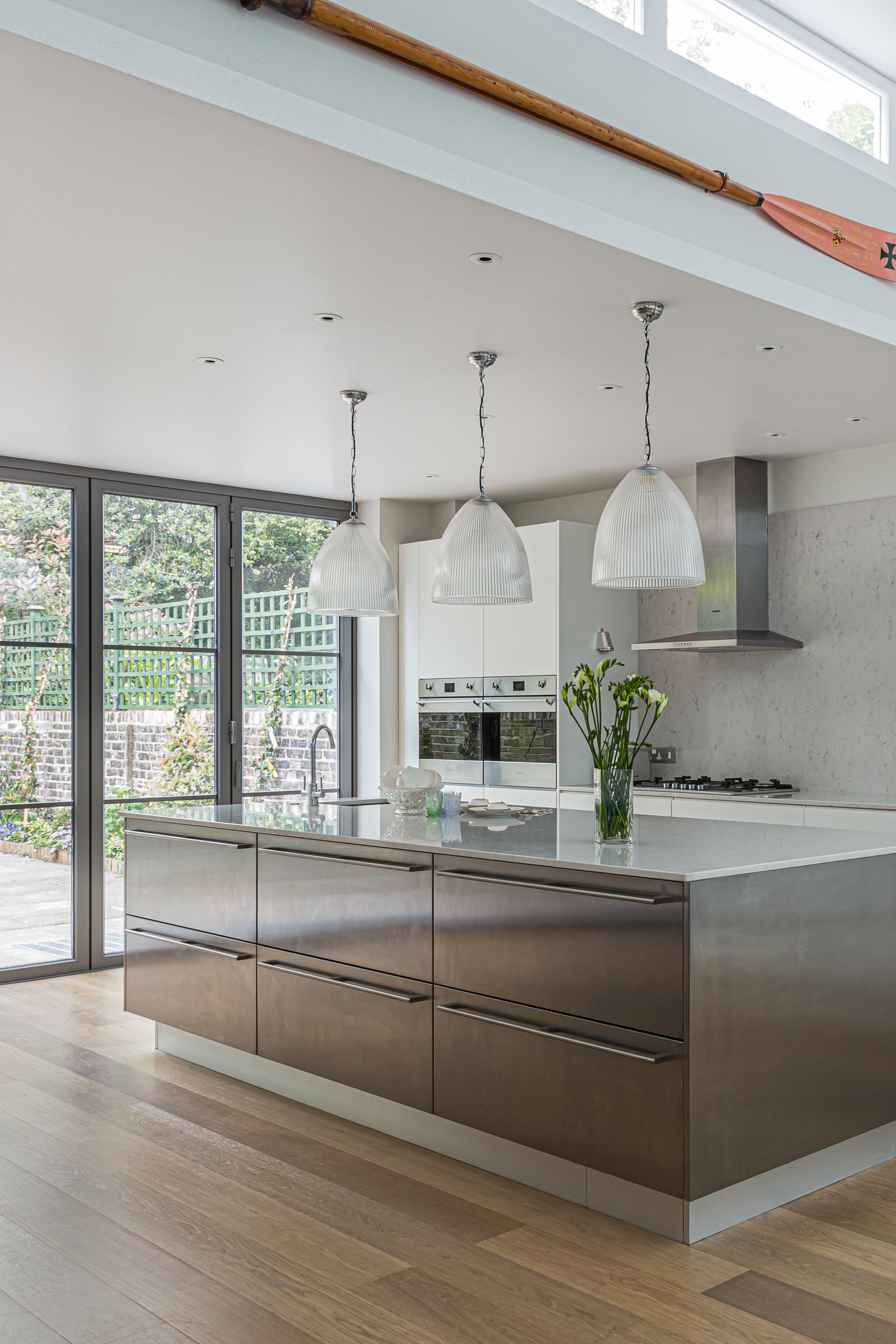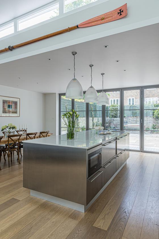 The clients wanted the kitchen to look contemporary and professional, with their favourite material, stainless steel, as the main focus of attention in their recently built, high-ceilinged rear extension, which is furnished for dining and relaxed seating, and which flows out through glazed bi-fold doors into the newly planted and paved garden.