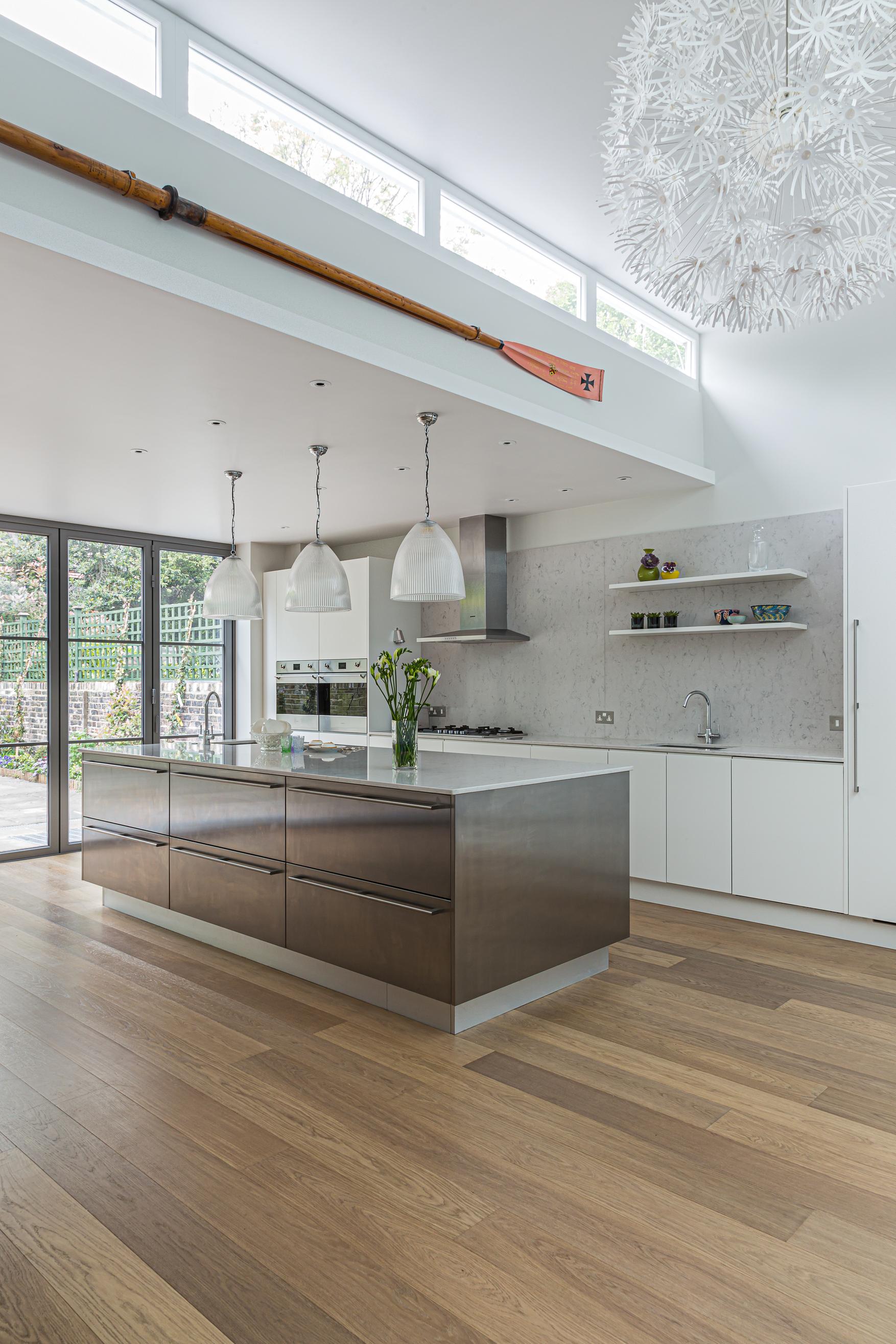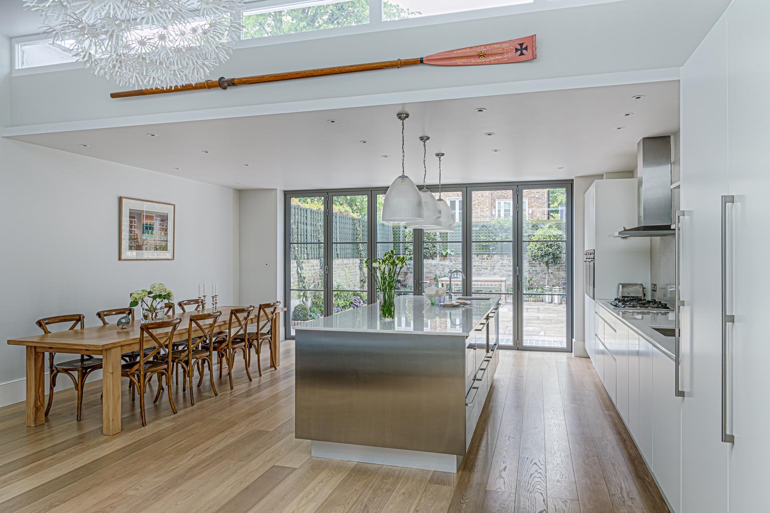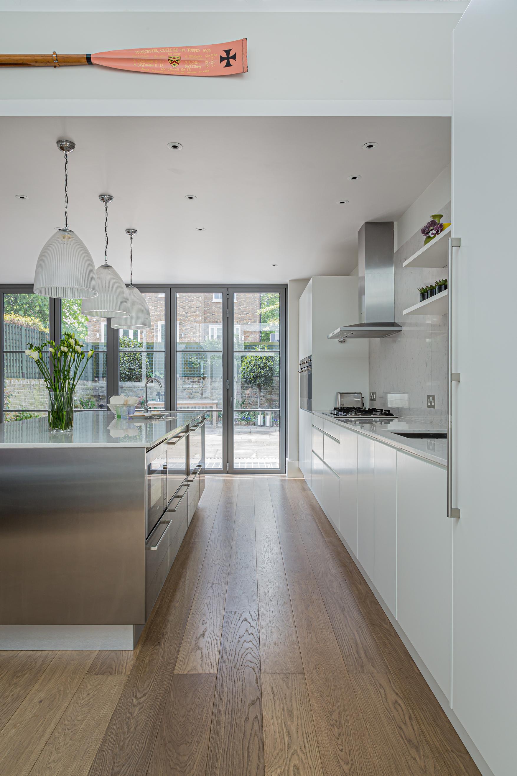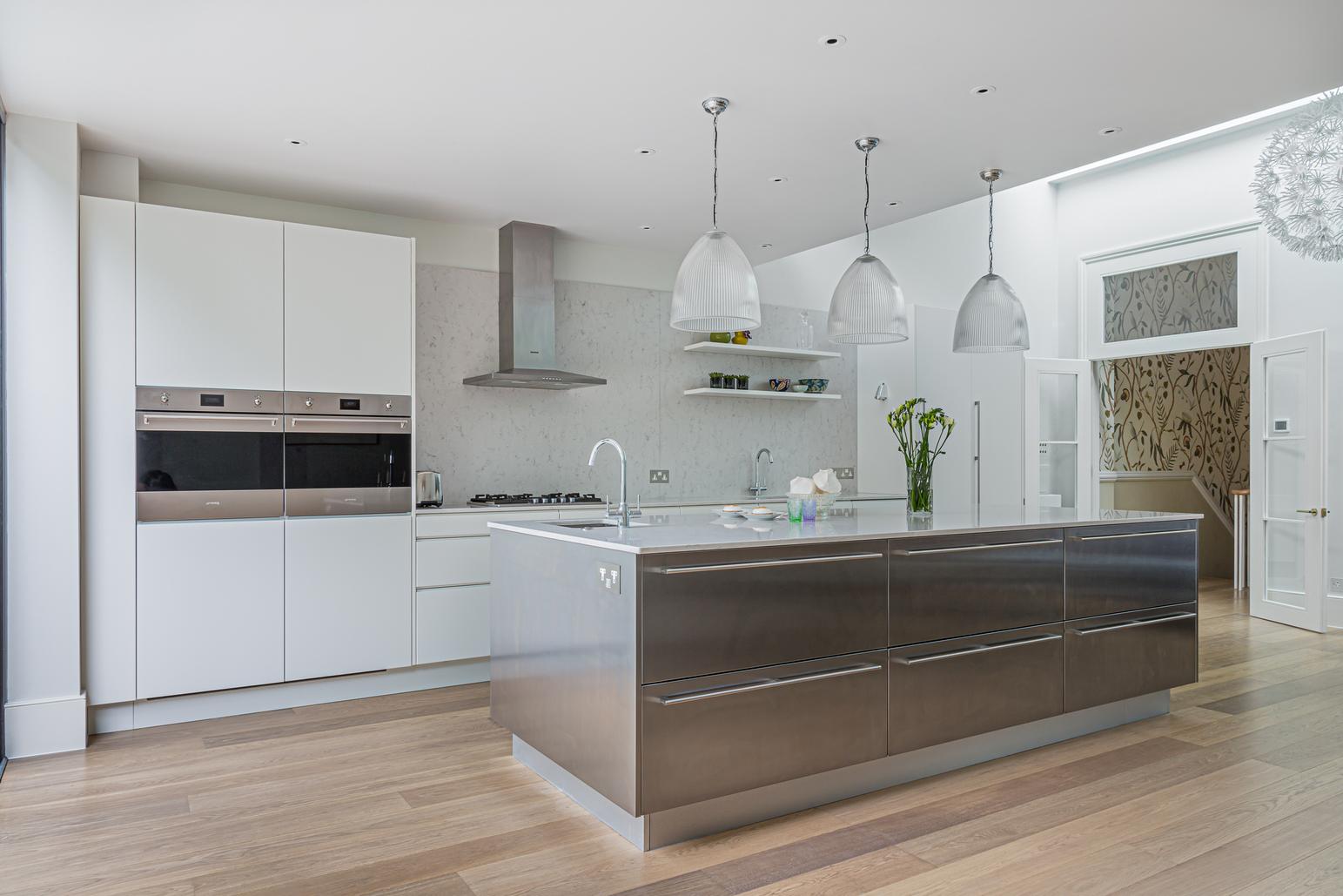 The clients wanted the kitchen to look contemporary and professional, with their favourite material, stainless steel, as the main focus of attention in their recently built, high-ceilinged rear extension, which is furnished for dining and relaxed seating, and which flows out through glazed bi-fold doors into the newly planted and paved garden.