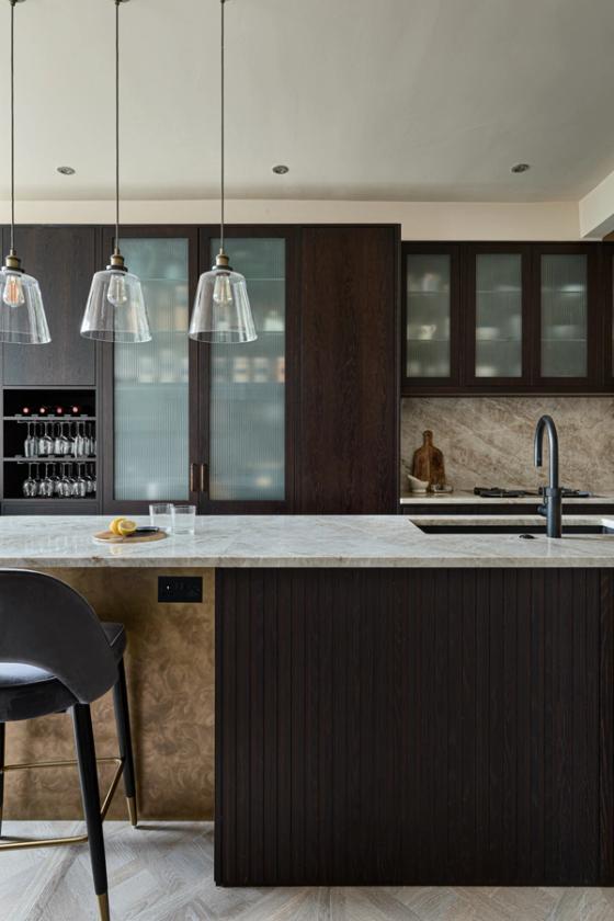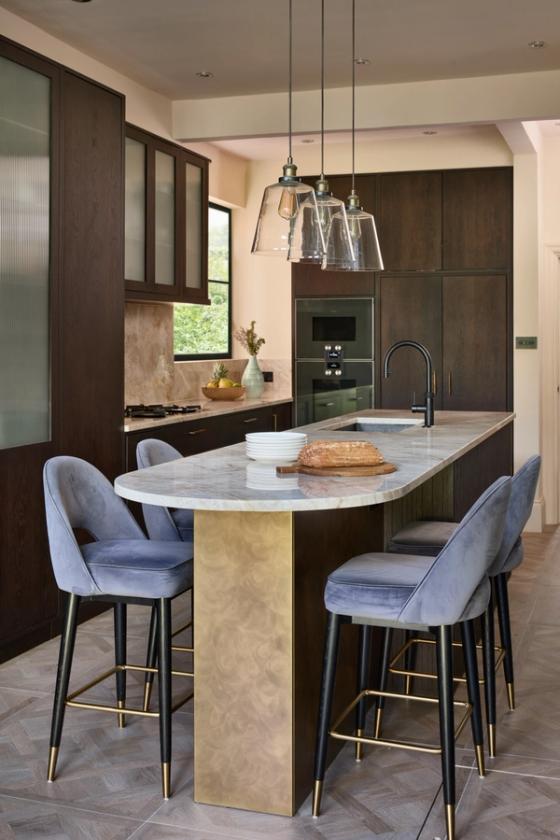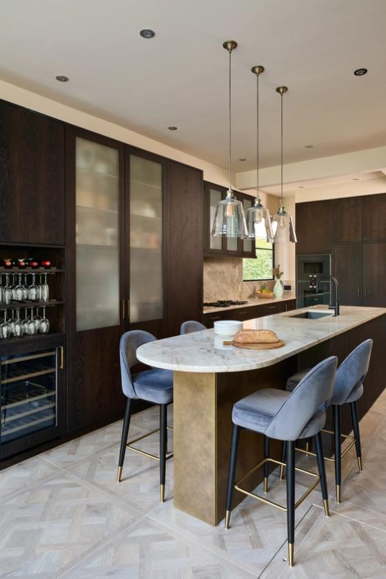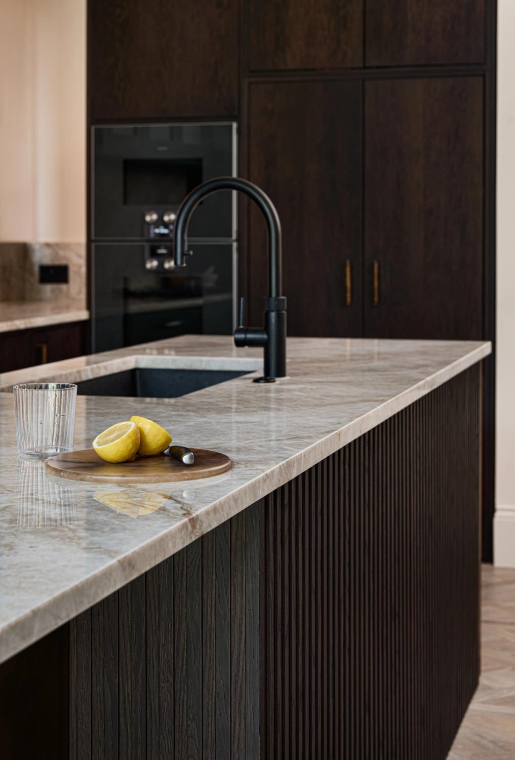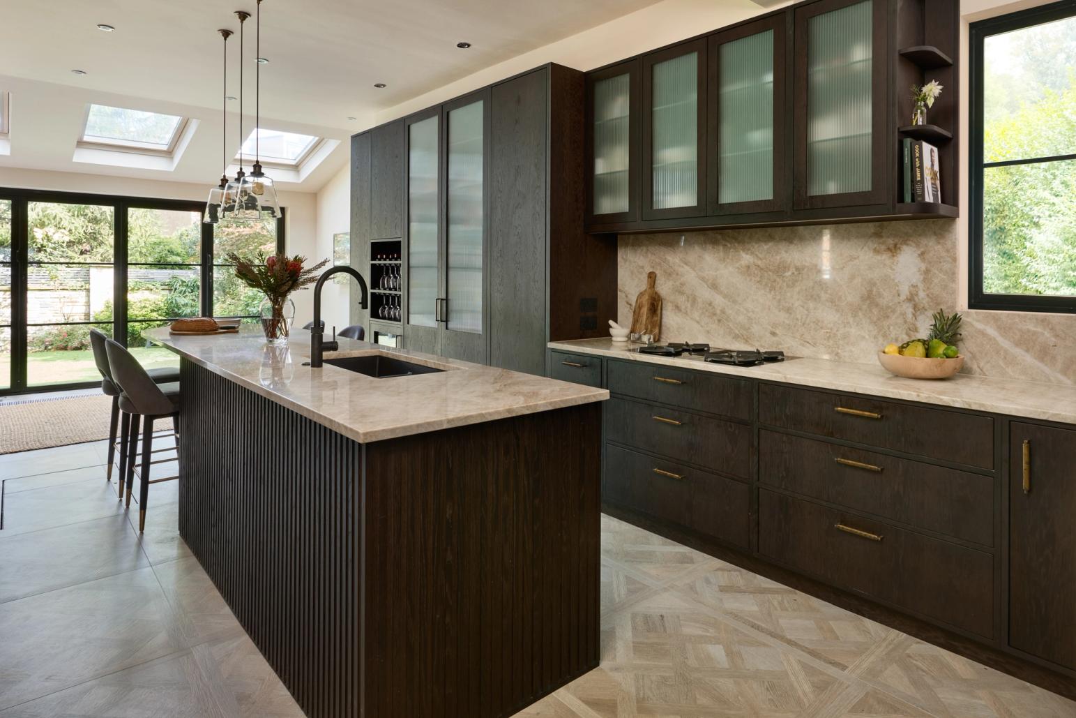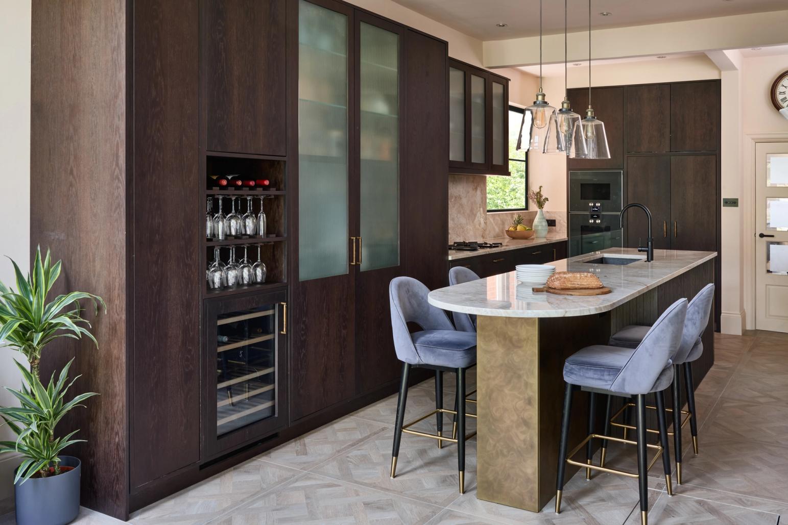 To build rich, tactile layers of contrast into the room, the natural tones of smoked oak (oiled to darken it without blocking out the grain) and creamy gold-brown veined Taj Mahal quartz are used instead of a classic painted black and white monochrome palette. Frosted and reeded glass-fronted cabinets, meanwhile, are inserted into the run of wall cabinets to make the volume of dark wood look less overpowering. Finally, to give the room an impressive Wow! factor, the slim slats of Skog-style cabinetry add a bold layer of texture to the base of the island at one end while, beneath the breakfast bar at the opposite end, which is rounded to seat six, the base is encased in sheets of antiqued brass.