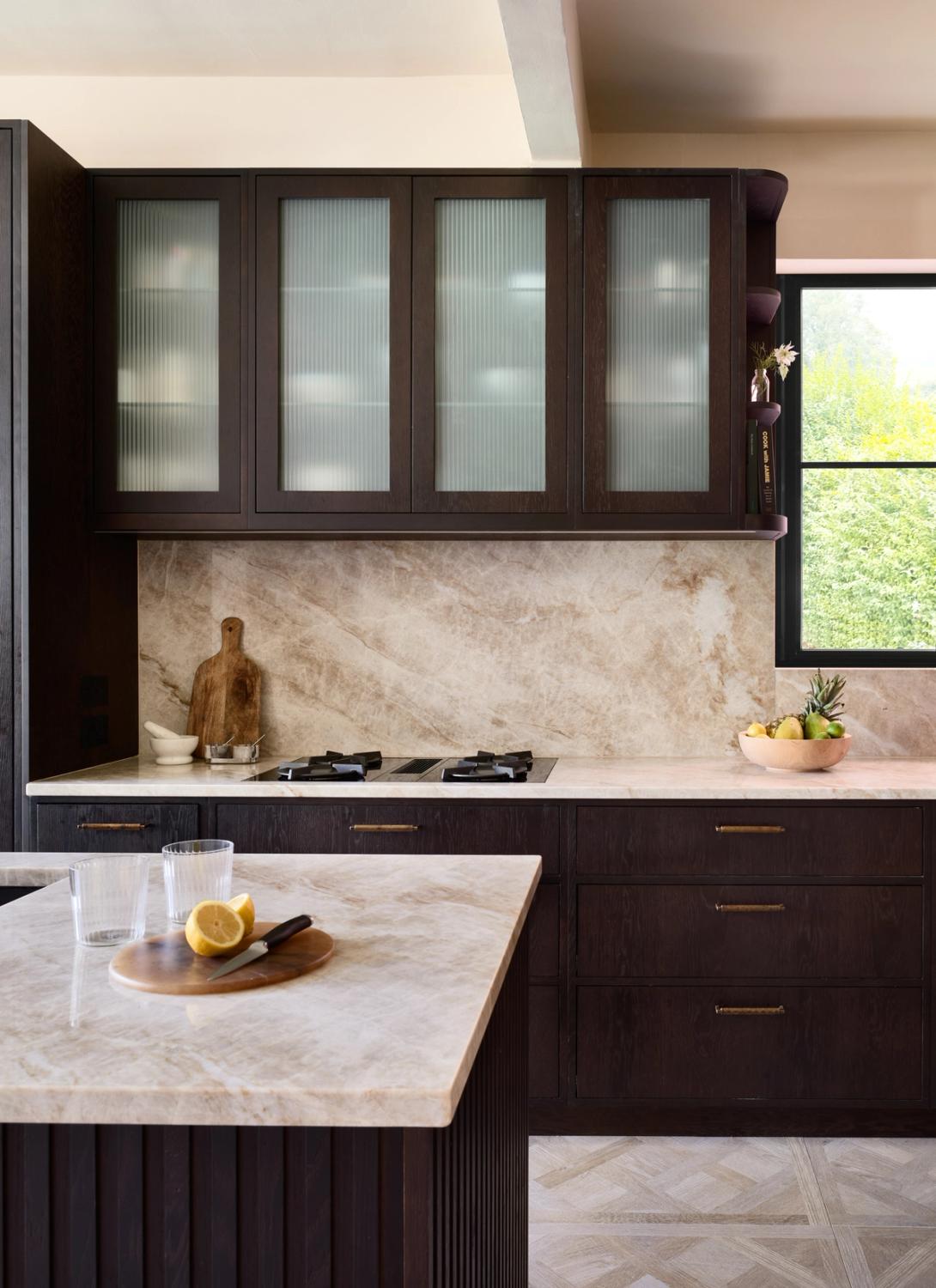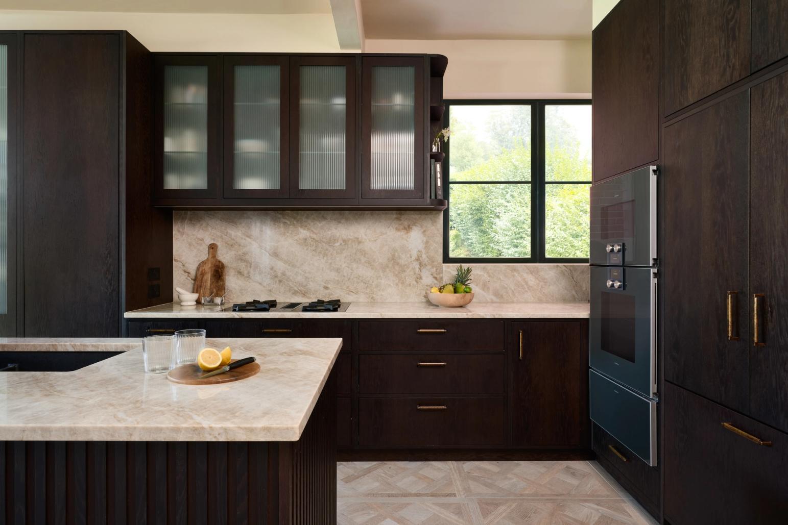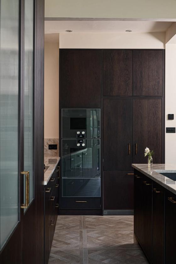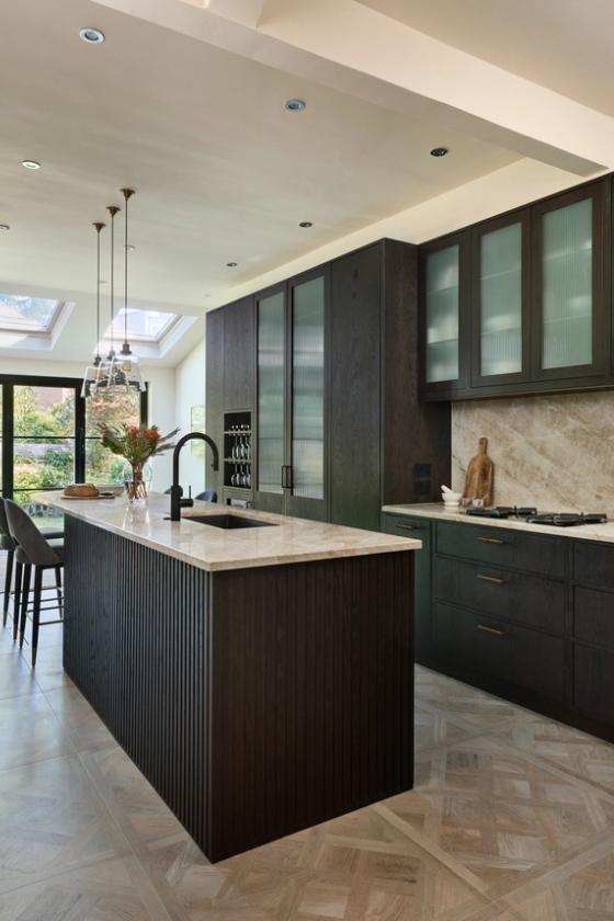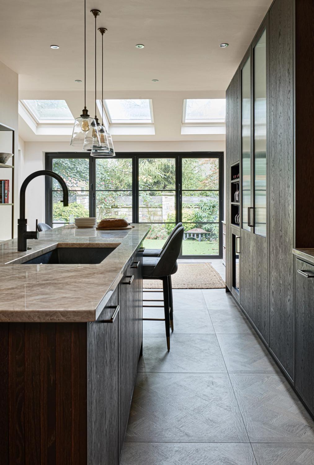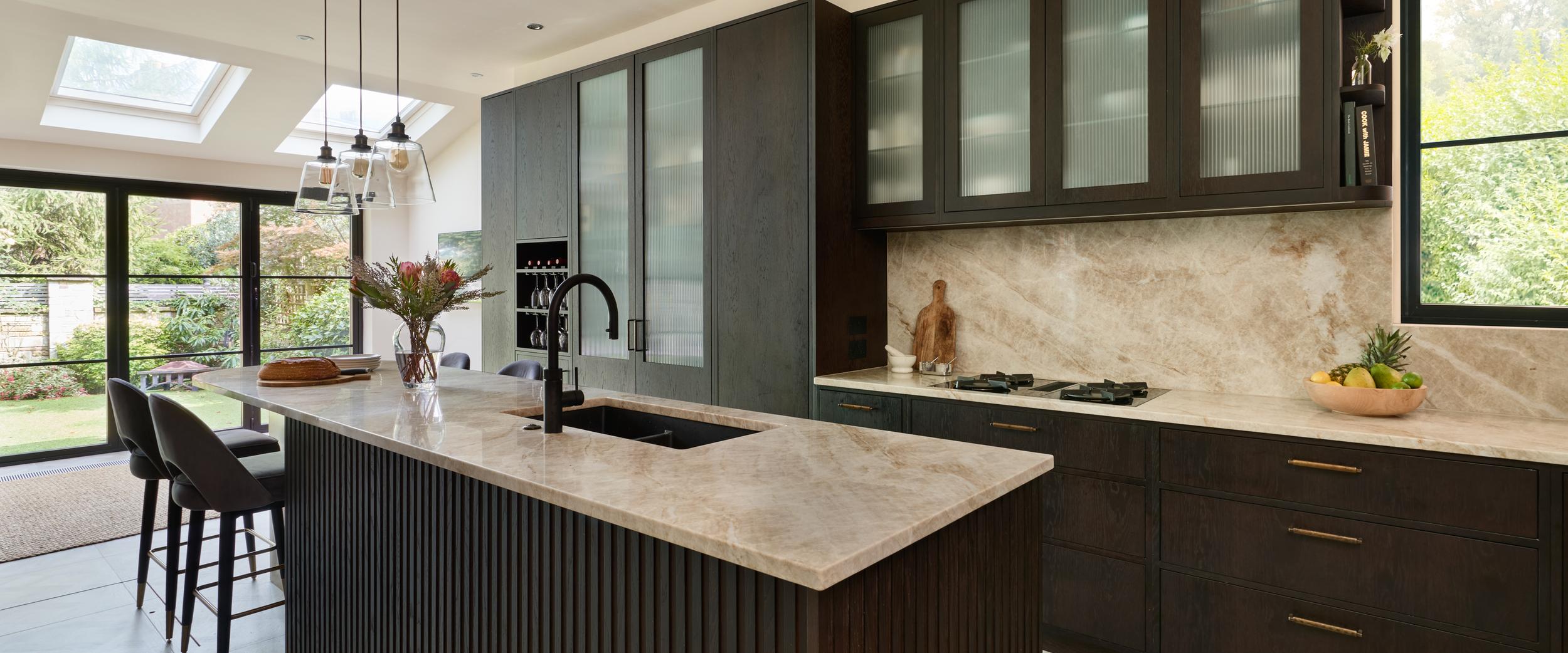 To build rich, tactile layers of contrast into the room, the natural tones of smoked oak (oiled to darken it without blocking out the grain) and creamy gold-brown veined Taj Mahal quartz are used instead of a classic painted black and white monochrome palette. Frosted and reeded glass-fronted cabinets, meanwhile, are inserted into the run of wall cabinets to make the volume of dark wood look less overpowering. Finally, to give the room an impressive Wow! factor, the slim slats of Skog-style cabinetry add a bold layer of texture to the base of the island at one end while, beneath the breakfast bar at the opposite end, which is rounded to seat six, the base is encased in sheets of antiqued brass.