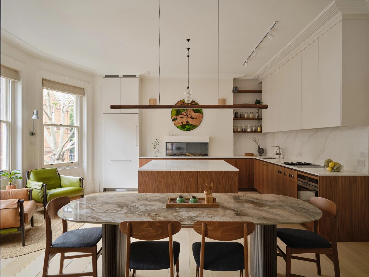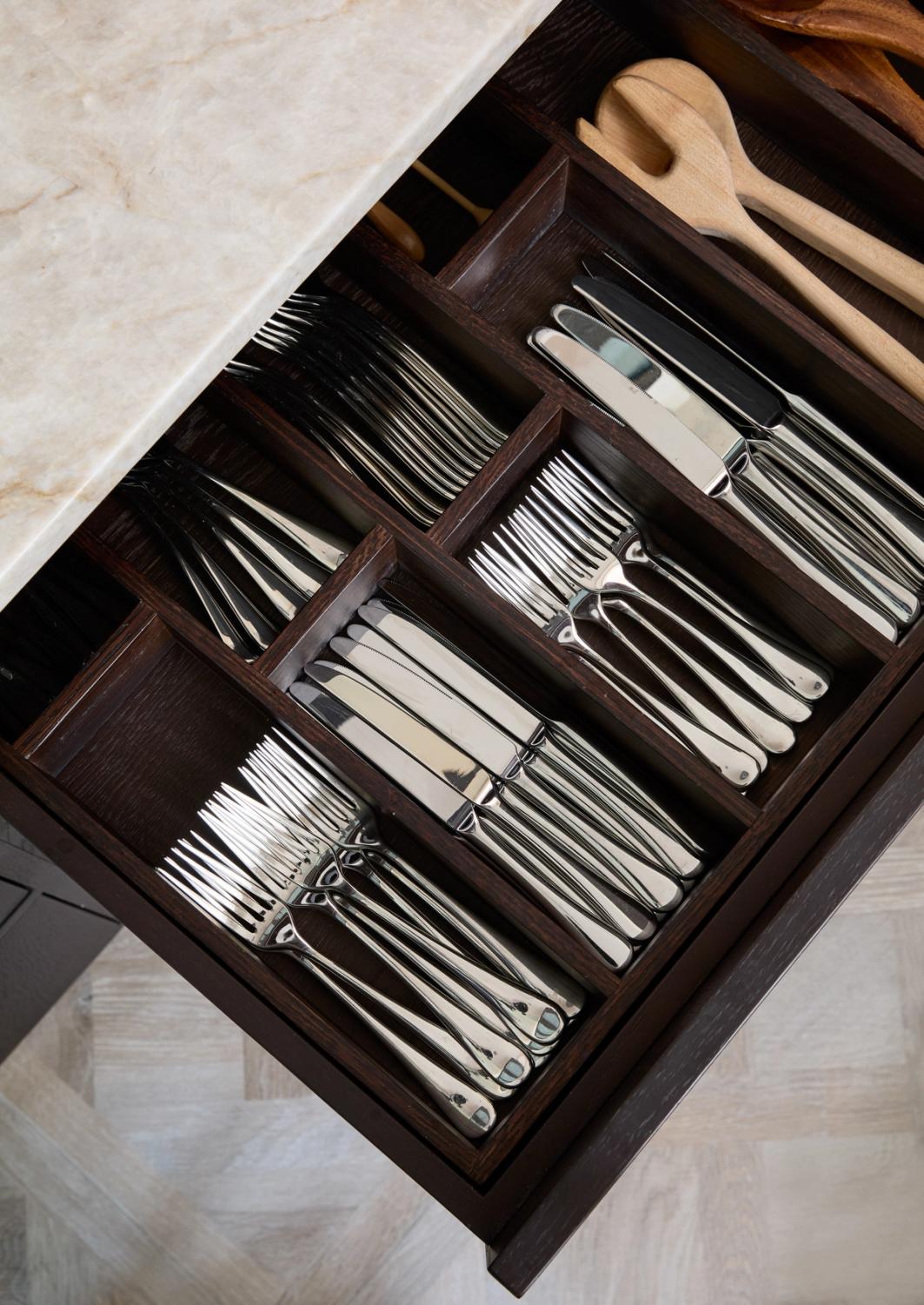 Clean and tidy: The cabinetry dimensions were meticulously planned to conceal all extraction and cooling systems, as well as the pipework and extension pillars, without sacrificing internal storage or disrupting the overall symmetry of the design. To create space for a dedicated utility cupboard within the wall run closest to the garden, the boiler was relocated from the kitchen to the basement — a practical adjustment that allowed the layout to remain both functional and beautifully balanced.