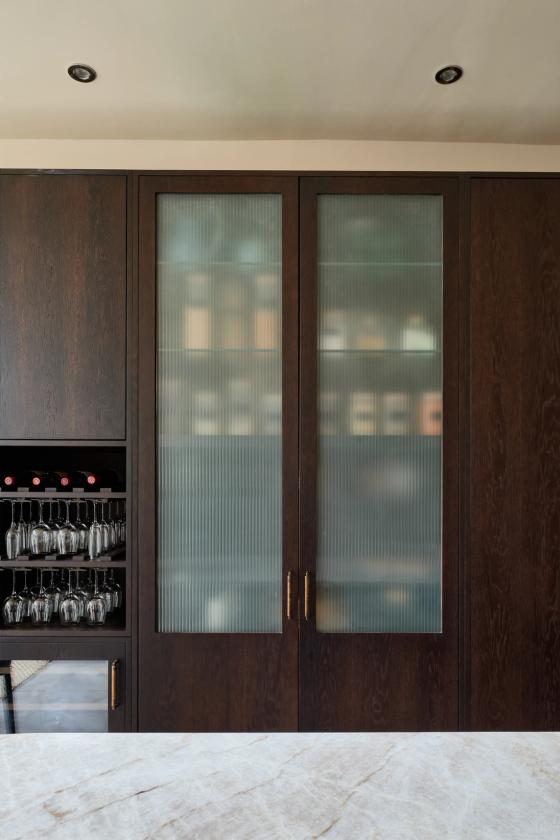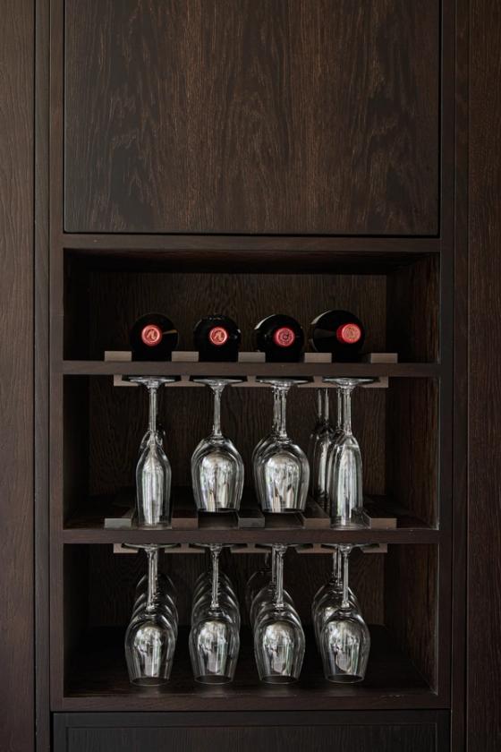 An open cabinet set at eye level, fitted with bespoke racks for wine glasses, and a wine cooler beneath, is built into the far end of the wall cabinetry, conveniently close at hand for entertaining and away from the busy food preparation and cooking areas.