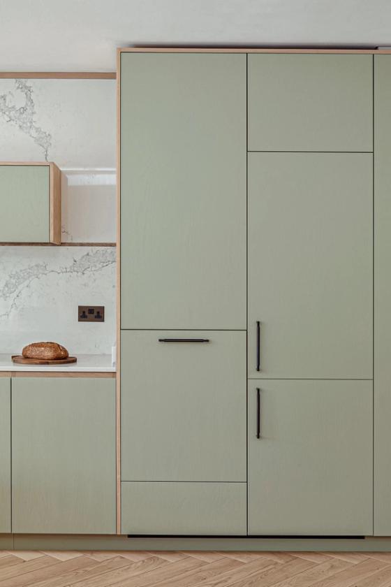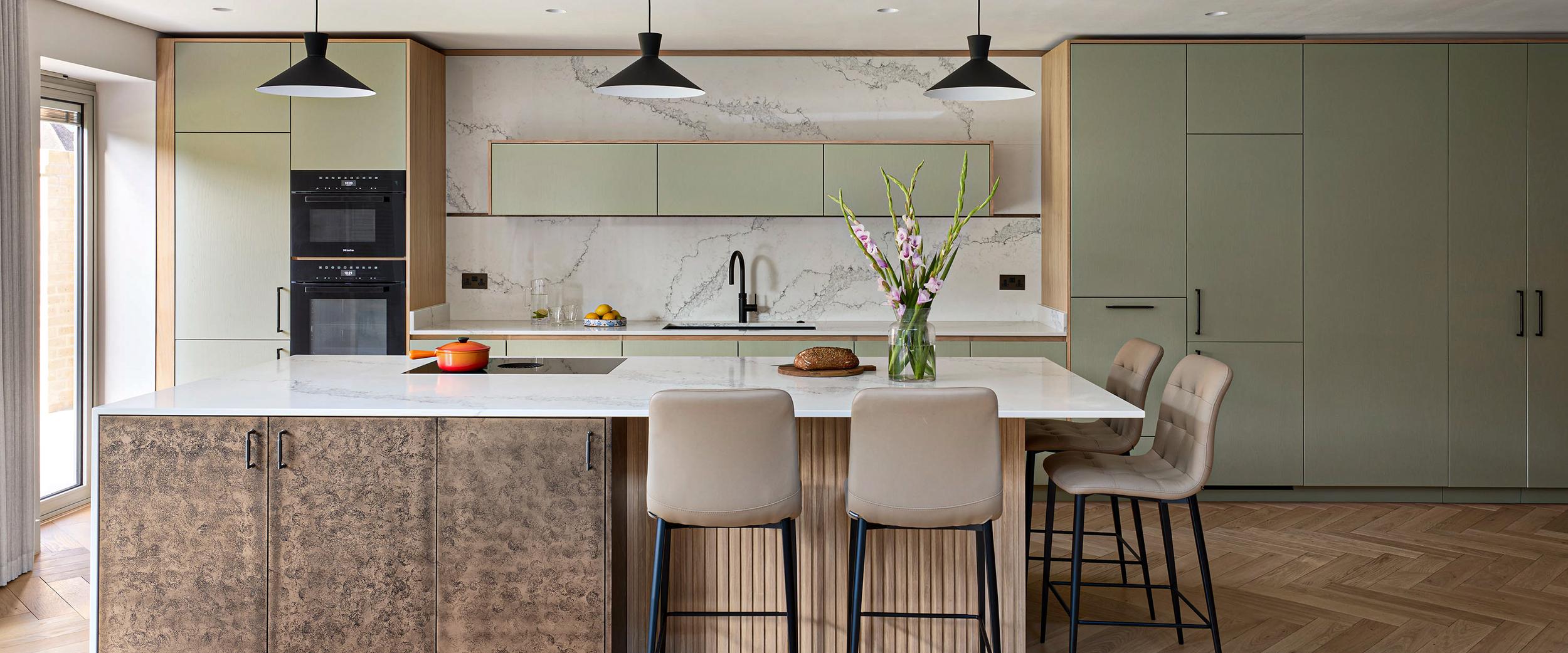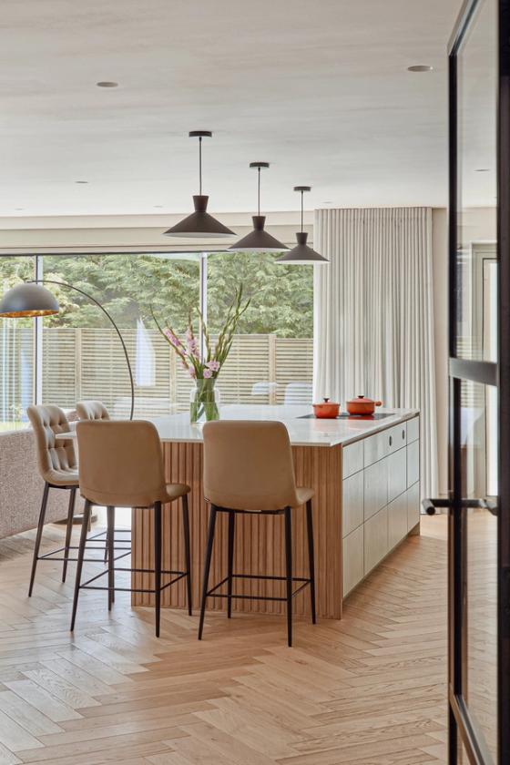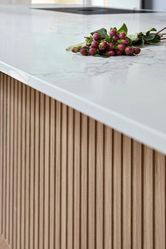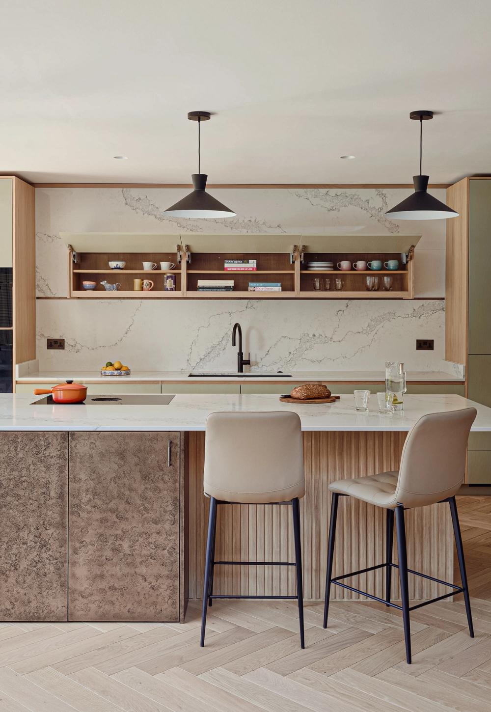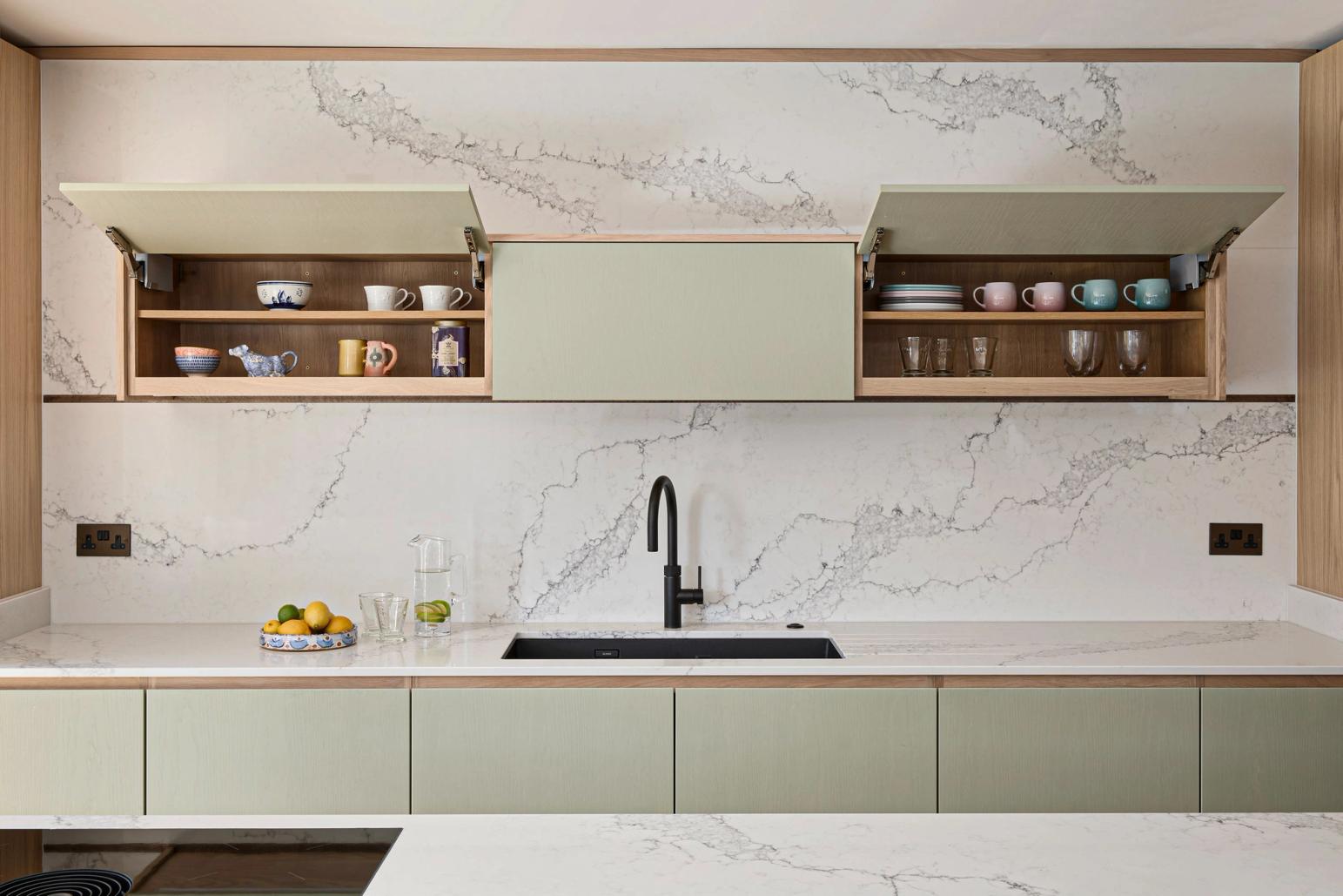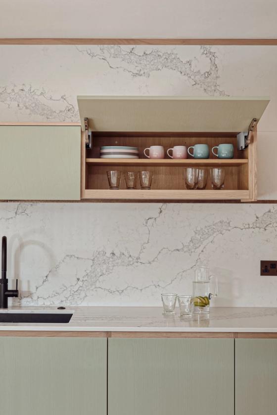 An eye on the future: doors are easy to open, every appliance is at eye level, and even the dishwasher is lifted 45cm off the floor, so no bending of knees is required. The same applies to the pull-out drawers that are fitted inside the cabinets; there is even an inner drawer within one of the island drawers which the client can use as a desk drawer for post and light admin. The quartz worktop is stain-resistant but beautiful and set just over the standard height to accommodate the clients' height.