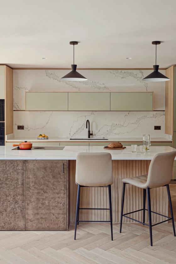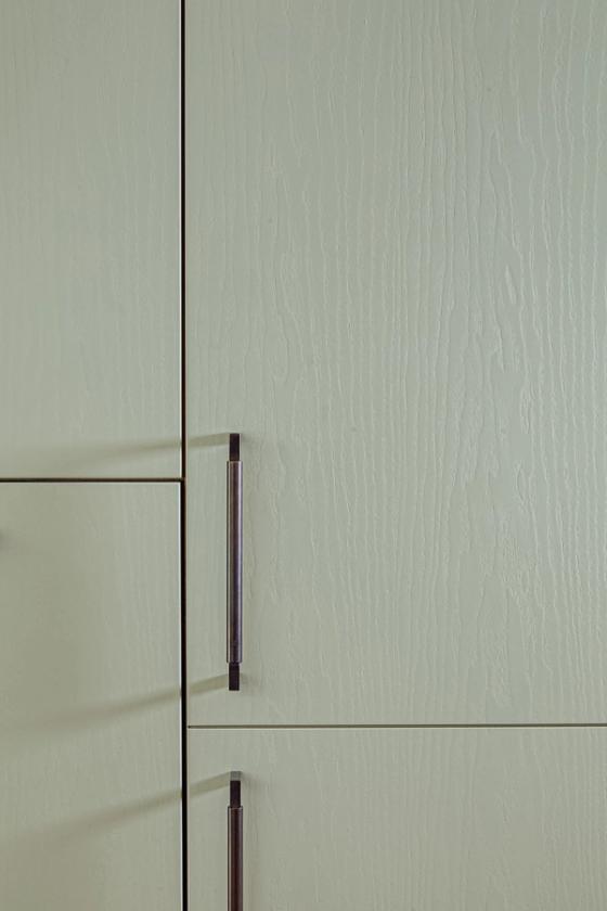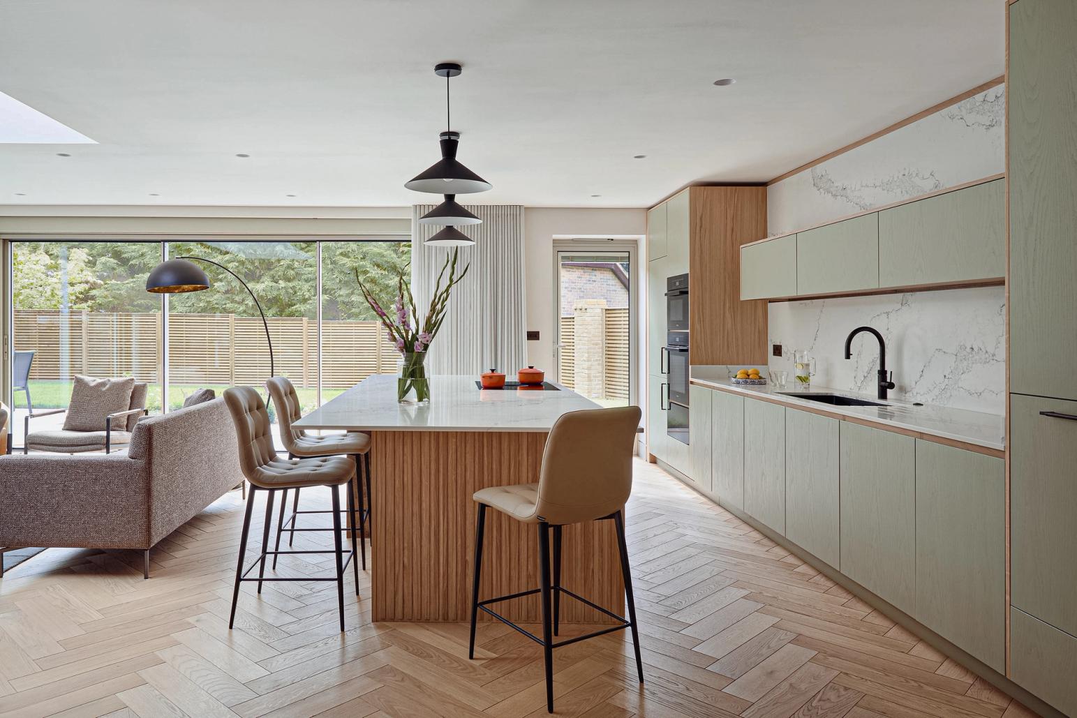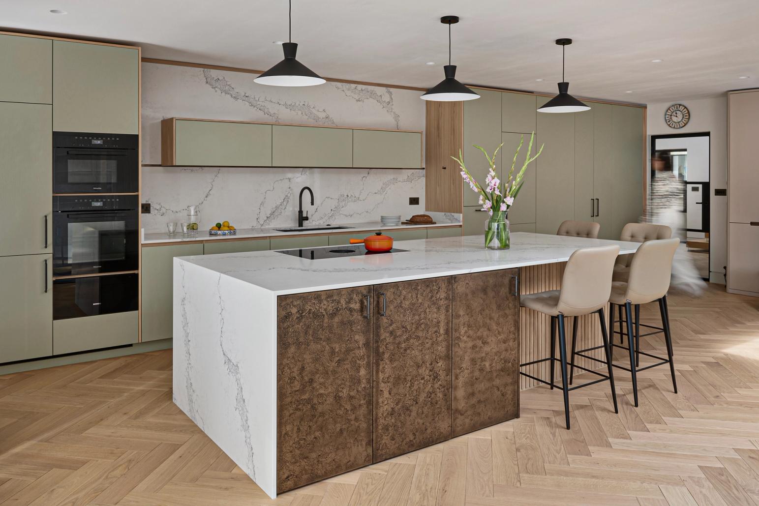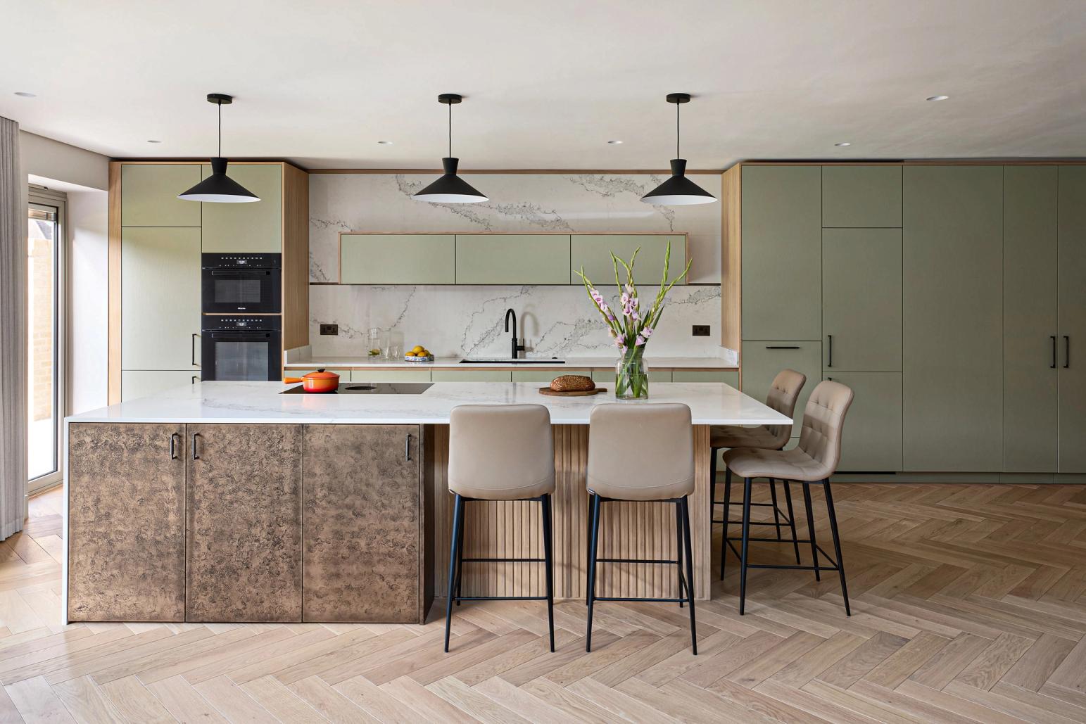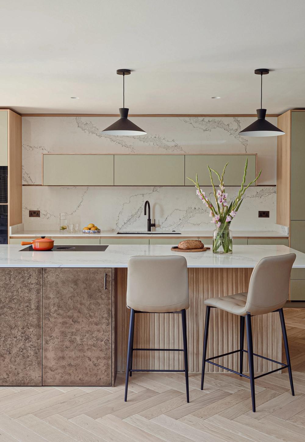 An eye on the future: doors are easy to open, every appliance is at eye level, and even the dishwasher is lifted 45cm off the floor, so no bending of knees is required. The same applies to the pull-out drawers that are fitted inside the cabinets; there is even an inner drawer within one of the island drawers which the client can use as a desk drawer for post and light admin. The quartz worktop is stain-resistant but beautiful and set just over the standard height to accommodate the clients' height.