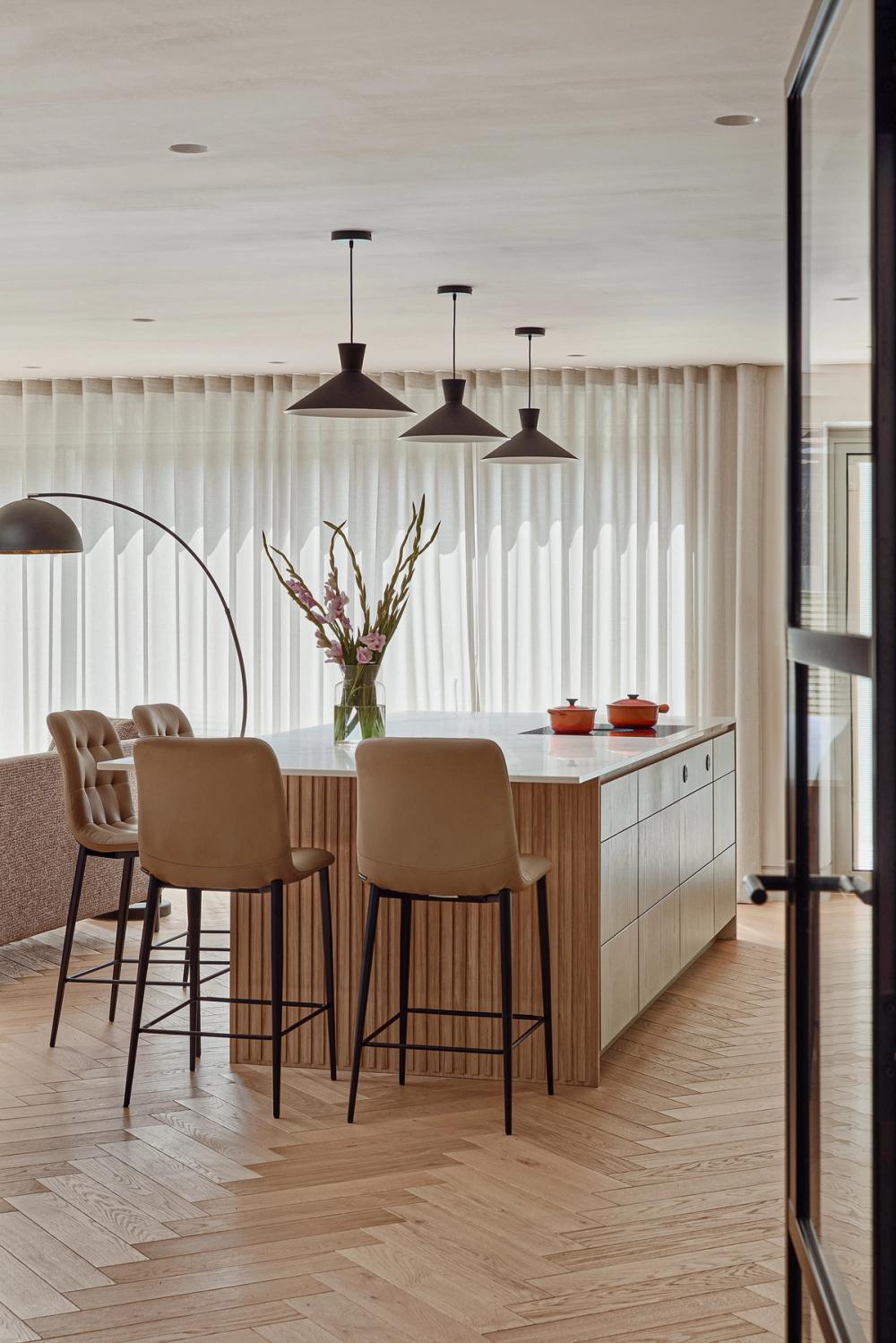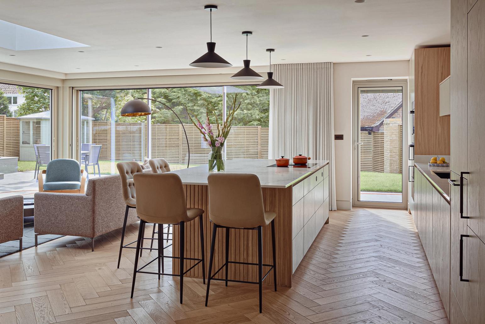 The designer's solution incorporates a long run of flat-fronted cabinetry along the vast wall space, housing the fridge-freezer, dishwasher, ovens, and sink, with a walk-in pantry concealed at one end. To enhance the room's height and create a striking focal point behind the island, three floating overhead cabinets for glassware are positioned at head height in the middle of the splashback, leaving clear space around them. The natural oak of the carcasses is left on show at either end of these cabinets, and on the side reveals of the tall cabinetry, connected by a recessed strip of aged brass in the splashback, adding a refined decorative touch that complements the brass front of the island. This brass theme is echoed throughout the space, in details like the light switches, power sockets, door handles, and chair frames, tying the entire design together with subtle, cohesive elegance.
