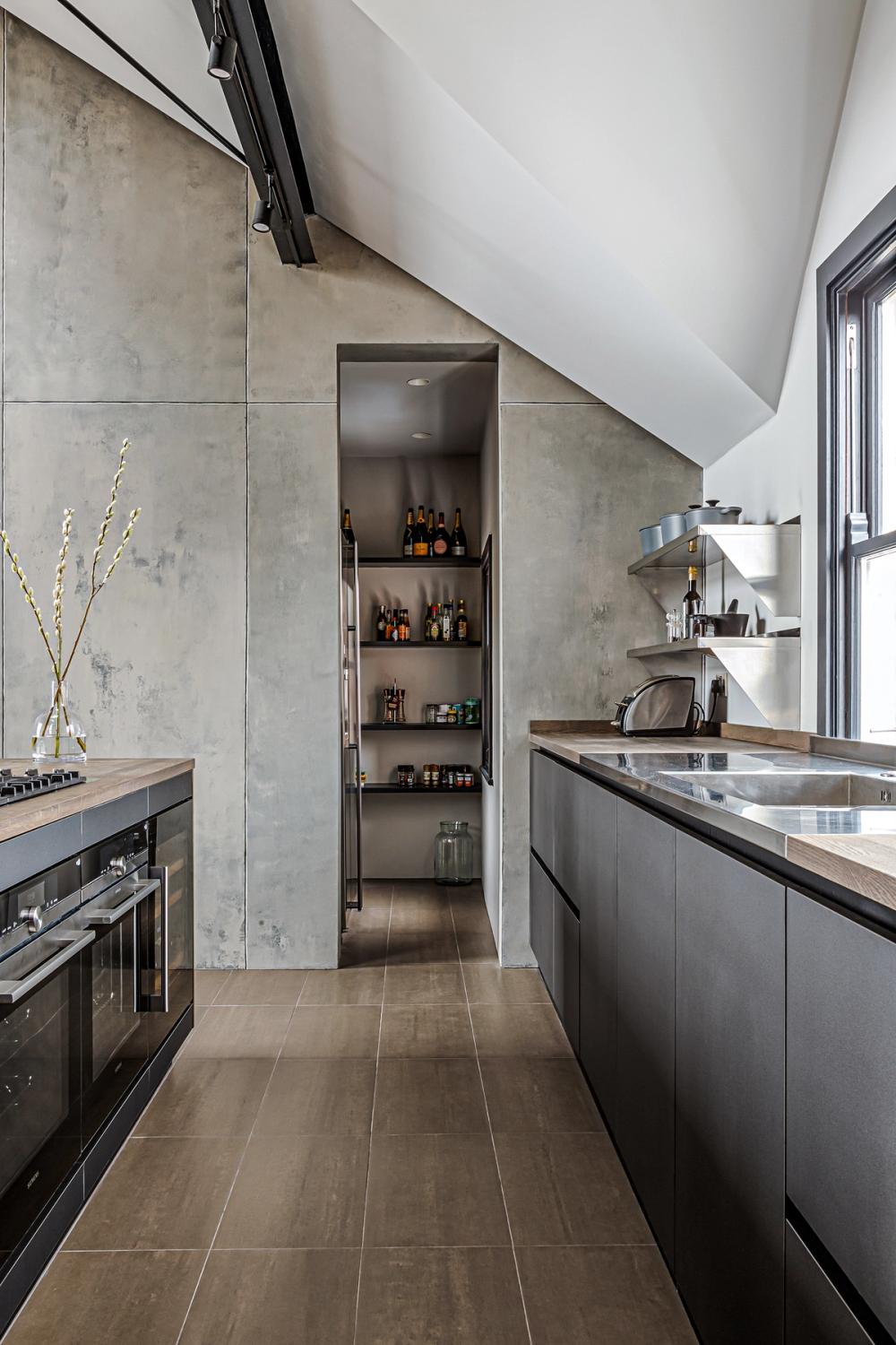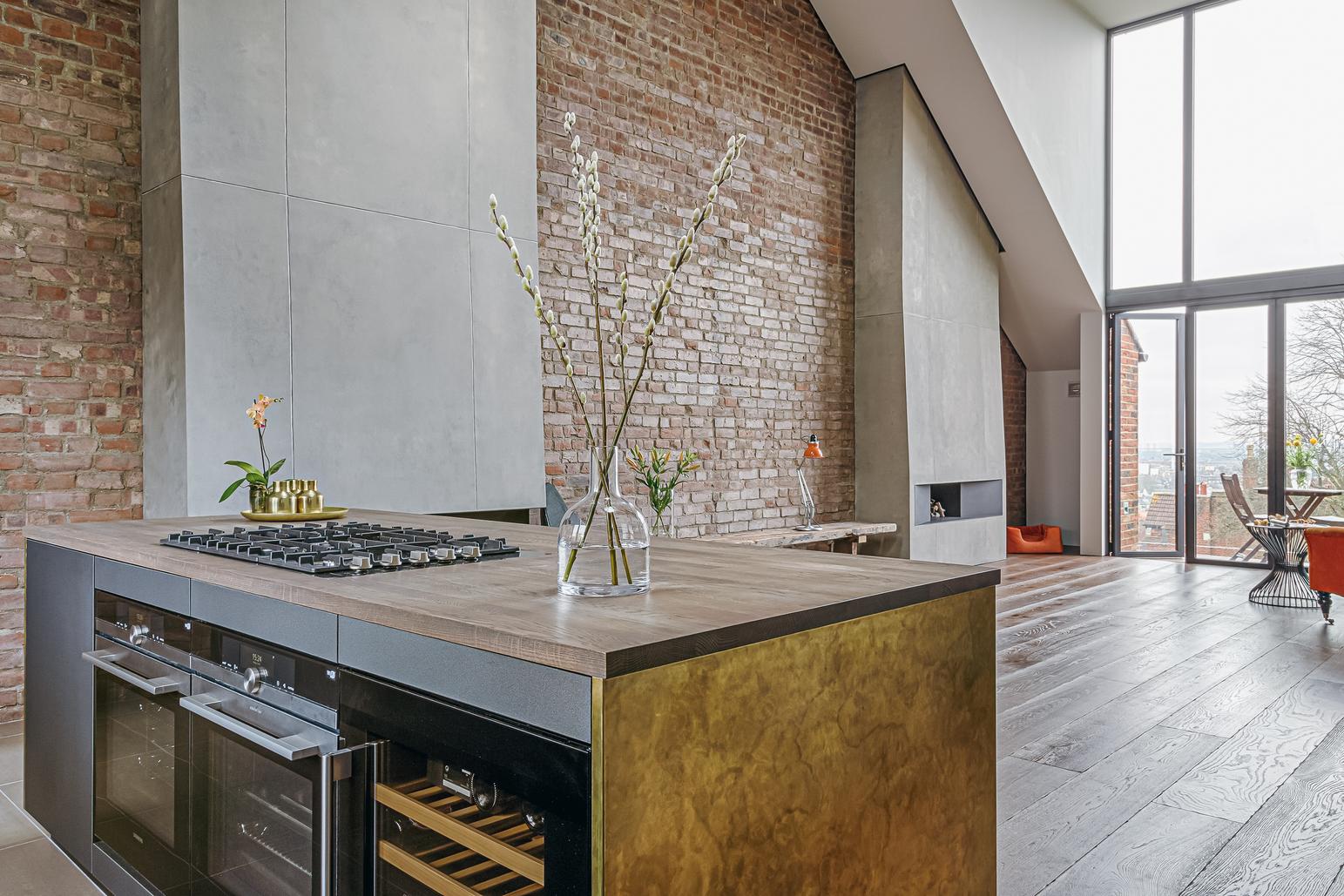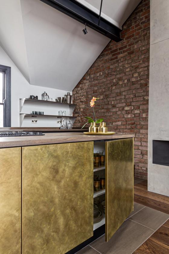 The clients were refurbishing their rooftop apartment themselves and had turned two rooms into a single, open-plan kitchen and living space. They wanted this new room to have an industrial New York vibe to make the most of the double-height ceiling and extensive views across London. They liked the idea of a burnished brass worksurface and wanted to have stainless steel and wood to offset the polished concrete effect on the chimney breasts. The couple entertains often so instead of having lots of storage in the kitchen, making the space look over-full, they were turning a small adjoining room into a walk-in pantry.