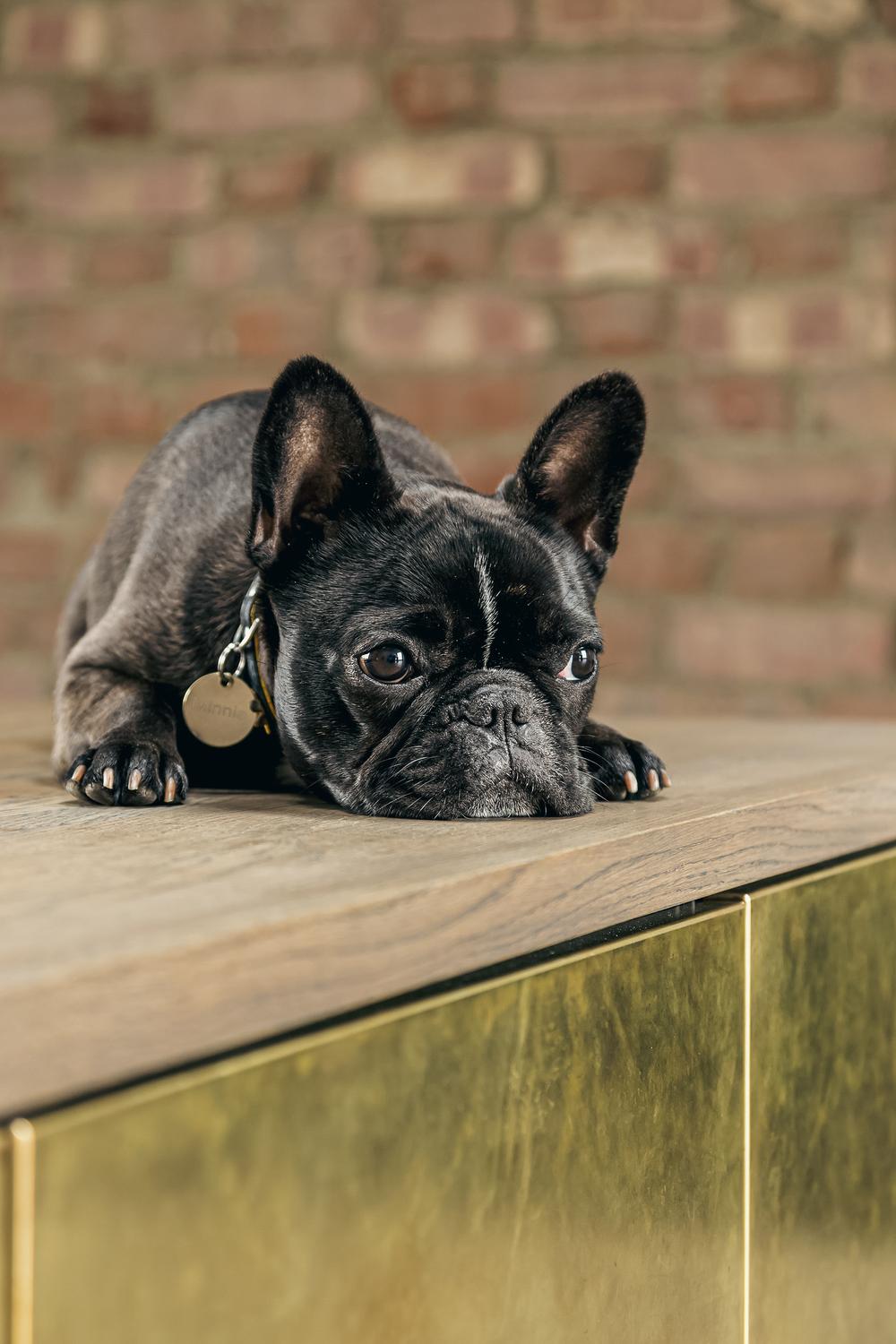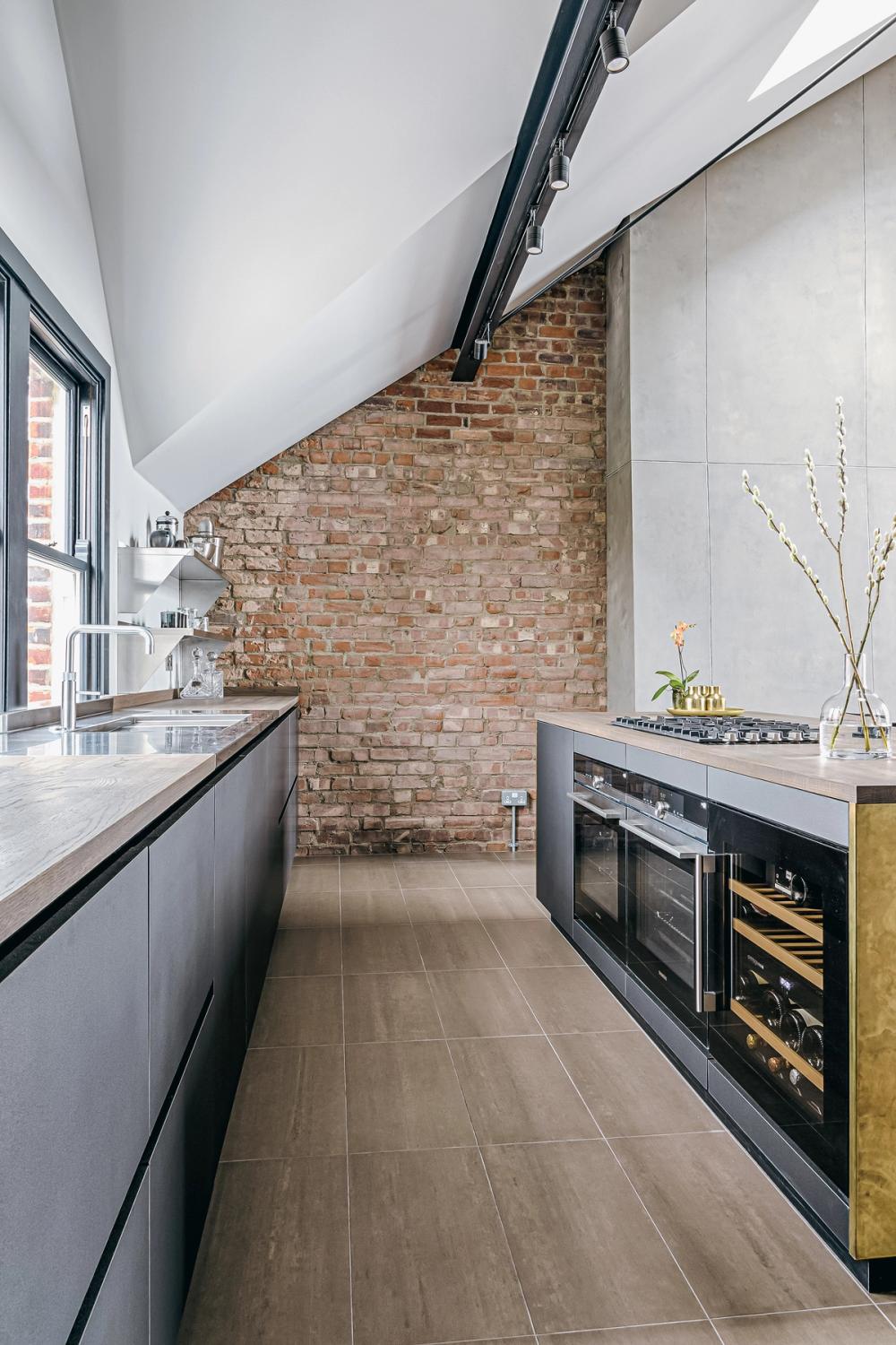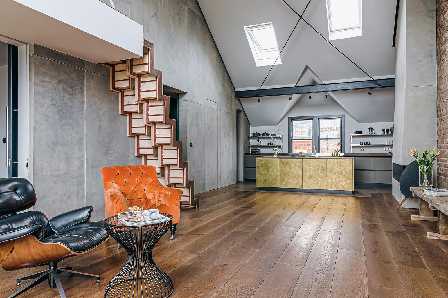 The clients were refurbishing their rooftop apartment themselves and had turned two rooms into a single, open-plan kitchen and living space. They wanted this new room to have an industrial New York vibe to make the most of the double-height ceiling and extensive views across London. They liked the idea of a burnished brass worksurface and wanted to have stainless steel and wood to offset the polished concrete effect on the chimney breasts. The couple entertains often so instead of having lots of storage in the kitchen, making the space look over-full, they were turning a small adjoining room into a walk-in pantry.