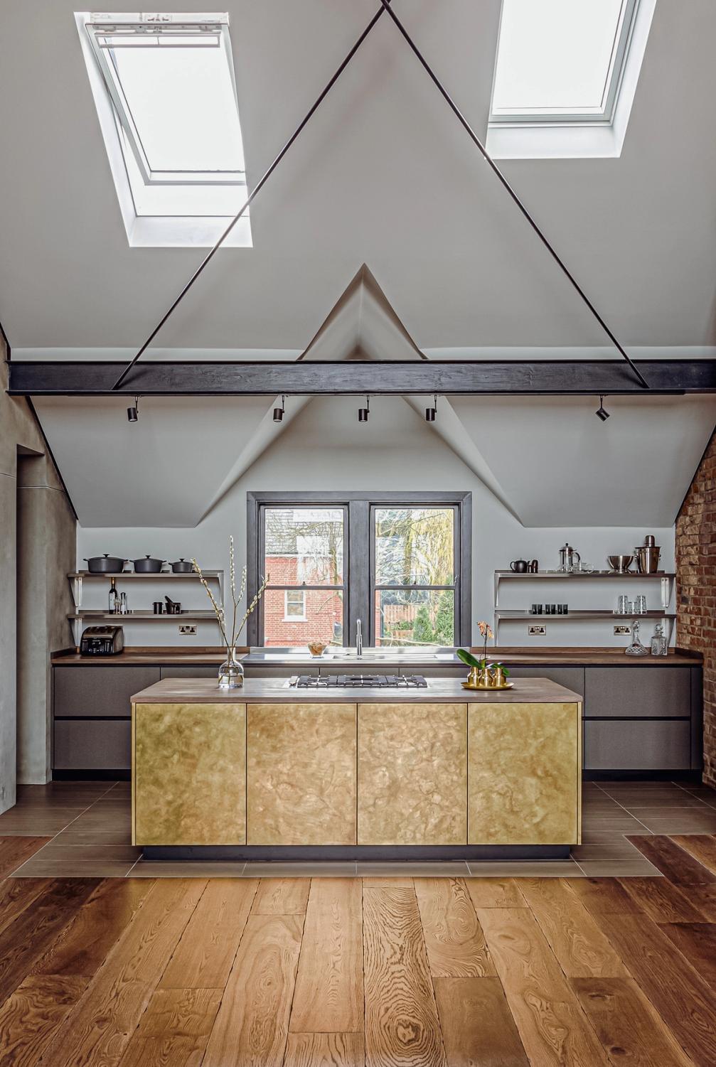 With its antiqued brass, stainless steel and matt painted finishes gently glowing in the light, this industrial-style kitchen in north London is a worthy award-winner.