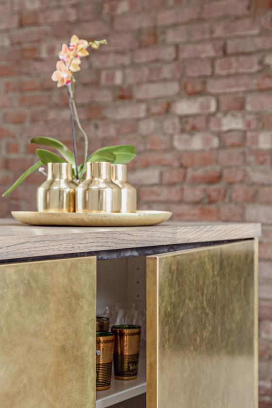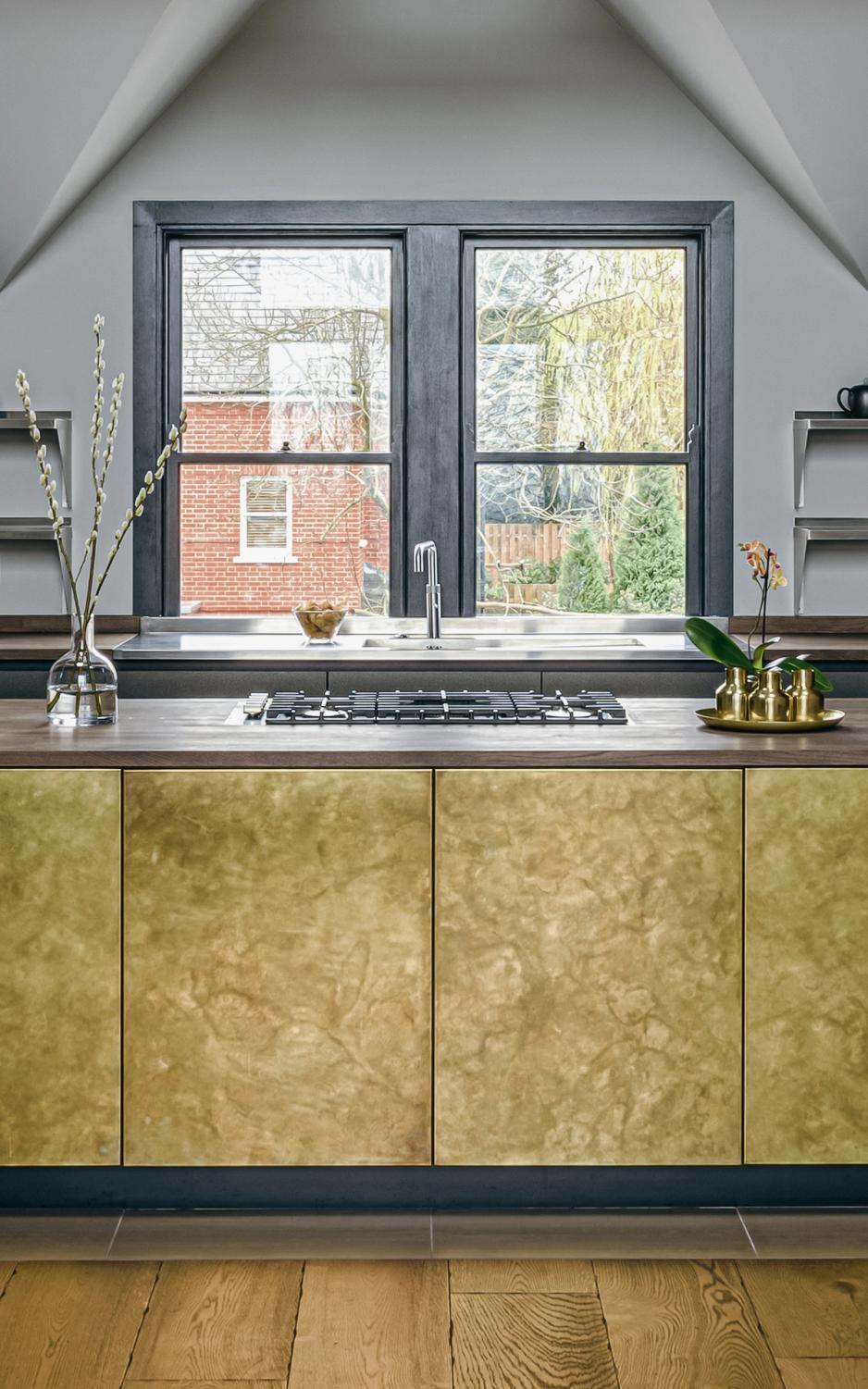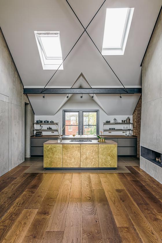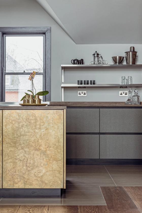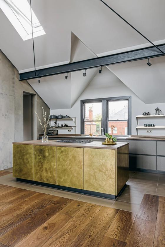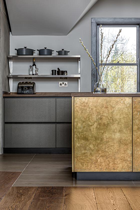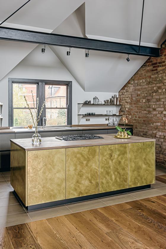 The designer's solution features a burnished brass-fronted island as the standout feature of the newly created double-height room. Behind it, dark grey laminated cabinets with black-stained oak frames provide a striking contrast, while a vintage-oiled solid oak work surface adds warmth and cohesion to the overall look. As the hand-etched and sealed brass isn't suitable as a kitchen work surface, it elegantly wraps around the island's frontispieces instead. Positioned on a black plinth to create a floating effect and set against the dark, ultra-matt laminate backdrop, the island radiates a warm glow in the room's natural light.