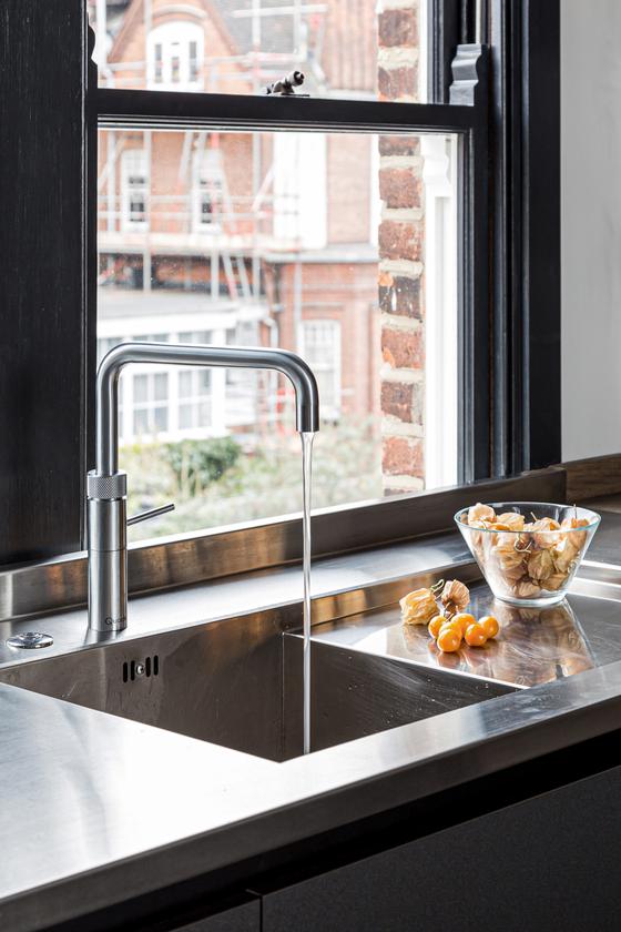 Practical beauty: the extra deep moulded stainless steel double sink is surrounded by a matching stainless steel worktop, and to protect the wall surface, a sliver of vintage-oiled oak protects the wall surface.