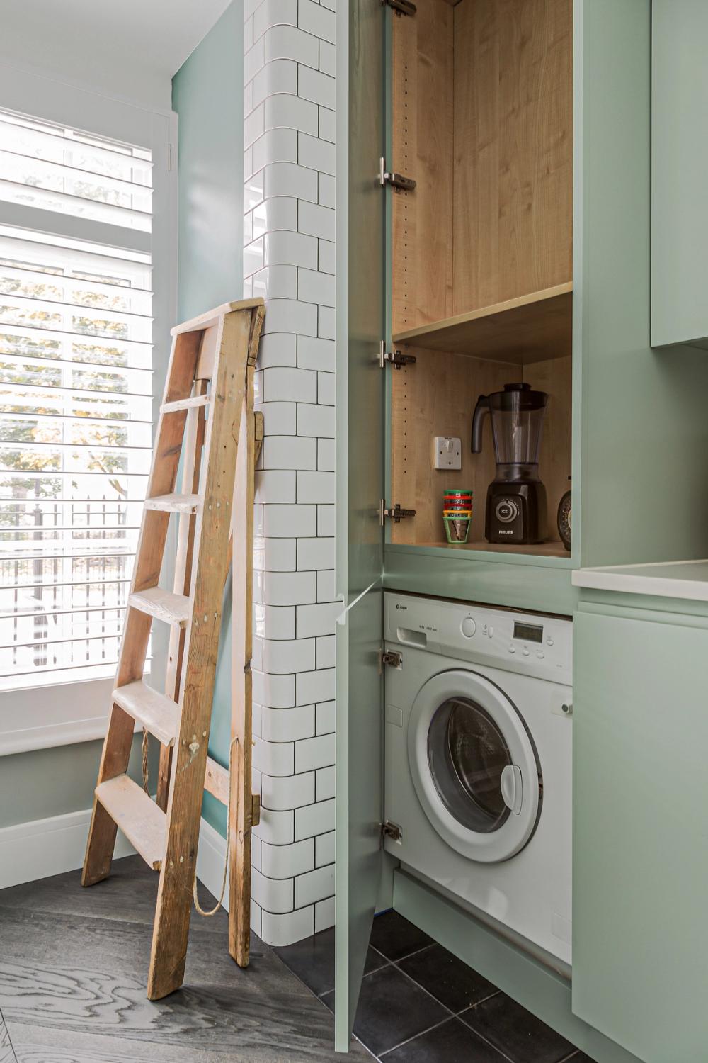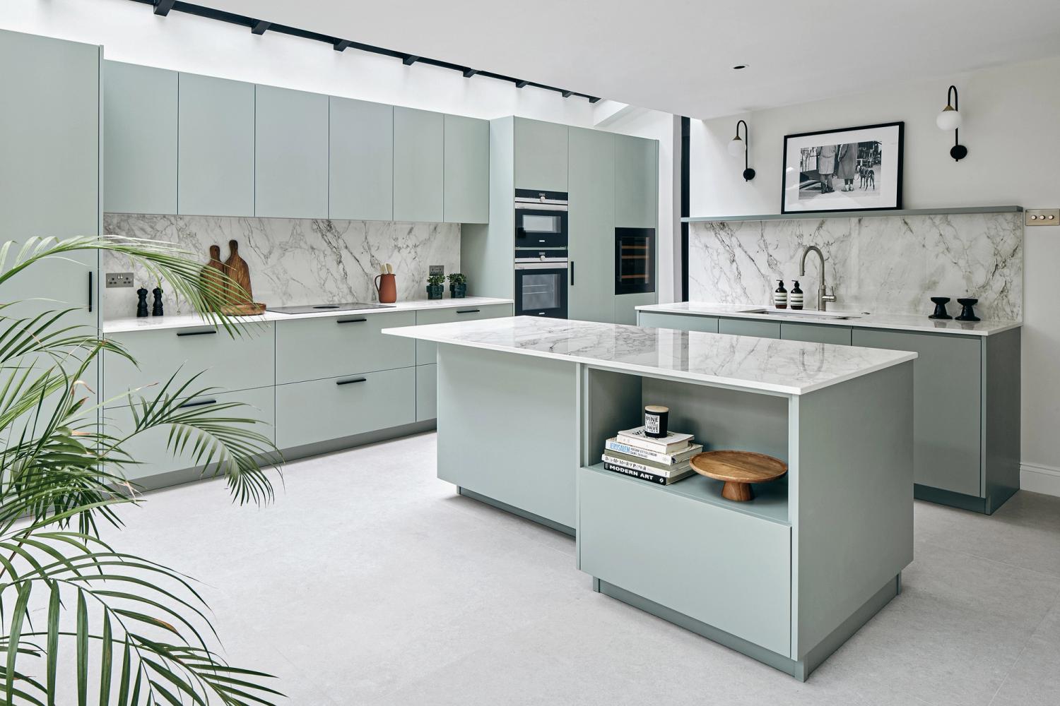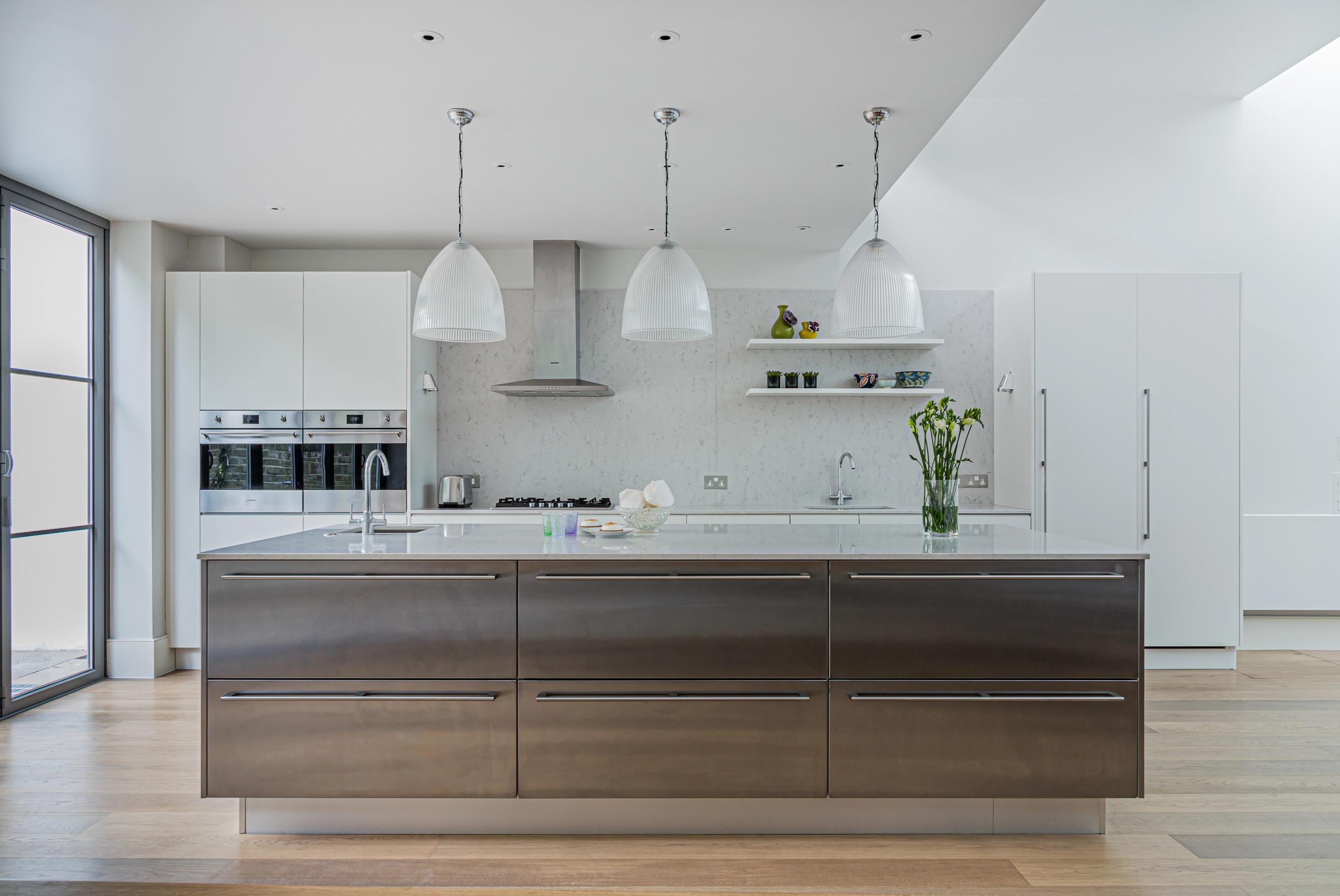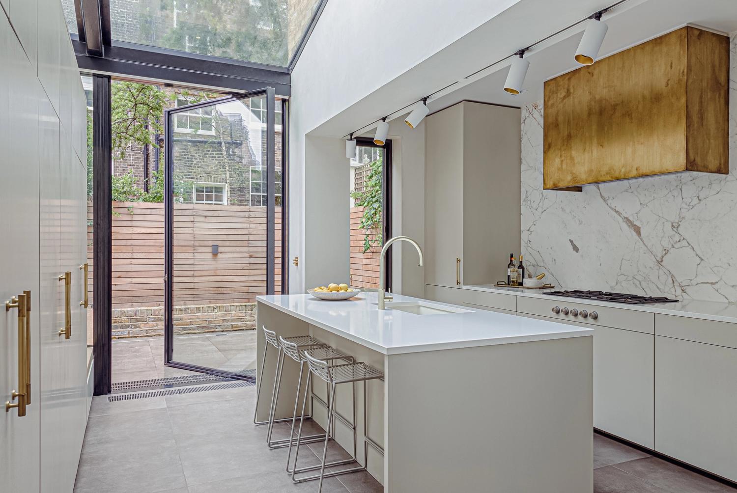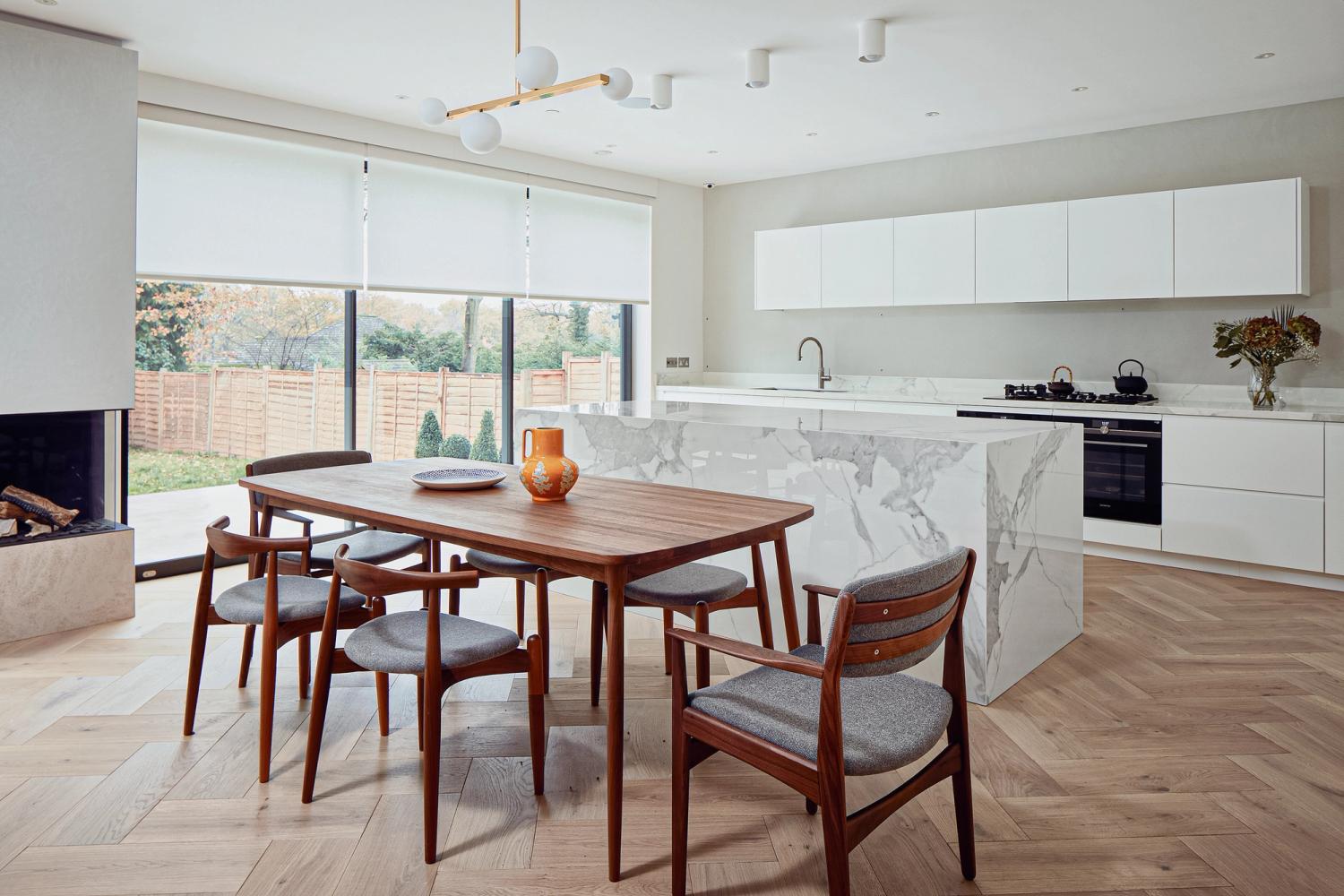 The designer's solution has provided the couple with a stylish yet practical dine-in galley kitchen. Floor and wall-mounted cabinetry houses the fridge-freezer, food pantry above the integrated sink, and accommodates both the washing machine and boiler, all neatly set into a large alcove on one wall. At right angles to this is an island fixed to the opposite wall, featuring handleless drawers, a built-in oven, and a hob with downdraft extraction integrated into the stone waterfall carcass. Parallel to the island is a bespoke dining table and bench that can be pushed into a second wall alcove, allowing the floor area to open up when not in use.