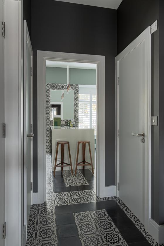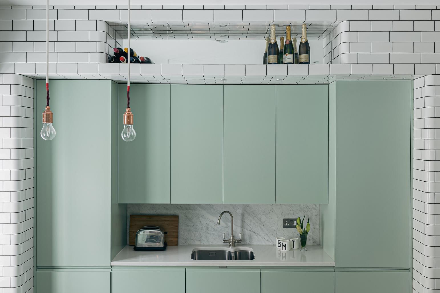 Finishing touches: the door that hides the washing machine and the boiler has been split to match the arrangement at the opposite end of the alcove, where the two doors open separately to reveal the fridge and freezer. Mirrored panels on the wall at the end of the island, and along the front of the island were added to make the room feel larger, and copper piping was used for the decorative but functional ceiling rack that complements the metro-style tiling.