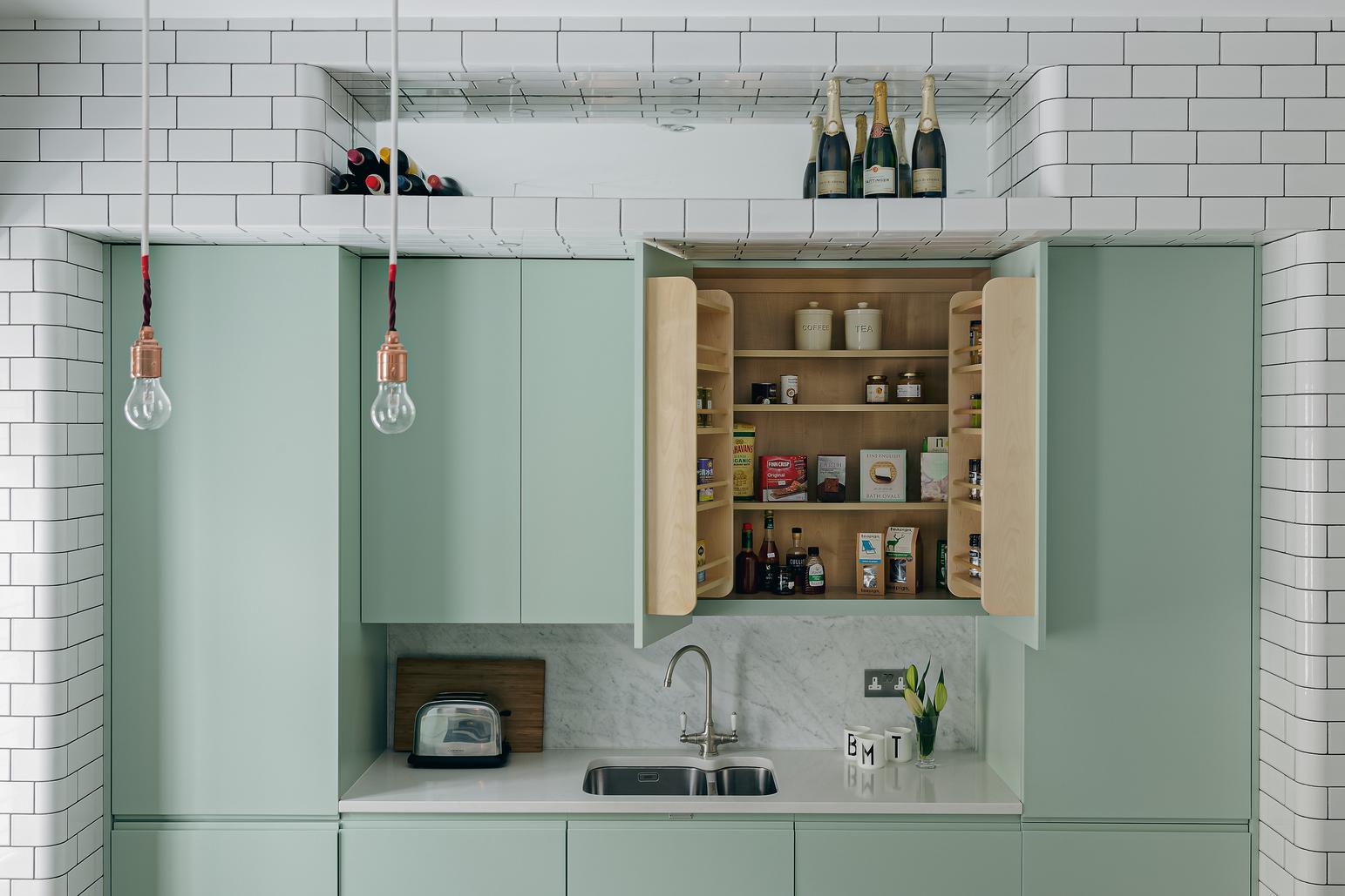 Storage solutions: a banquette built into the wall behind the dining table doubles as hidden storage while the mirror-lined alcove above the sink is designed to be used as a wine rack with a fixed rail to support the stepladder for access.