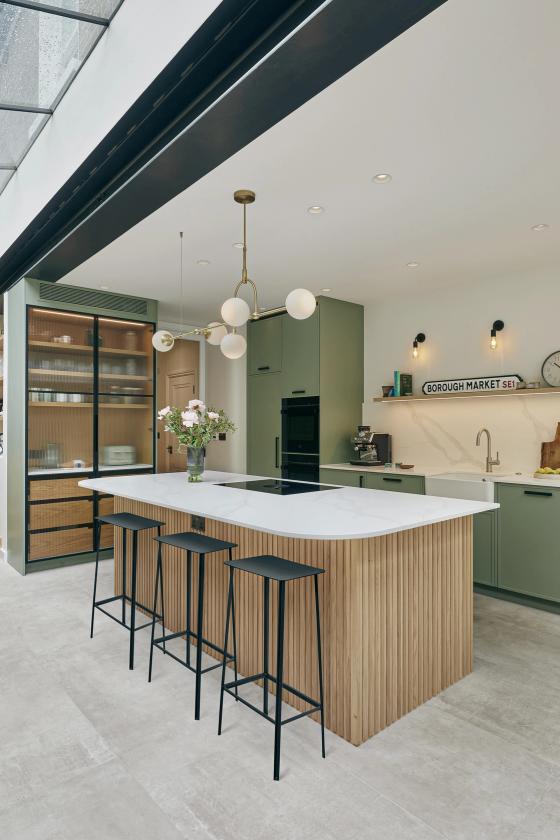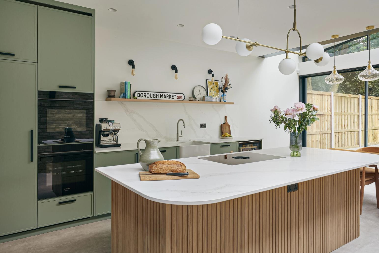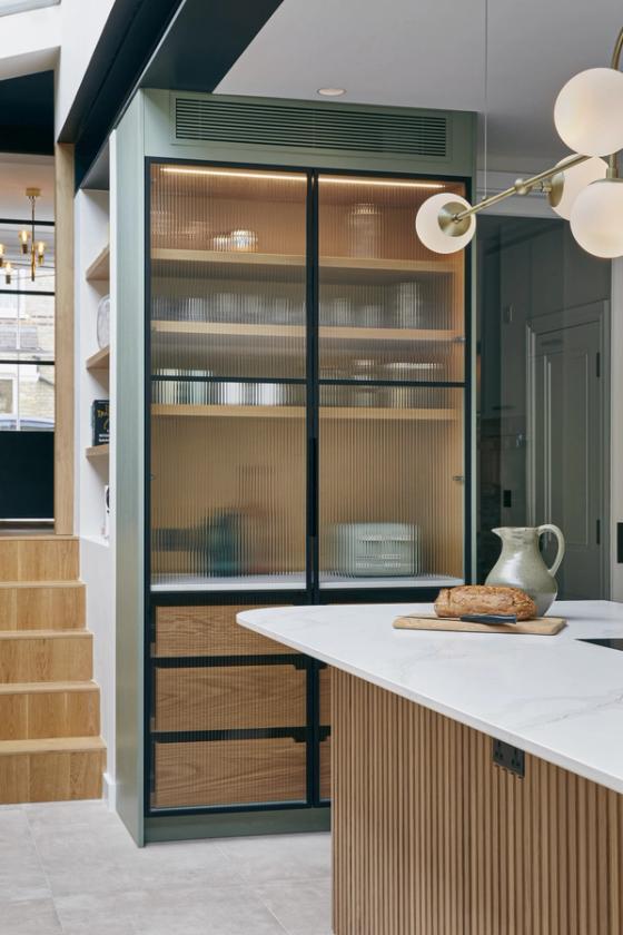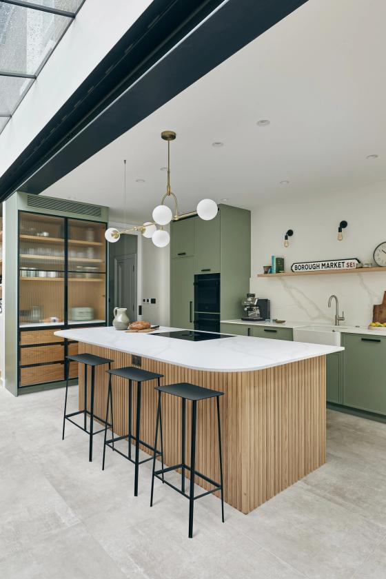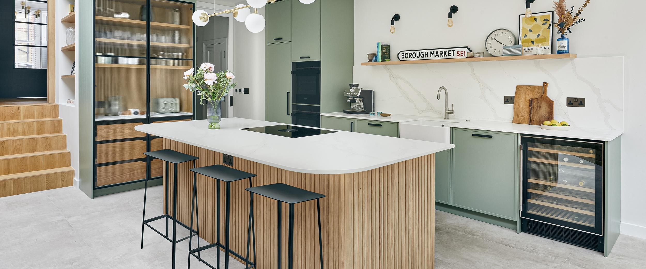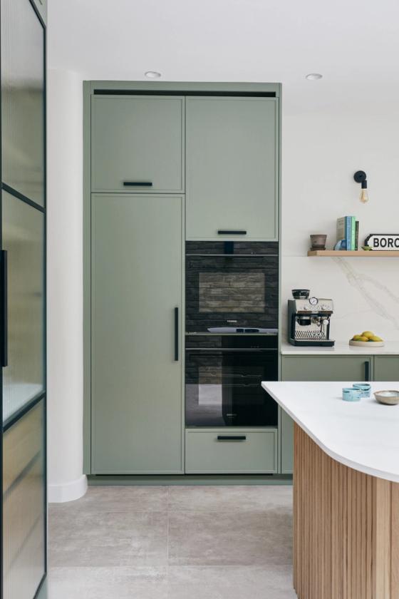 The designer's solution combines Shaker-style ash cabinetry spraypainted a soft sage green with Sola Kitchen's Skog panelling and a round-edged quartz worktop for the modern classic and child-friendly look the clients requested. A bulkhead between the two doorways has been artfully filled with a fluted-glass-fronted pantry, with oak-front drawers to tie in with the stairs and open shelving, and a black framework to coordinate with the black iron Hendle & Hendle handles and black-finish appliances.