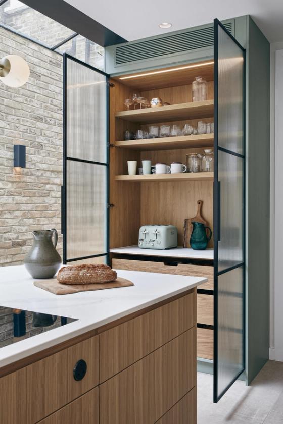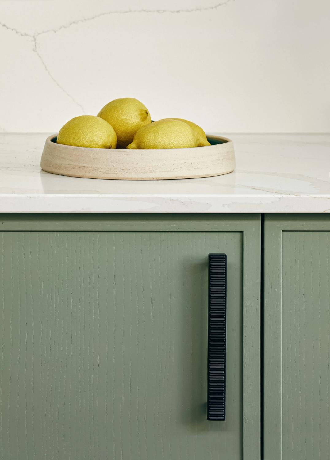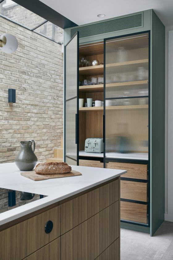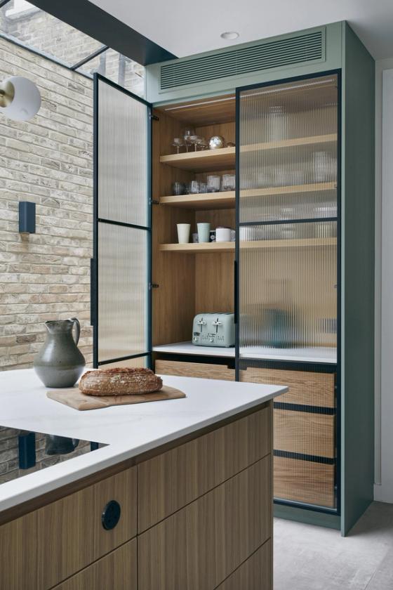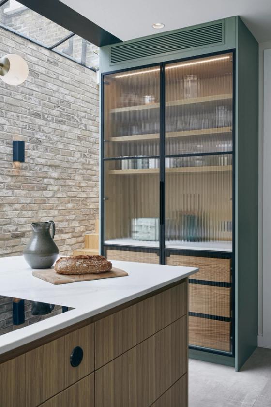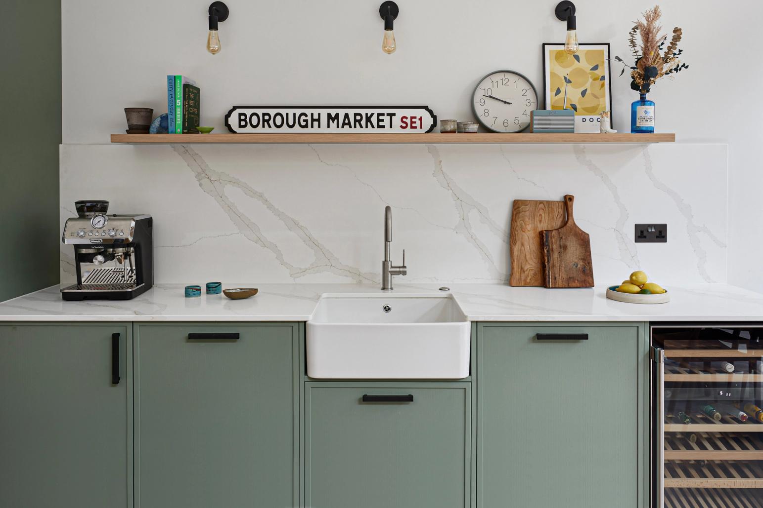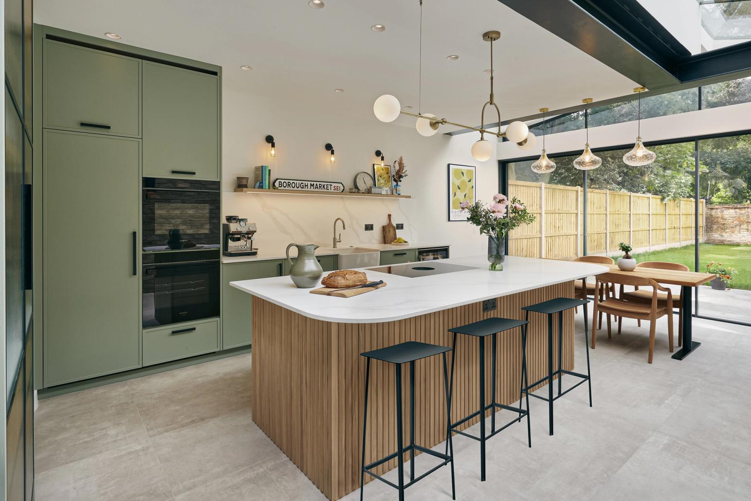 The designer's solution combines Shaker-style ash cabinetry spraypainted a soft sage green with Sola Kitchen's Skog panelling and a round-edged quartz worktop for the modern classic and child-friendly look the clients requested. A bulkhead between the two doorways has been artfully filled with a fluted-glass-fronted pantry, with oak-front drawers to tie in with the stairs and open shelving, and a black framework to coordinate with the black iron Hendle & Hendle handles and black-finish appliances.