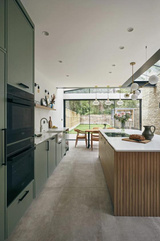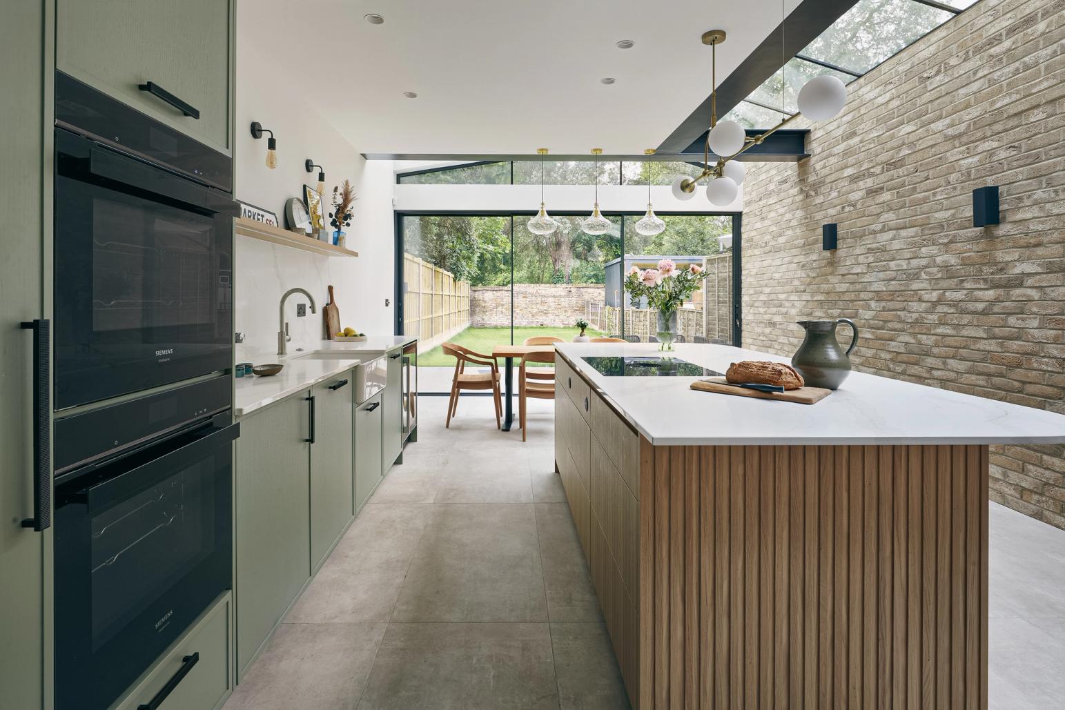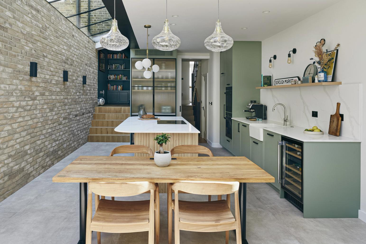 The clients like to cook and wanted the kitchen to make the most of the garden views. They wanted a modern take on a traditional kitchen, including a Belfast sink and space for a dining table, and had chosen a colour and materials palette inspired by biophilic principles of design - greens, natural woods, metals, and stone.