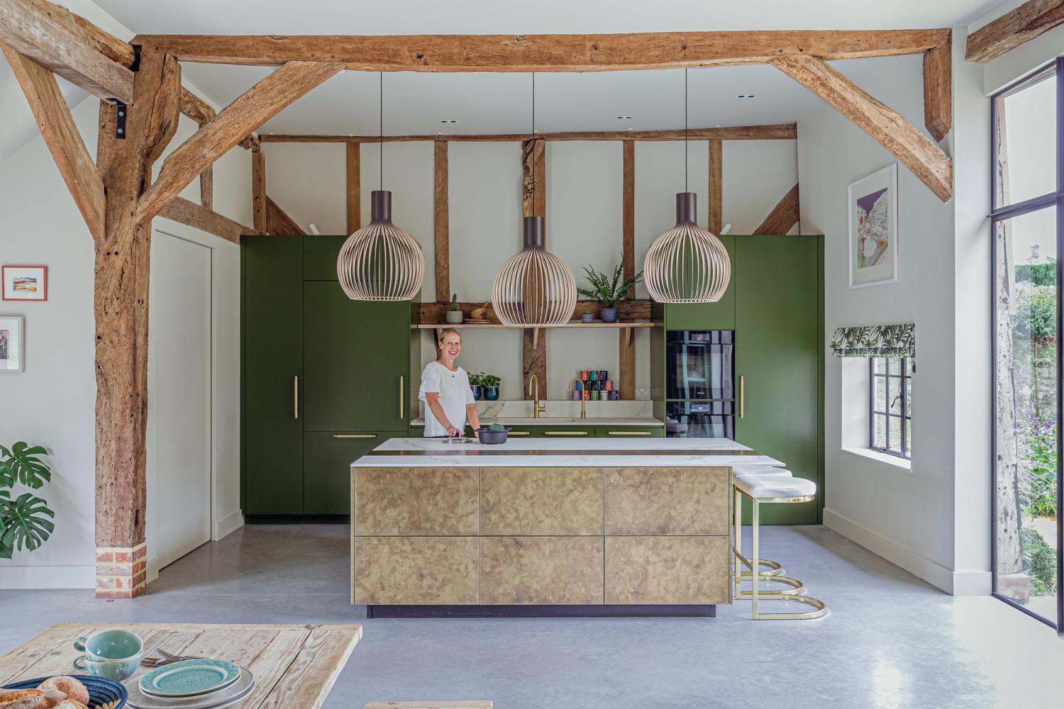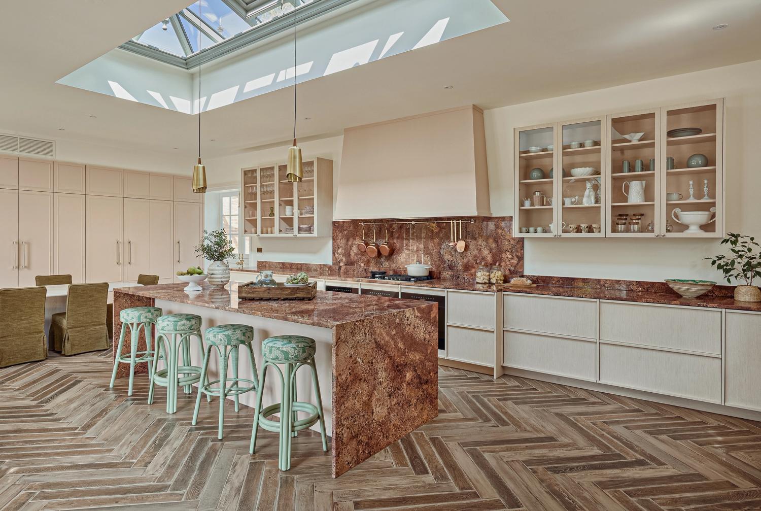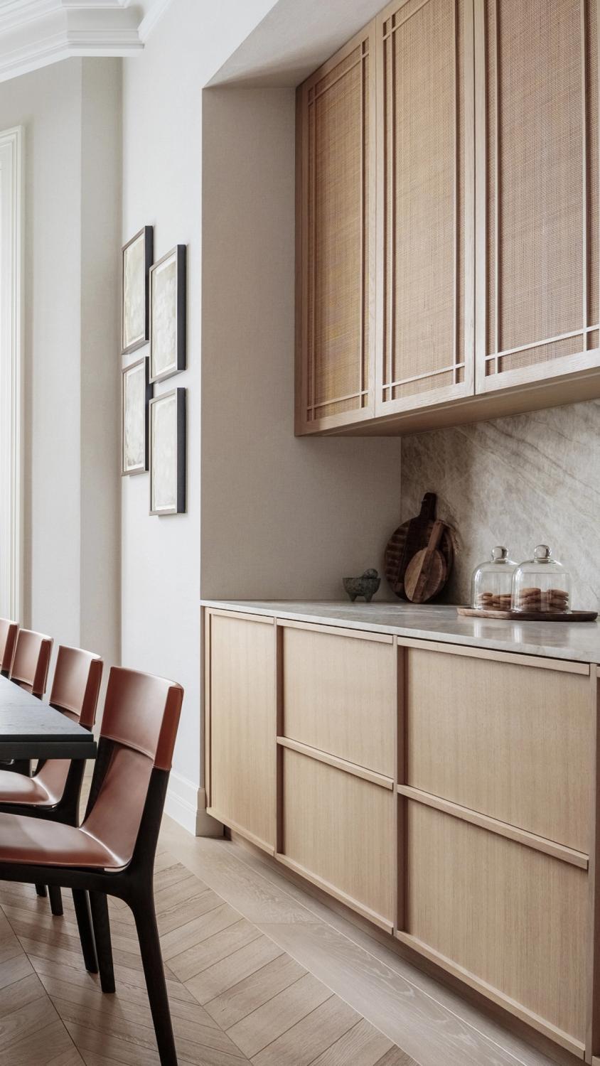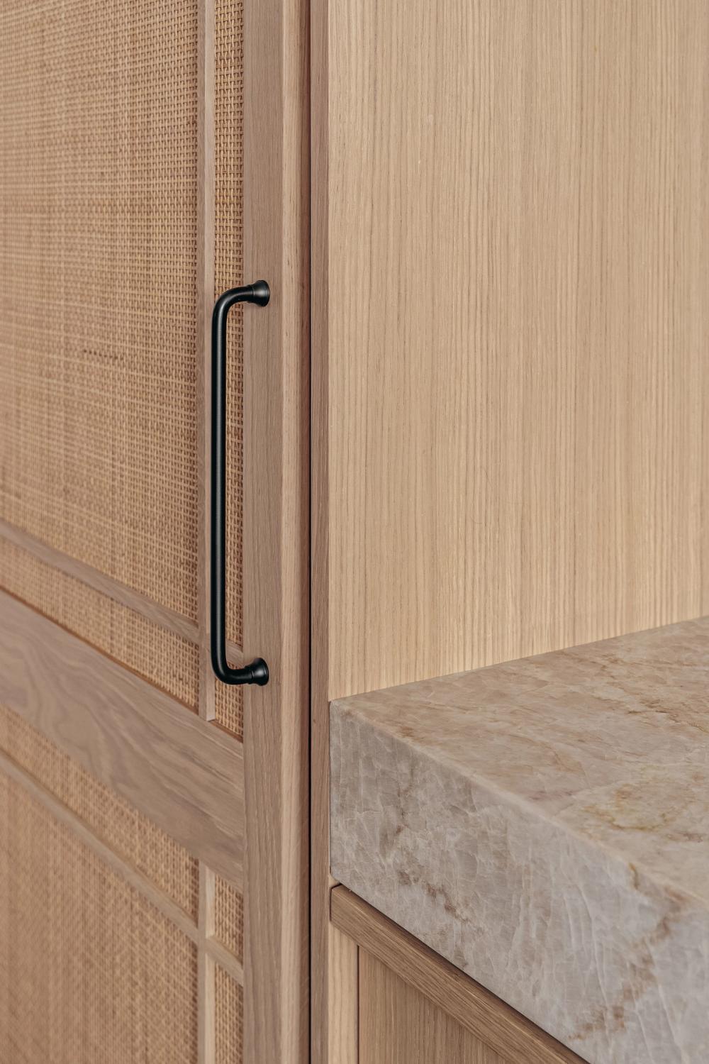 Dream weaving: Miaki worked with the Sola Kitchens designers to devise a bespoke version of the rattan-fronted cabinets for use in this kitchen-dining room. The final form features oak pieces of beaded molding applied over the rattan surface, with the ends of the verticals and the horizontals meeting to form a cross in each corner of the door fronts.
