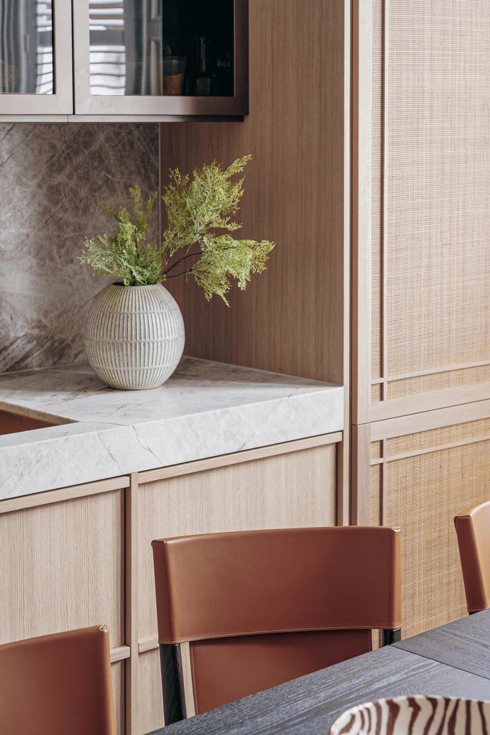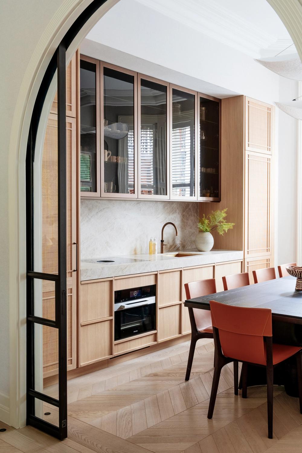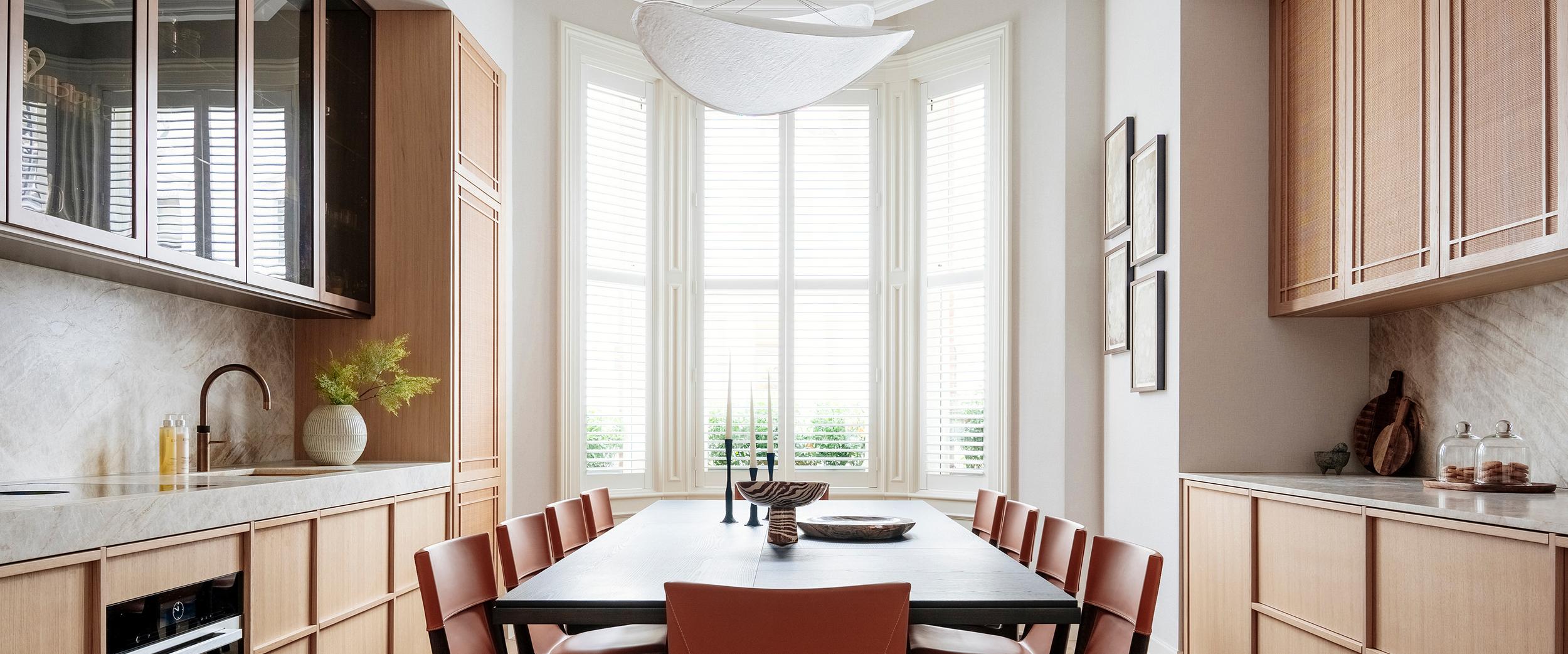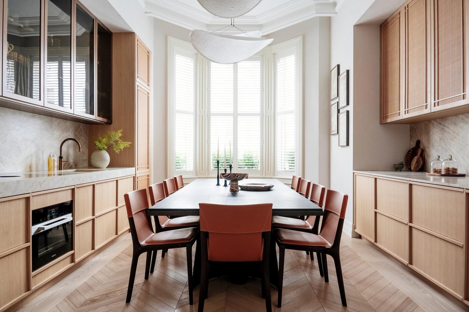 The designer's solution is a masterclass in spatial arrangement and alignment, technical detailing and layering with a strict palette of materials, textures and colour tones. Floor cabinetry from Sola Kitchens’ Fjord signature style is beautifully paired with bespoke wall cabinets featuring elegant rattan detailing. The distinctive 20mm-deep frames of the Fjord are not only perfectly aligned with the beaded detailing of the rattan, they are also aligned with the work surfaces, the window, and the herringbone-laid parquet floor. The pale natural oak for the cabinetry was a carefully considered choice; the honey colour softens the framed effect created by the built-in furniture. It makes the room feel light and airy at the edges, focusing the eye on the beauty of the dark wood dining table and orange leather-upholstered chairs in the middle of the room.