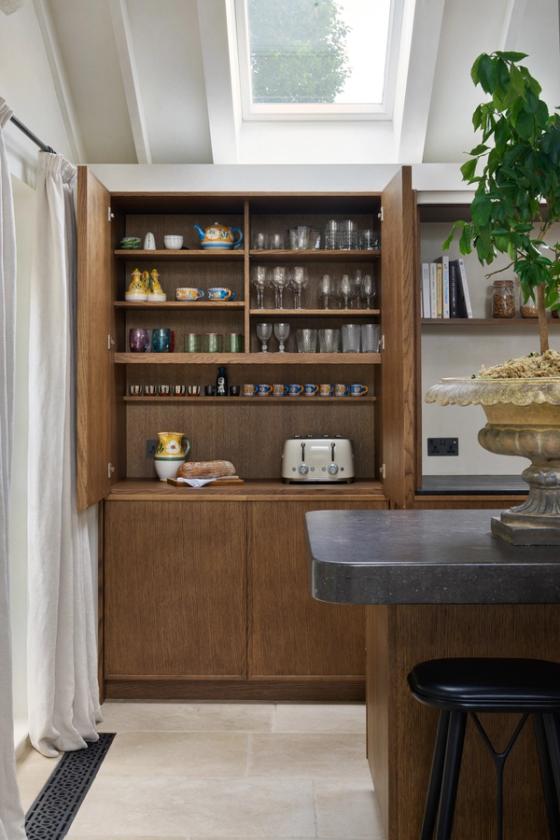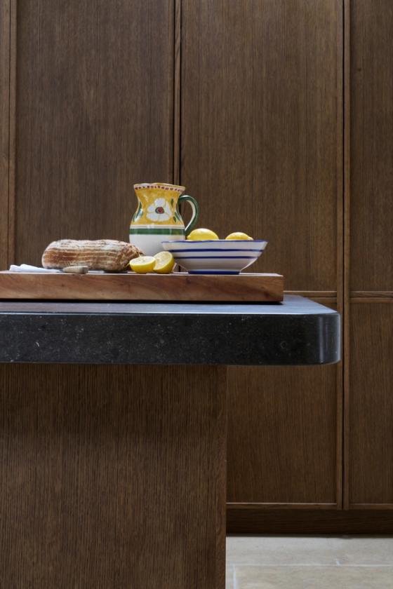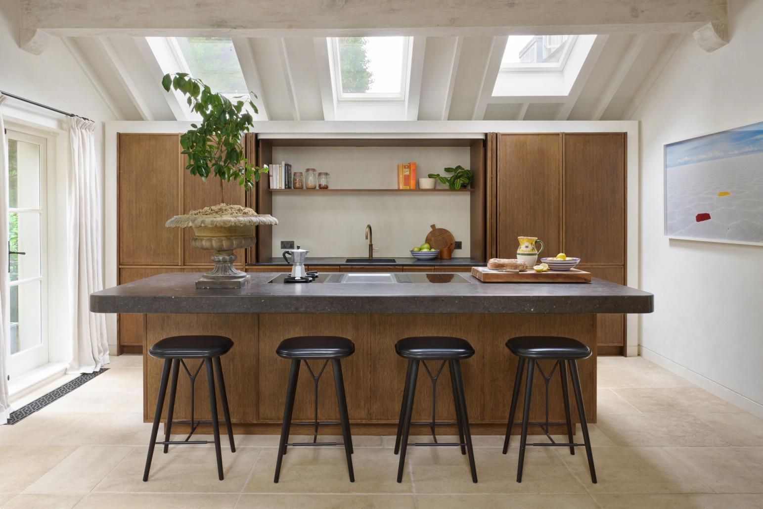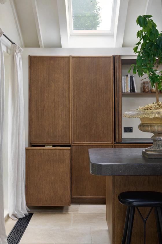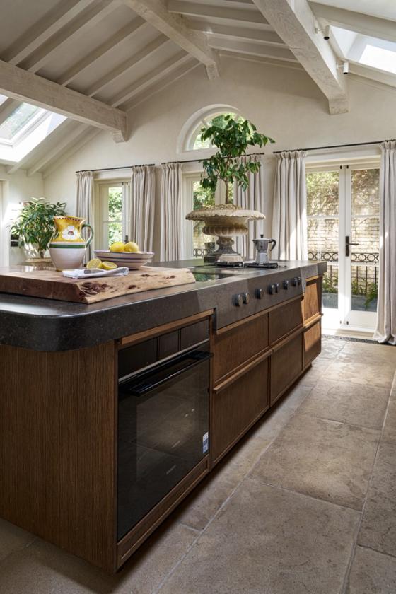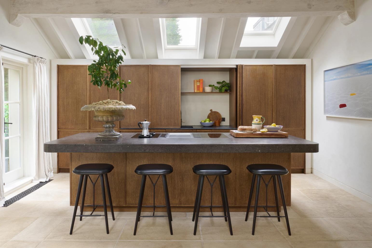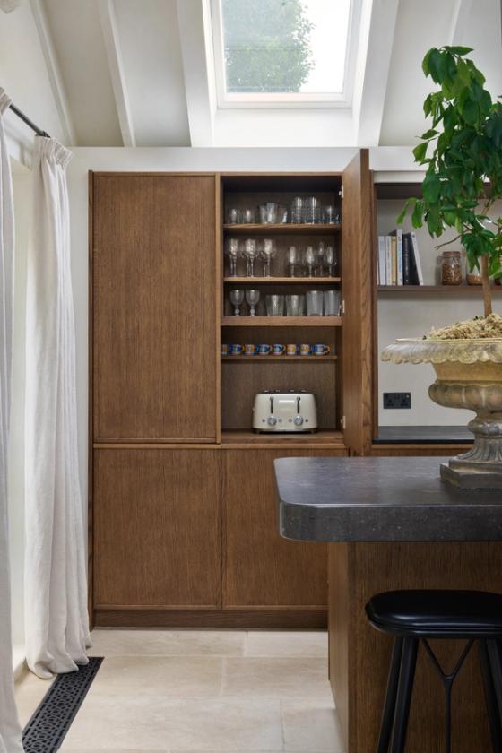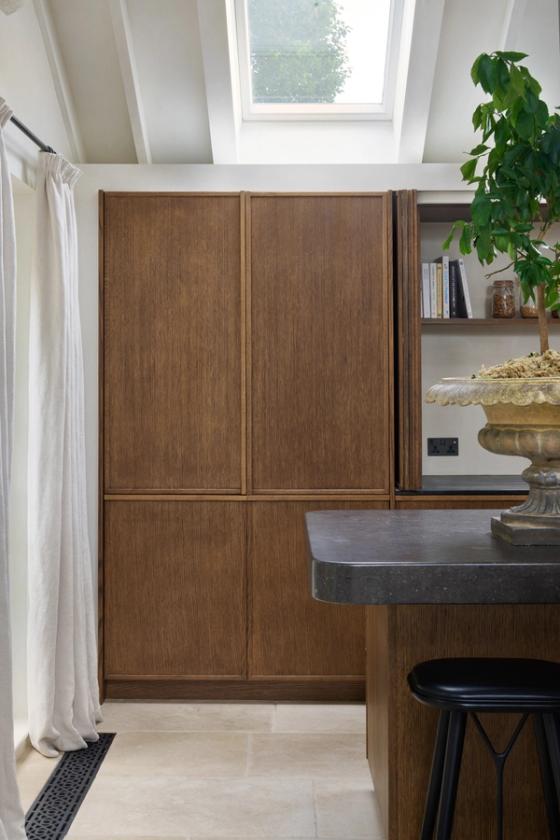 The couple wanted the new kitchen to have a Mediterranean look, with plenty of natural materials, particularly antique oak, and concrete floors. The cabinetry needed to look like furniture and crucially, they wanted to be able to hide everything away, so it would be clean and uncluttered, with no indication that a kitchen lay behind the cabinet doors.