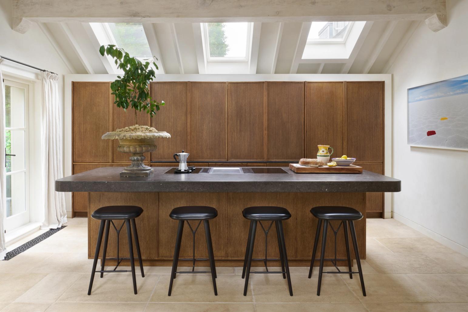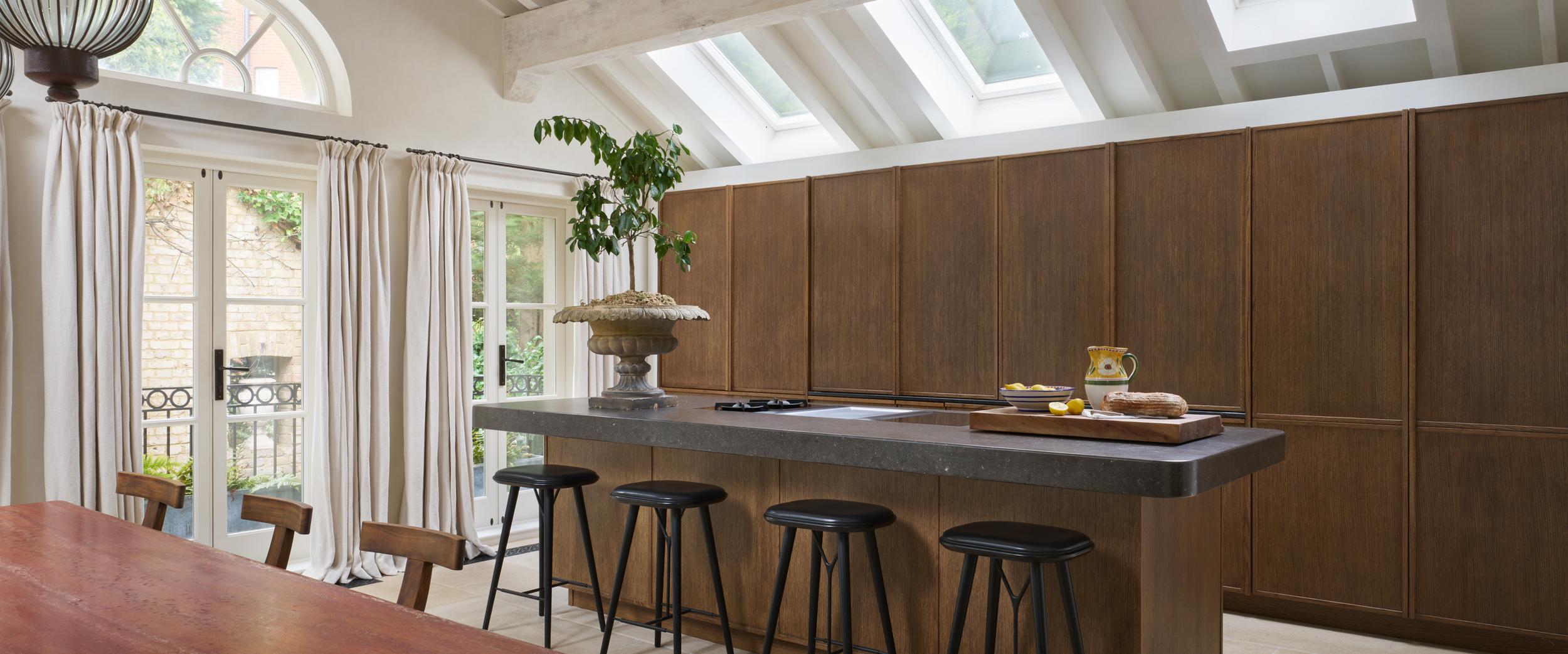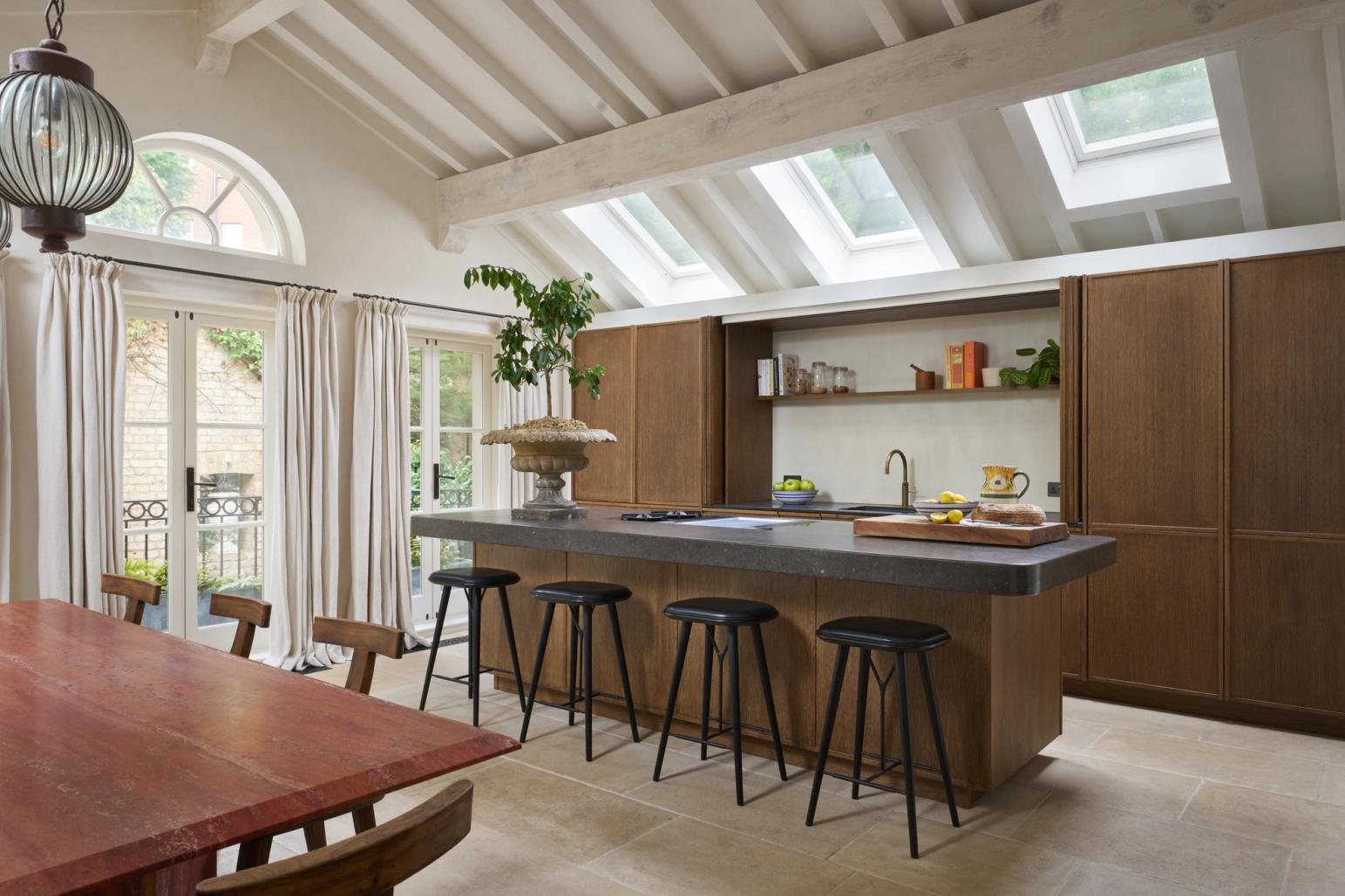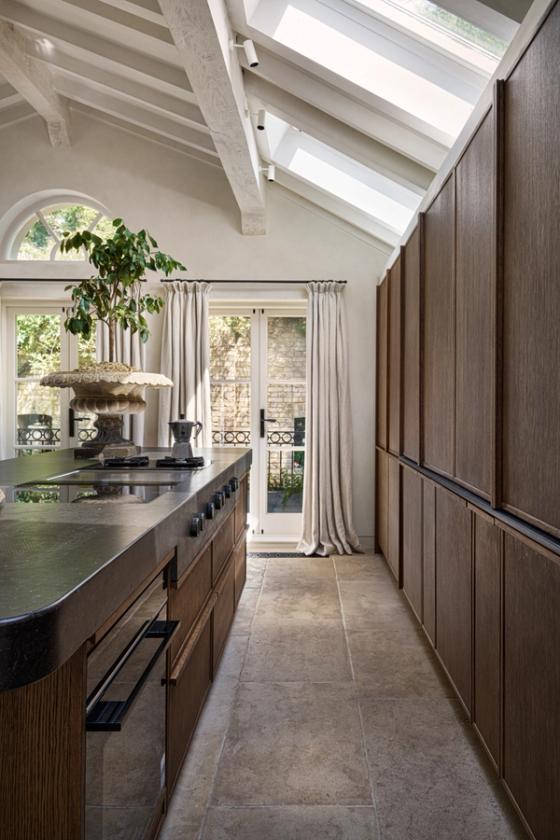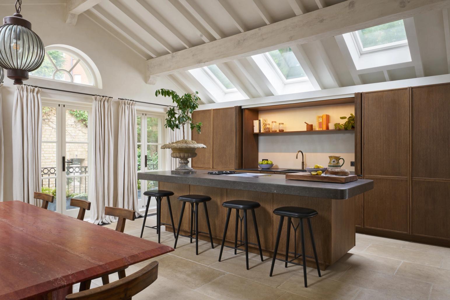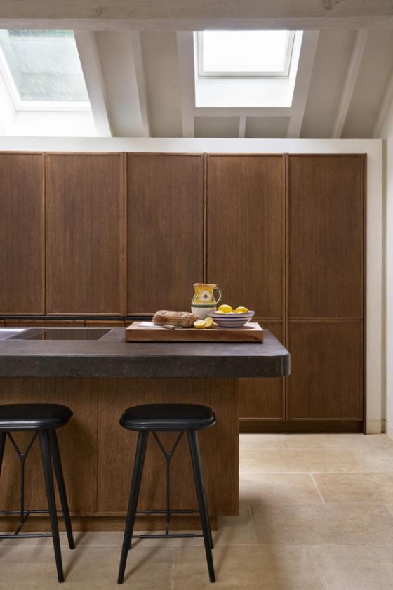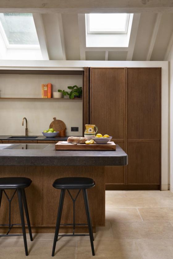 The couple wanted the new kitchen to have a Mediterranean look, with plenty of natural materials, particularly antique oak, and concrete floors. The cabinetry needed to look like furniture and crucially, they wanted to be able to hide everything away, so it would be clean and uncluttered, with no indication that a kitchen lay behind the cabinet doors.