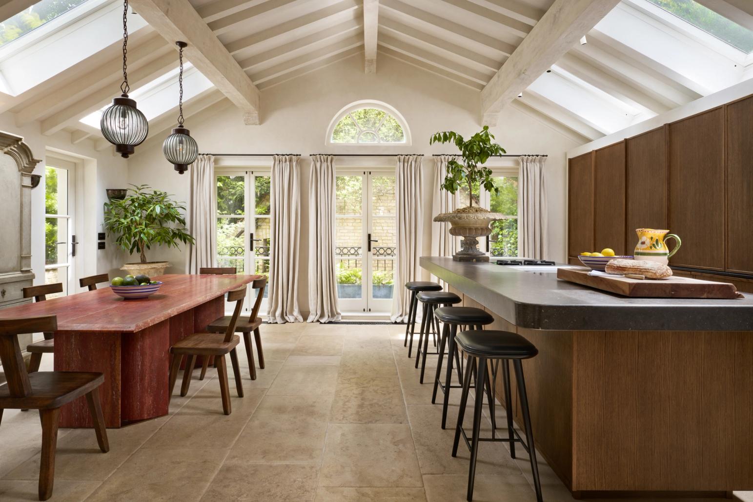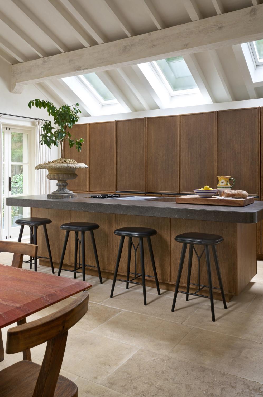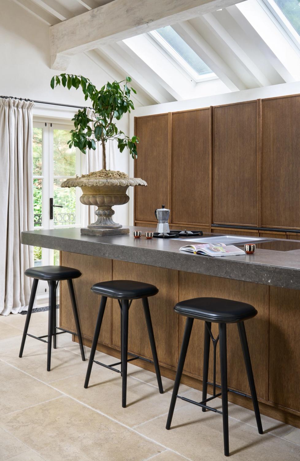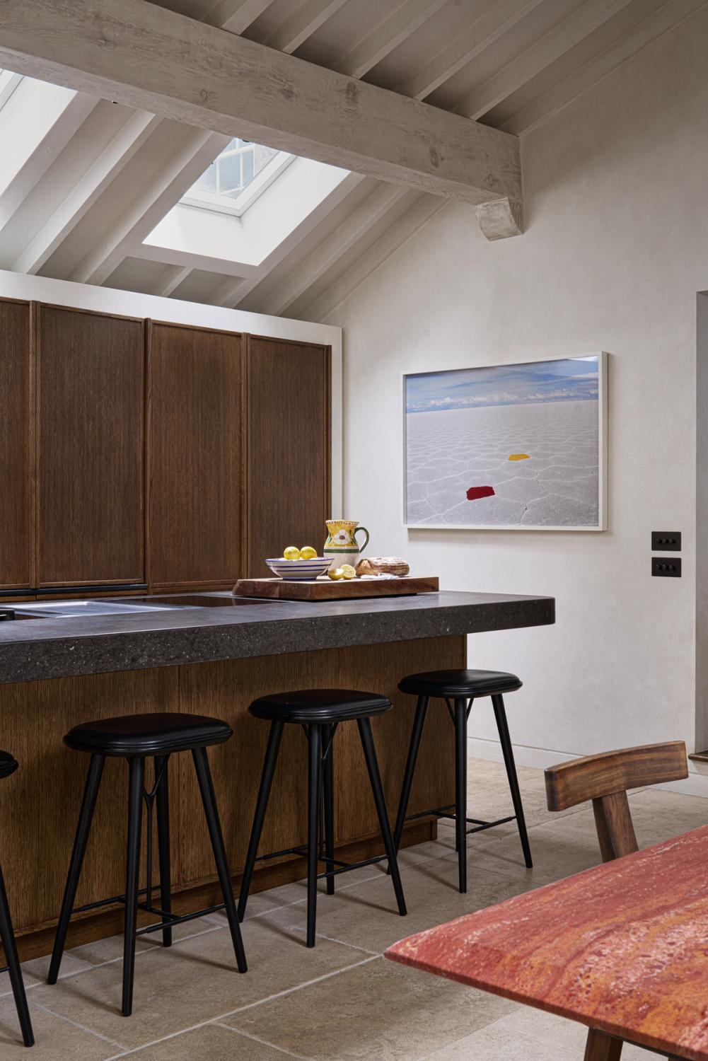 The couple wanted the new kitchen to have a Mediterranean look, with plenty of natural materials, particularly antique oak, and concrete floors. The cabinetry needed to look like furniture and crucially, they wanted to be able to hide everything away, so it would be clean and uncluttered, with no indication that a kitchen lay behind the cabinet doors.