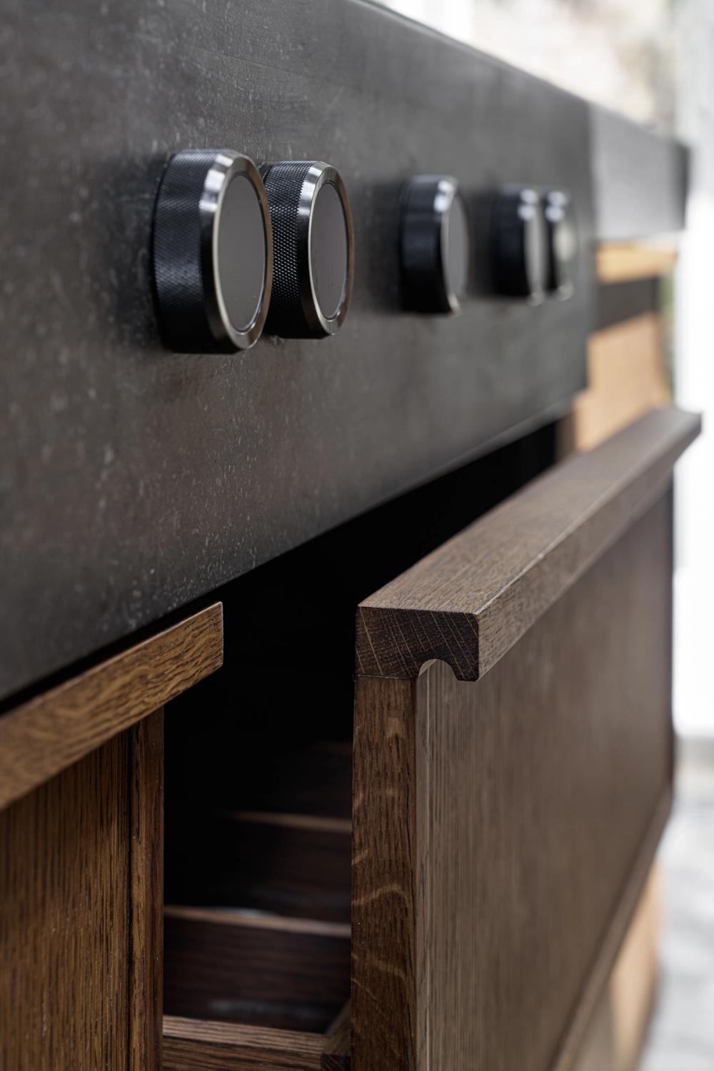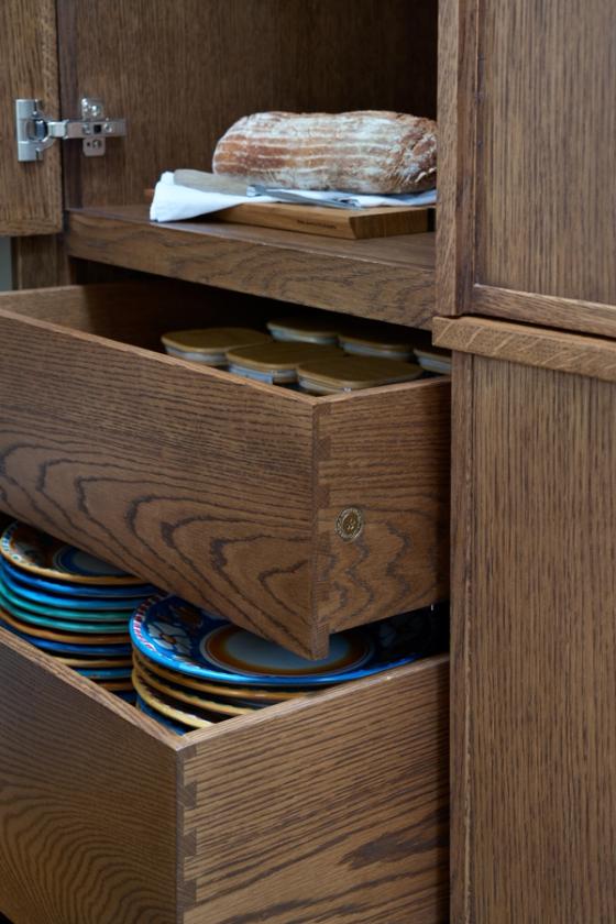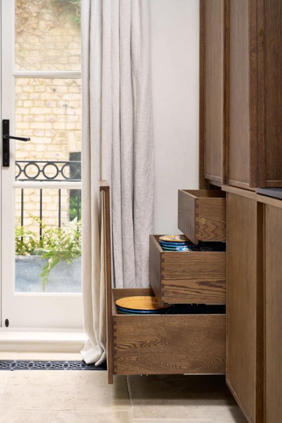 Nest of drawers: to maintain the symmetry of the kitchen without losing any storage capacity, three drawers within drawers are hidden behind a single cabinet panel.