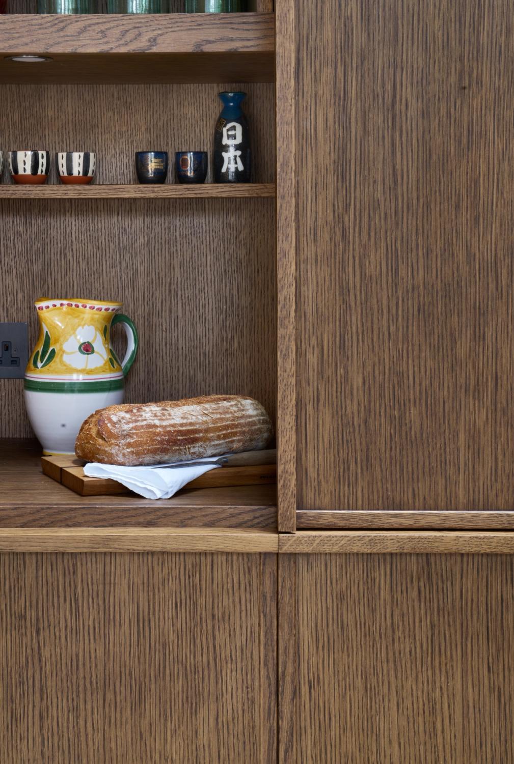 The impressive stone worktop was sourced by the owners themselves, and in order for the island to be stable and strong enough to bear its weight, the carcasses have been reinforced with solid, weight-filled bases instead of legs, and are secured to the floor. The stone worktop used on the wall run is 20mm in depth and aligns with the horizontals of the fridge and the freezer on the right-hand side of the sink and the double-door pantry on the left.