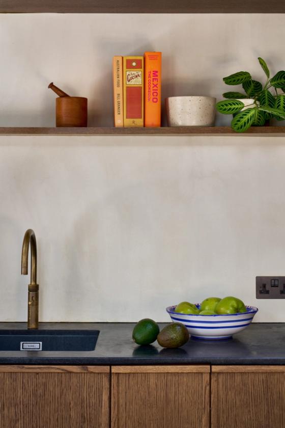 The designer's solution combines Sola Kitchens' 20mm Shaker cabinetry with its 20mm handled Fjord range for the first time, and has been used to create a panelled screen with bifold pocket doors in the middle of the wall run that open up to reveal the sink and a single floating shelf.