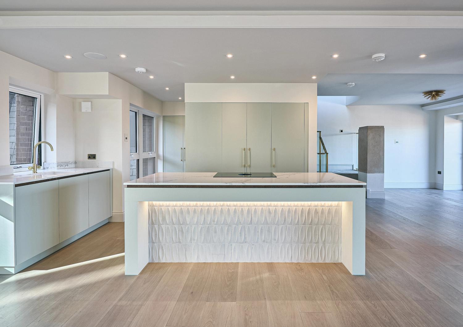 The designer’s solution was refined from a concept by the client’s architect, featuring handleless, flat-fronted cabinetry, hand-painted in a soft grey-white colour to stand out against the white background subtly. Arranged symmetrically along both longest walls, all appliances are positioned near the window, out of sight when entering the room or sitting in the dining area, with the hob’s extraction system hidden within the cabinetry above. The narrow island, topped with a Caesarstone work surface, houses a stainless steel double sink, bins, and a dishwasher underneath while maintaining enough space for easy access to the wall cabinetry and the client has enough room to turn and use all the worksurfaces easily and safely. To incorporate the bar seating the client wanted, the architect collaborated with Sola Kitchens to design a steel frame, seamlessly integrated into the island to support the waterfall extension of the worktop.