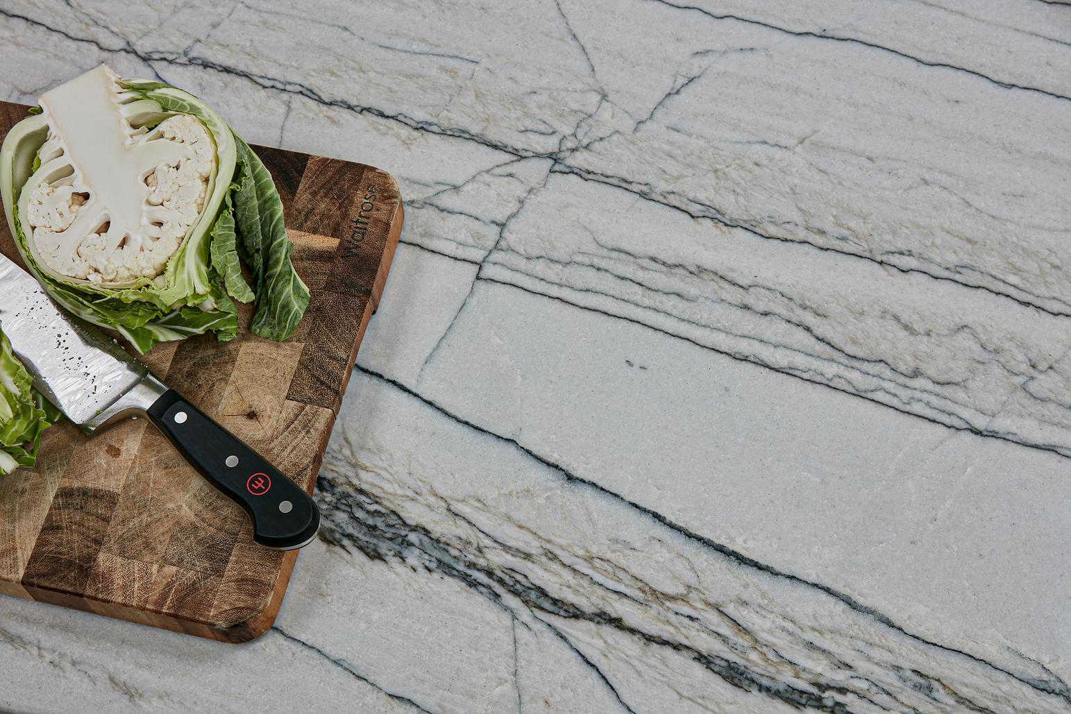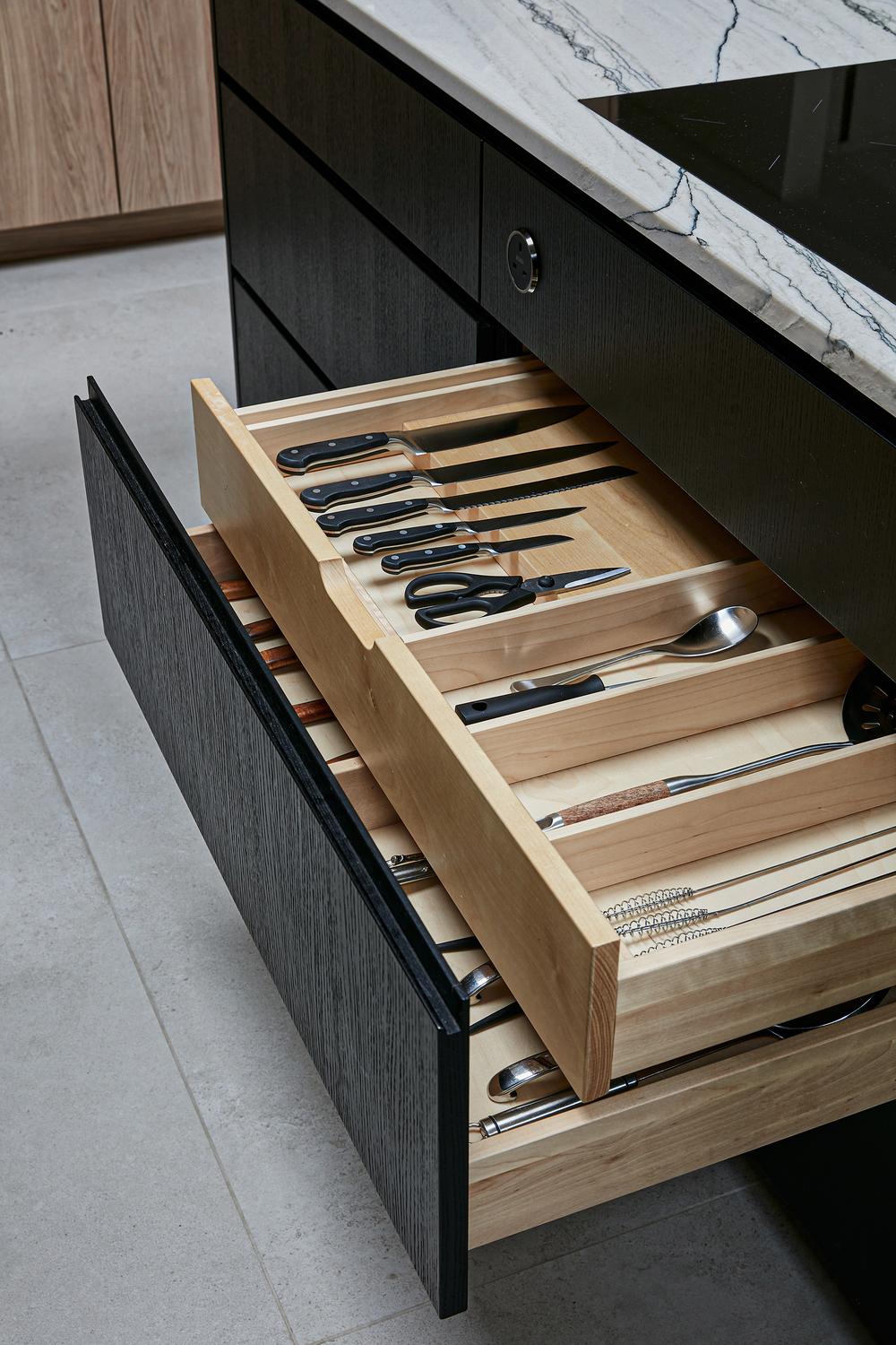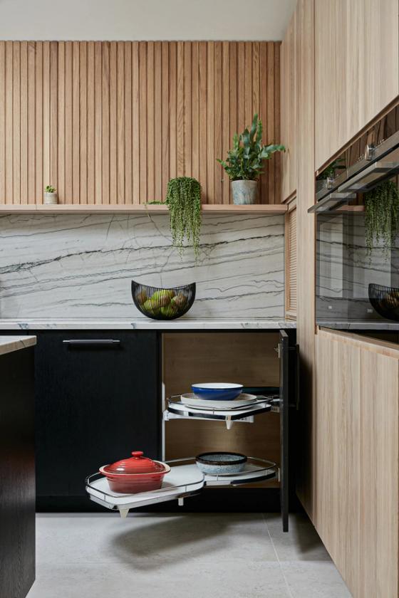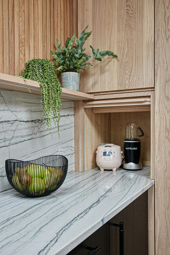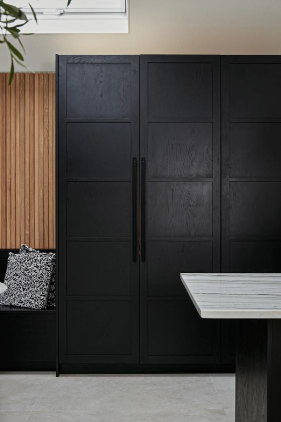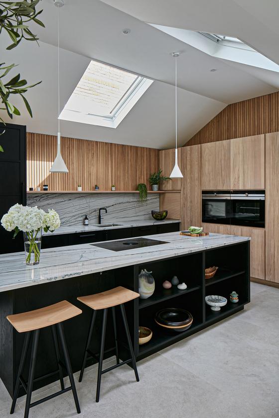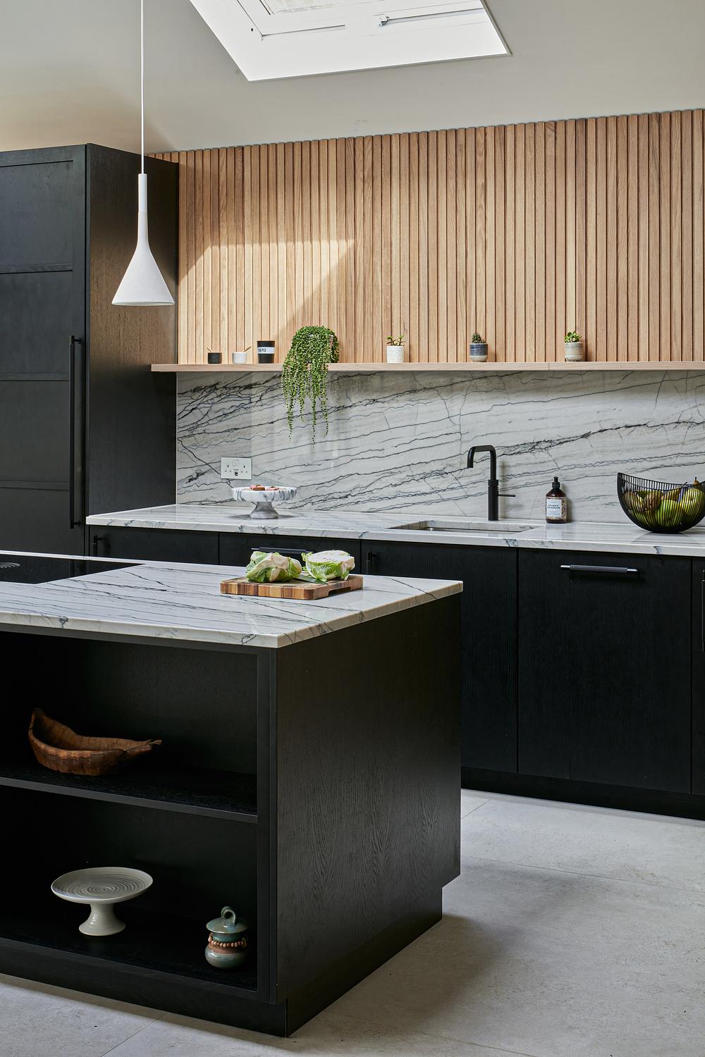 The designer's solution embraces biophilic principles, fostering a connection to nature and creating an indoor-outdoor ambience. Flat-fronted cabinetry in ash, hand-painted in matt black, demarcates the backbone of the kitchen, while pale oak panels with handcrafted fluted surfaces line the walls. At the heart of the design is a marble-topped island, featuring seating thoughtfully arranged around one corner and integrated with a downdraft Bora system. The working side offers push-to-open drawers lined with bespoke organisers, while open shelves on the front provide space for display and cookery books.