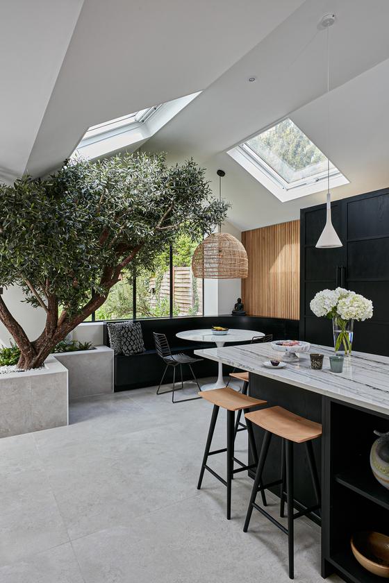 Finishing touches: the built-in planter for the ancient olive tree was designed with walls suitable for perching on. In the corner, to the right of sink, a countertop cabinet with a rolling door and a power socket fitted inside means gadgets such as the mixer can easily be pulled out for use before sliding away again.