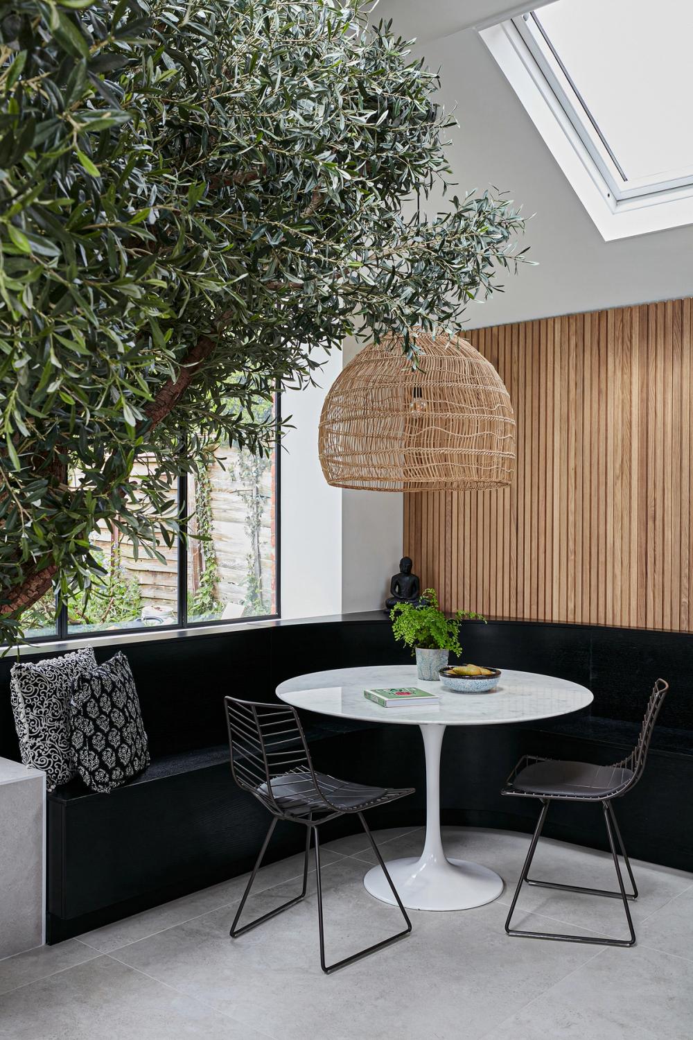 Family viewing: with its curved corner carefully designed to echo the couple's circular dining table, the bespoke banquette seat fits snugly beneath the garden picture window and establishes a child-friendly spot for meals, homework and play; the black-stained oak cabinet to the right encloses the breakfast bar-pantry.