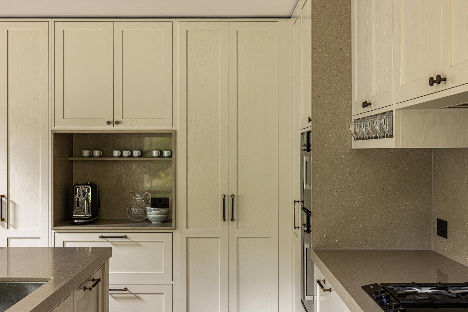 The designer's solution combines painted, in-frame Shaker cabinetry along the perimeter with Shitake quartz worktops by Caesarstone, paired with the distinctive slim slats of Sola Kitchens’ Skog cabinetry on the island front to create a look that is both contemporary and classic. Originally planned as a U-shaped layout around the island, the design was reconfigured when the owners opted to replace an existing window with French doors to provide direct garden access. This change prompted the relocation of the sink — now complete with a Barazza tap and soap dispenser — to the island, while the glass-fronted pantry now reads as a freestanding piece of furniture positioned elegantly between the two doorways.