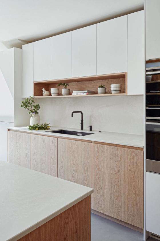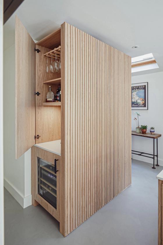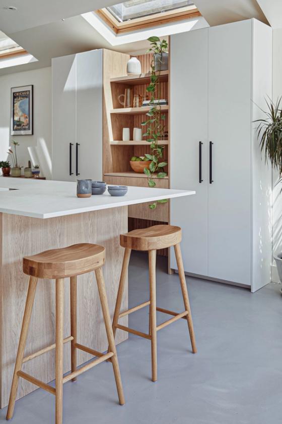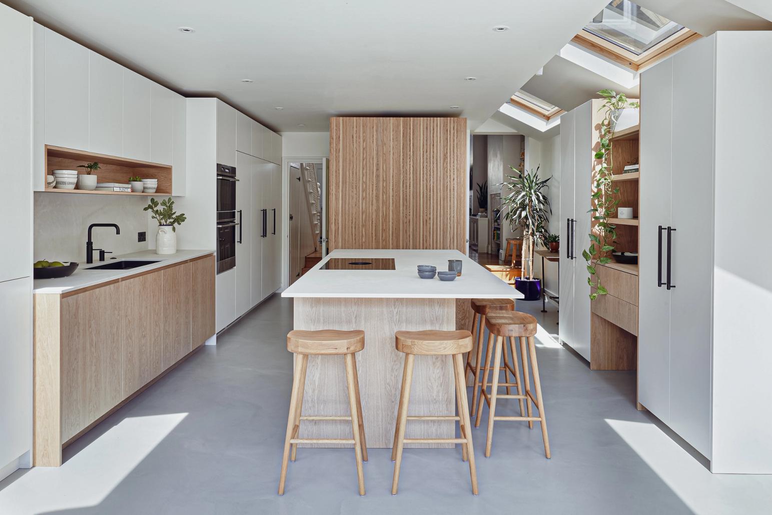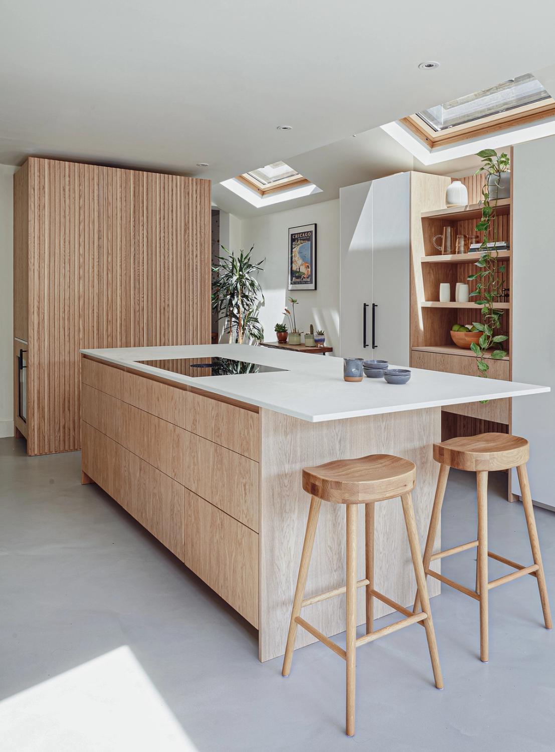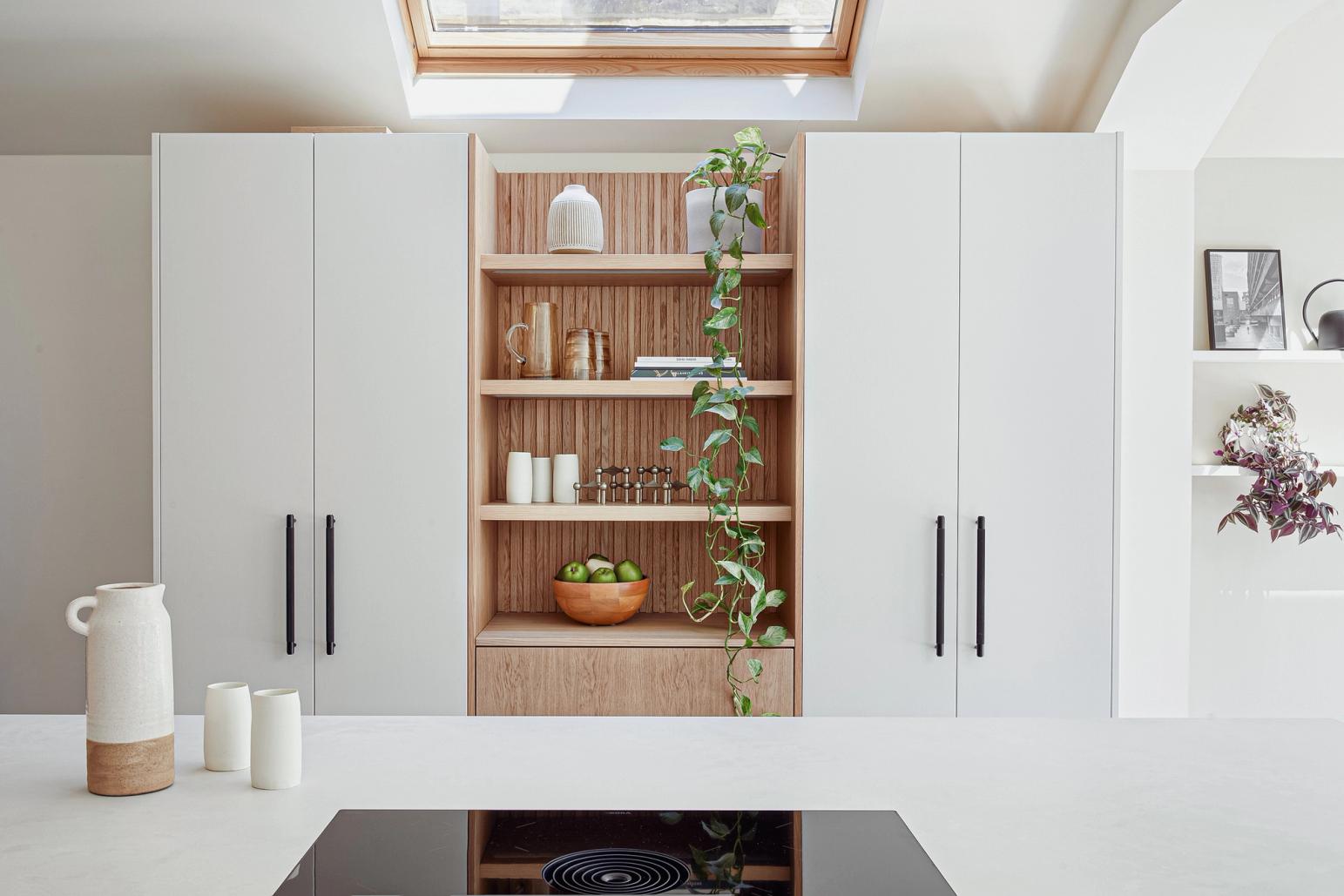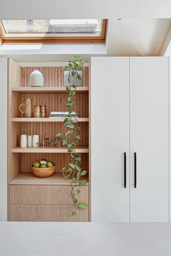 Pretty as a picture: to keep the room and routes through the space as clear, open, and airy as possible, two tall but shallow wall cabinets, one for dry food storage, the other a breakfast pantry, are arranged beneath the skylights, with an oak frame between them that is fitted with drawers and shelves and also with dimmable LED striplights, to make it a decorative and mood-enhancing feature as well as practical.