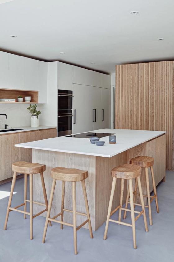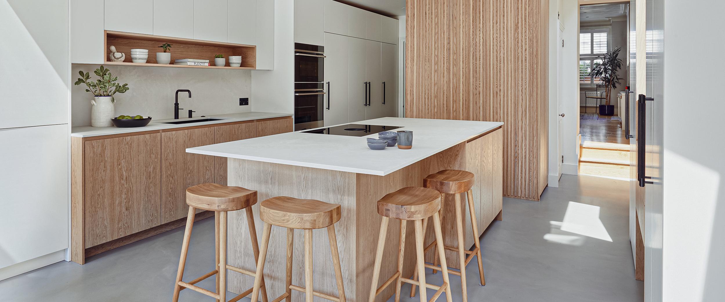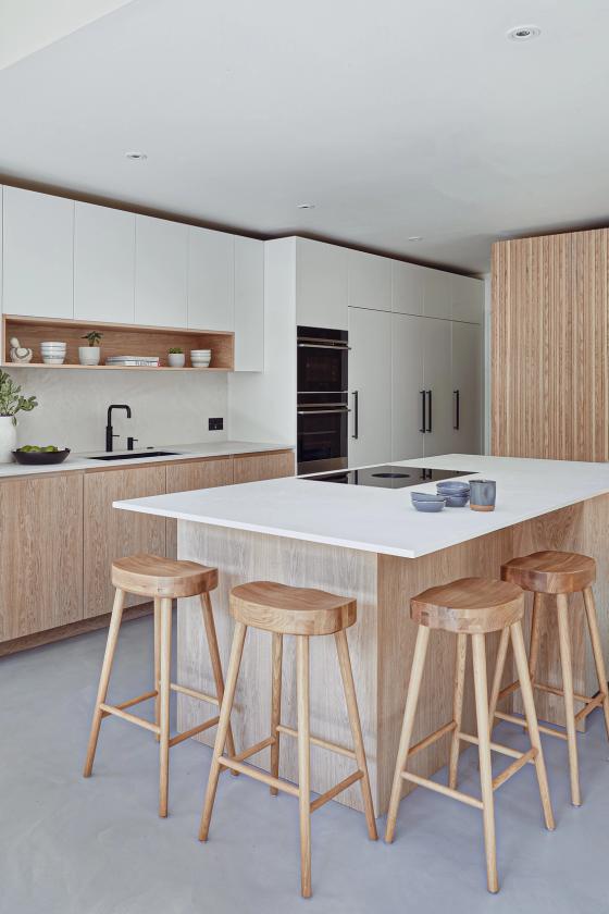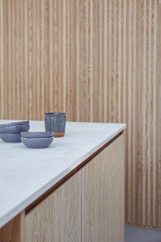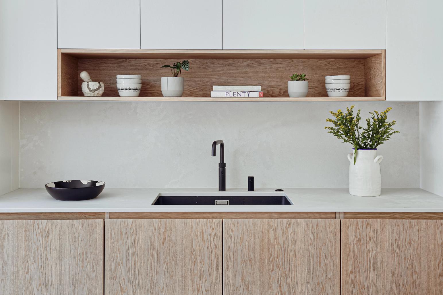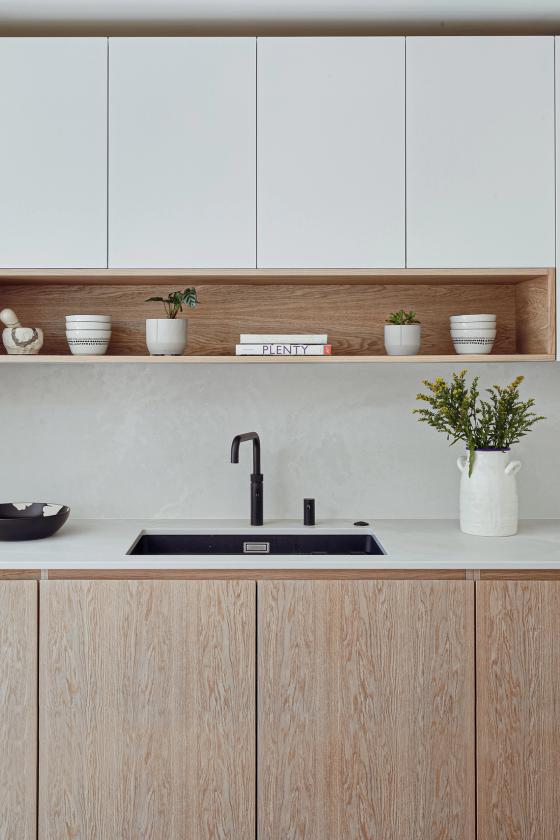 Finishing touches: the worktop is a neutral-coloured quartz chosen for its durability and easy maintenance.