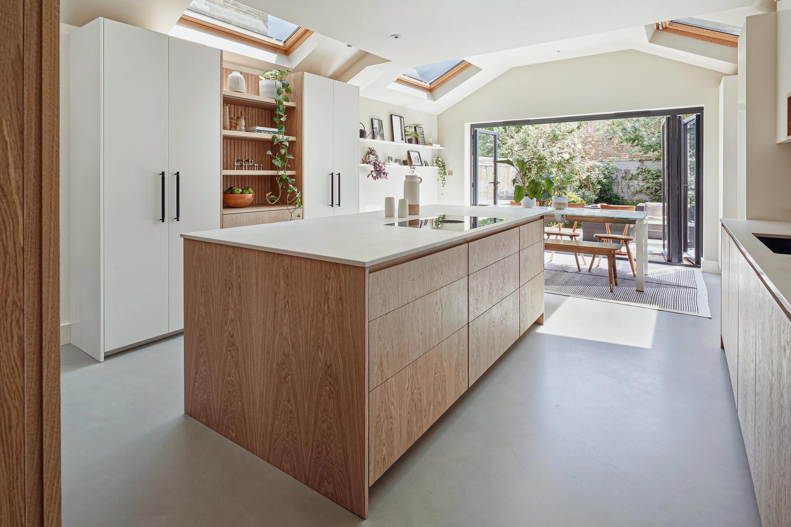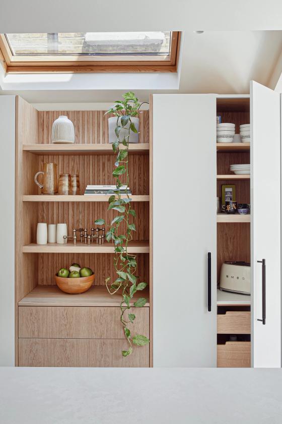 The designer's solution followed a recommendation to the client to expand the kitchen as they already had a sitting room at the front of the house, and the children were still young. The larger kitchen incorporates ample flat-fronted cabinetry along the walls, an island with a bar, and a dining table for six to eight people positioned in front of the bifold doors leading to the garden, which features an outdoor seating area. The wall between the two doorways to the front of the house is made into a feature with a double-fronted cabinet with a Skog front that opens to reveal a pantry on one side, and the dishwasher on the other, keeping the appliance out of sight but still close enough to the kitchen to be convenient when unloading.