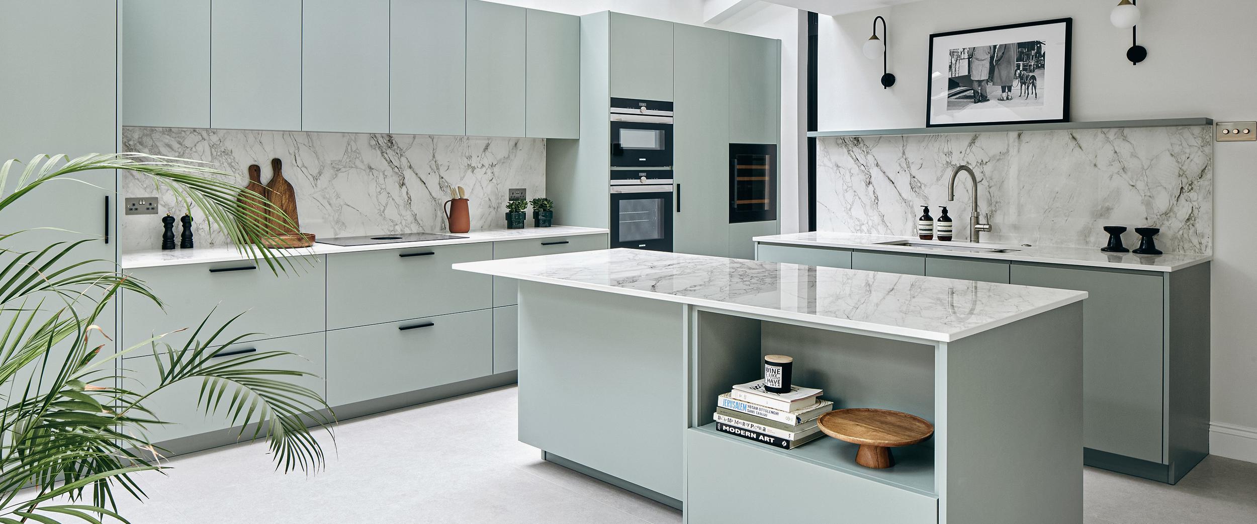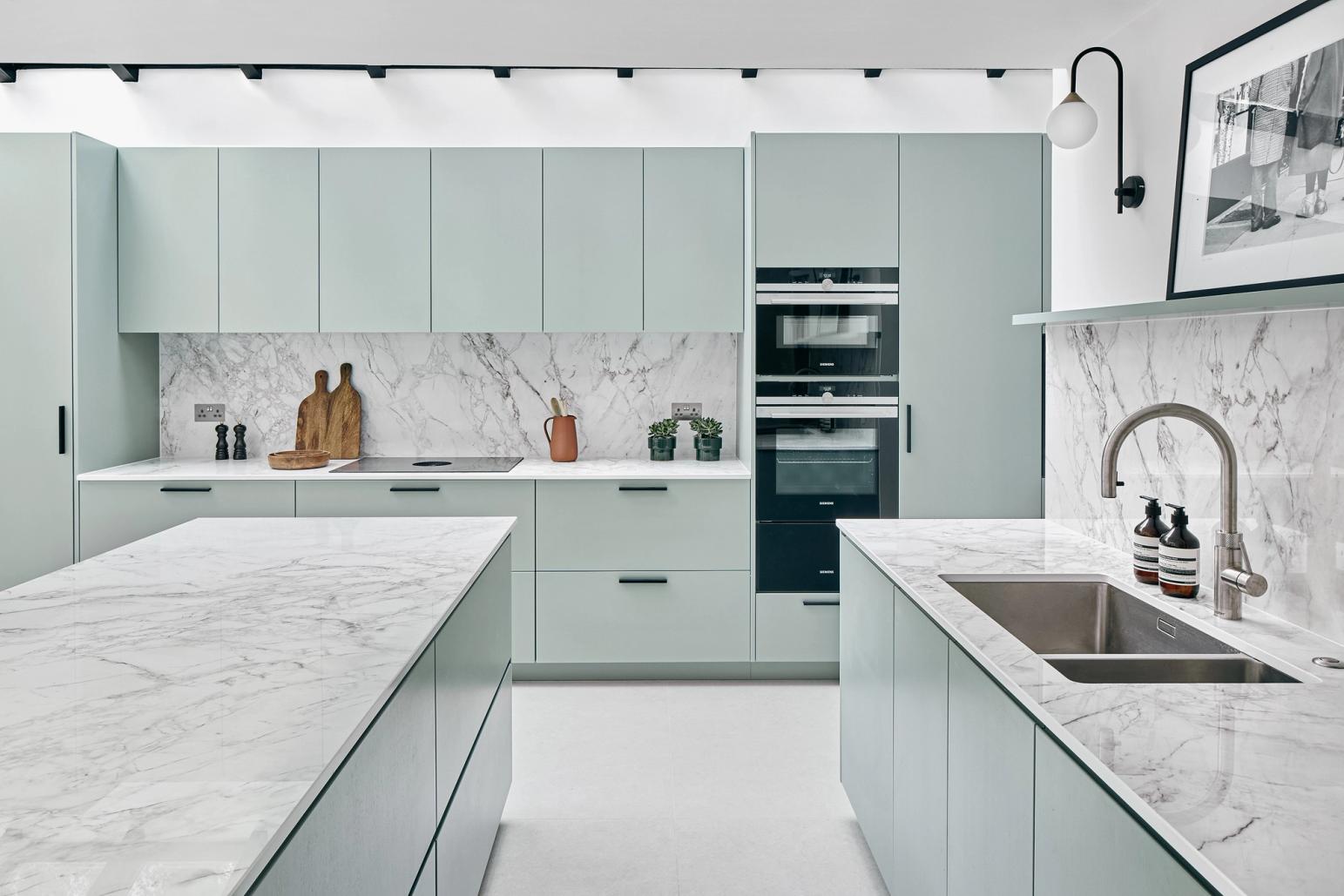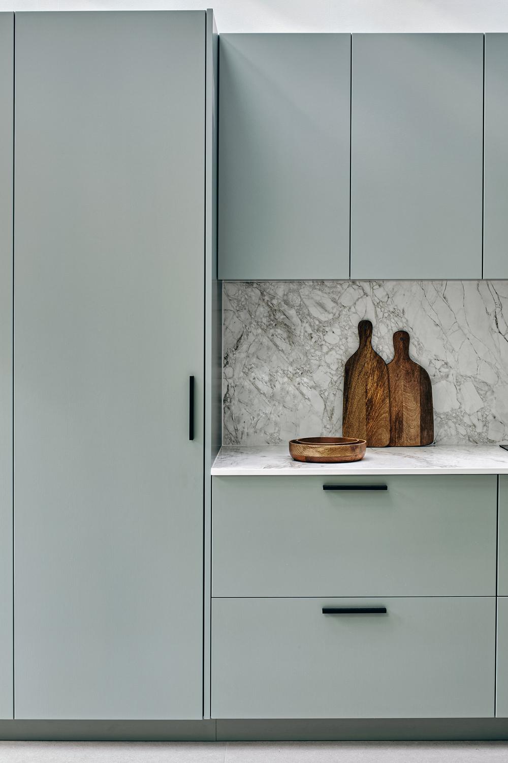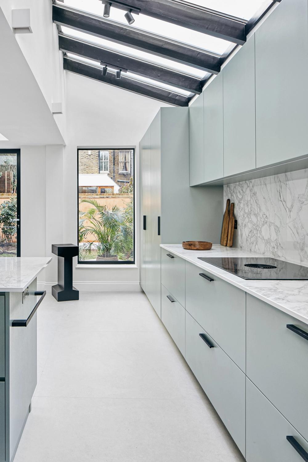 The designer's solution combines flat-fronted cabinetry painted in a pale duck-egg blue with a high-gloss finished Dekton stone for the worktops and splashback, creating a very clean-lined, ethereal ambience enhanced by the shafts of light from the ladder-glazed skylight. Long, black steel handles on the tall cabinets and base drawers reference the frame of the bi-fold doors, but the overhead cabinets have push-to-open doors, to keep the look plain and simple. The wine fridge and ovens are positioned along the wall, closest to the internal door so the family can get at them easily when entertaining in the front room, while the hob, also on the wall run, is placed closer to the kitchen-garden dining area.