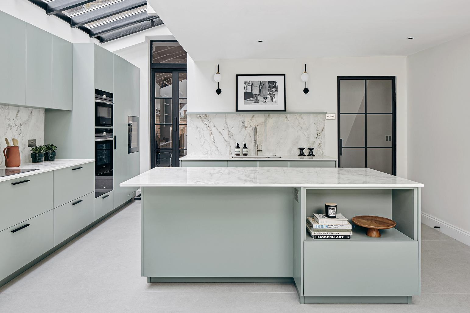 The clients wanted the space to feel airy and calm and for the kitchen layout to leave them with plenty of open space so they can be flexible about where they place the dining table and chairs, to cook, eat, relax, and entertain comfortably all year round, overflowing into the garden when the weather allows. They wanted the island to face the garden, and for it to have a completely clear surface.