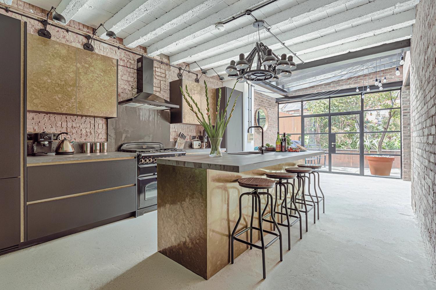 Let it hang out: an overhang at one end of the island helps prevent hips from bashing against the black steel towel/oven glove rail below it.