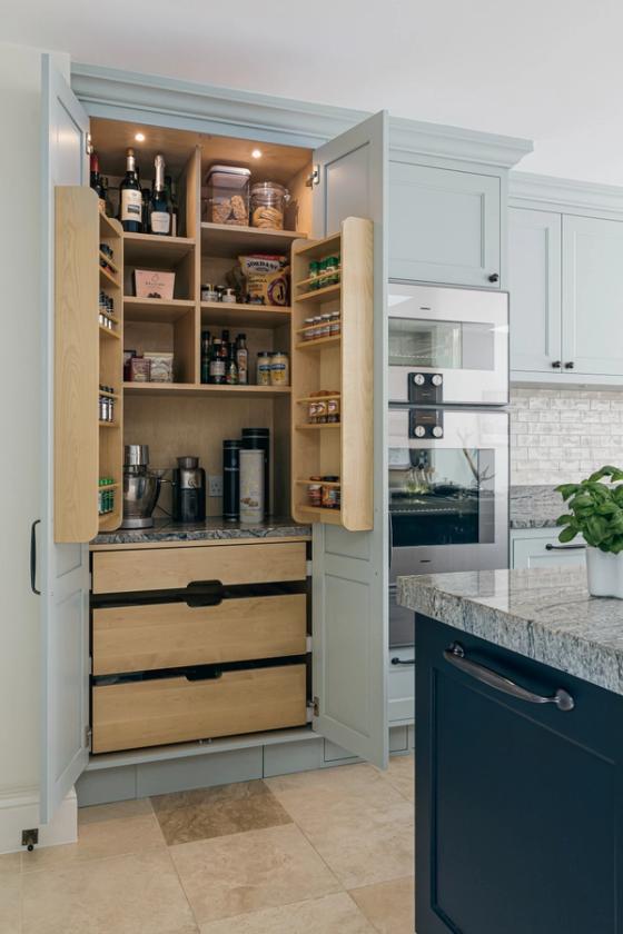 The clients do a lot of cooking and a gas and induction mixed fuel hob, 76cm Gaggenau ovens, and a big larder were hugely important elements in the new kitchen that they wanted Sola Kitchens to create for them. They planned to have a large fridge-freezer and needed plenty of storage space. They also wanted a glazed cabinet to show off their glassware, and a bookcase for their cookery books.