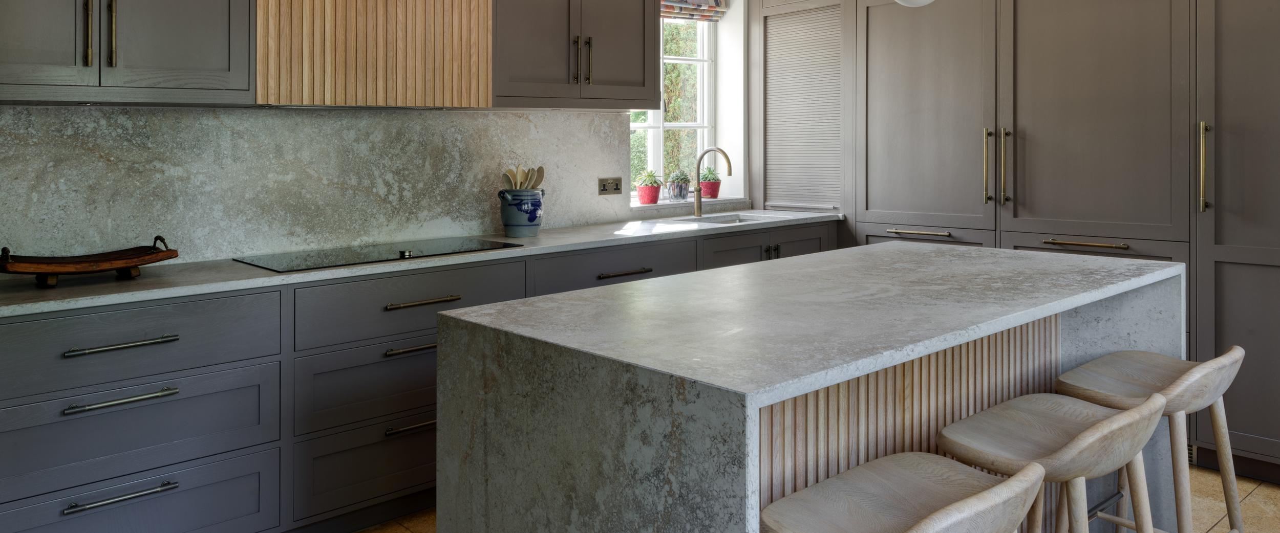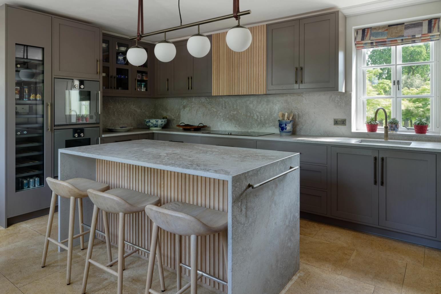 The designer’s solution combines hand-painted, in-frame Shaker cabinetry to create a classic Shaker-style feel, while introducing a contemporary twist with natural wood Skog cabinetry featured on the front of the island. The slim slats are also used to break up the run of grey on the wall and, at the same time, hide the cooker hood above the hob. The overall effect is further modernised by the soft matt-finished quartz worktop and matching splashback by Caesarstone