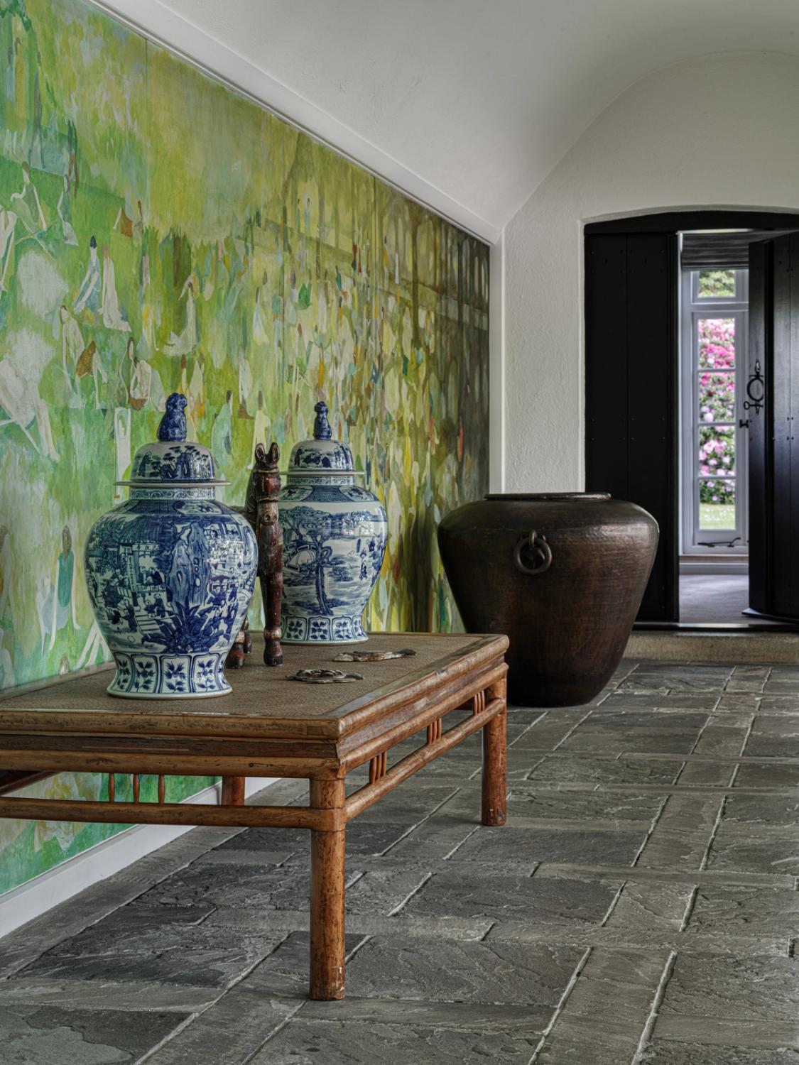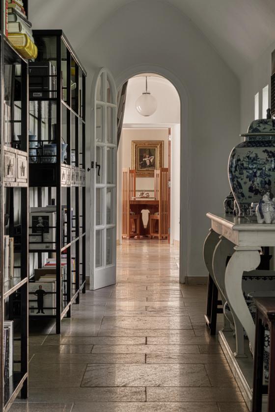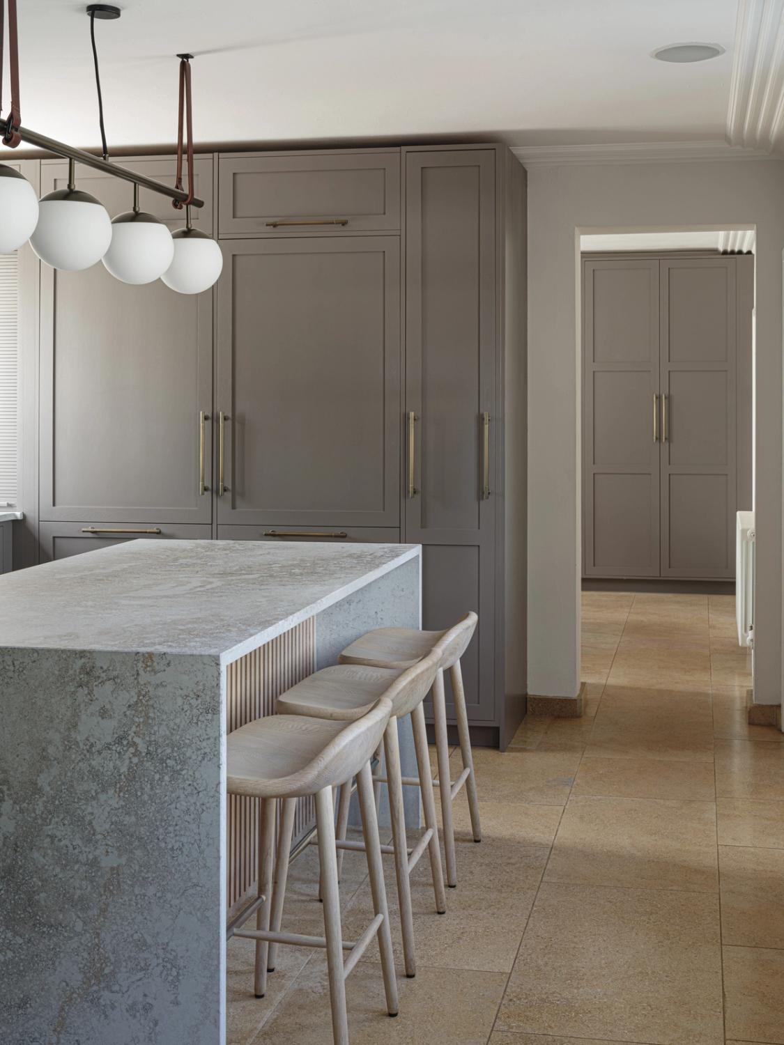 To give the owners and their housekeeper as much storage space as possible, the cabinetry runs all the way up to the ceiling and to the right of the sink, a counter-top cupboard with a door that rolls upwards was added to house the coffee machine. There are two fridge-freezers, both 760mm wide, and standing side by side at one end of the island, with a narrow-width pull-out larder on the end of that run and on the opposite side, a tall wine fridge beside the built-in double ovens.
