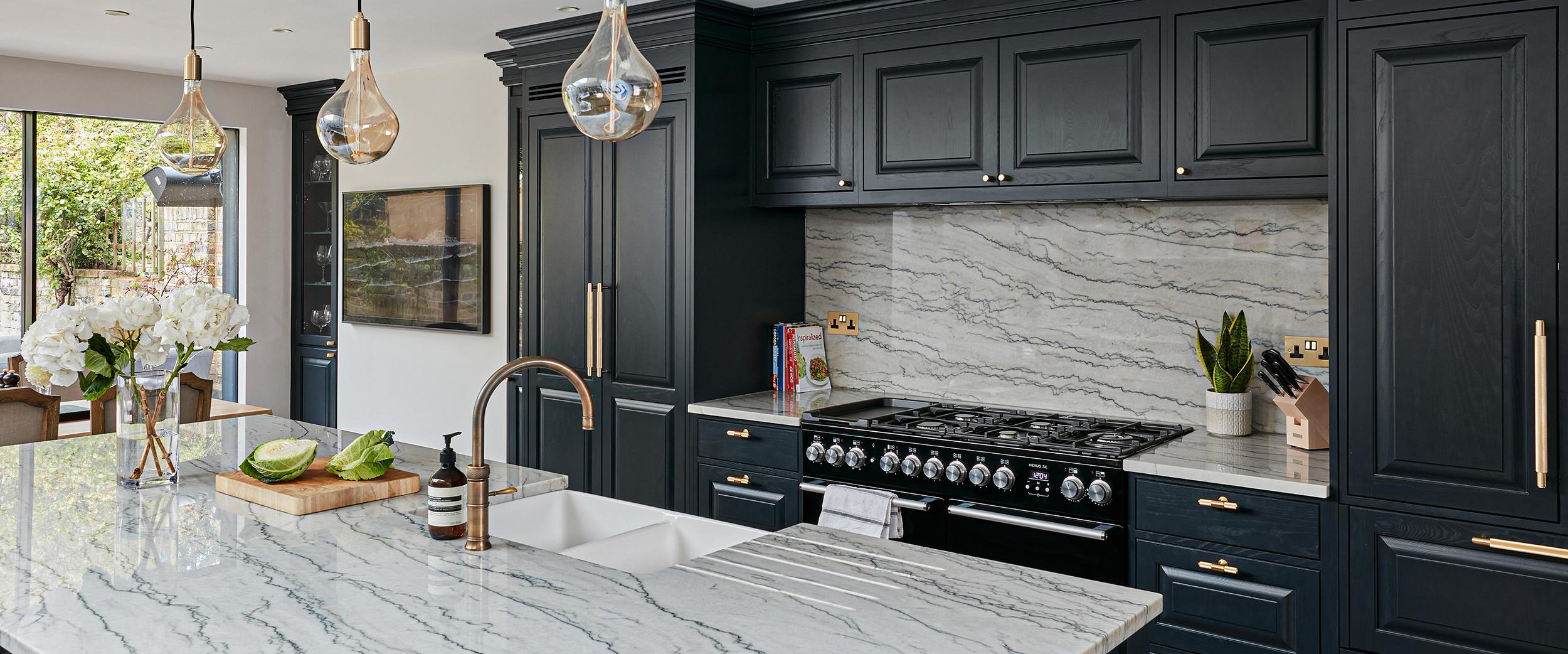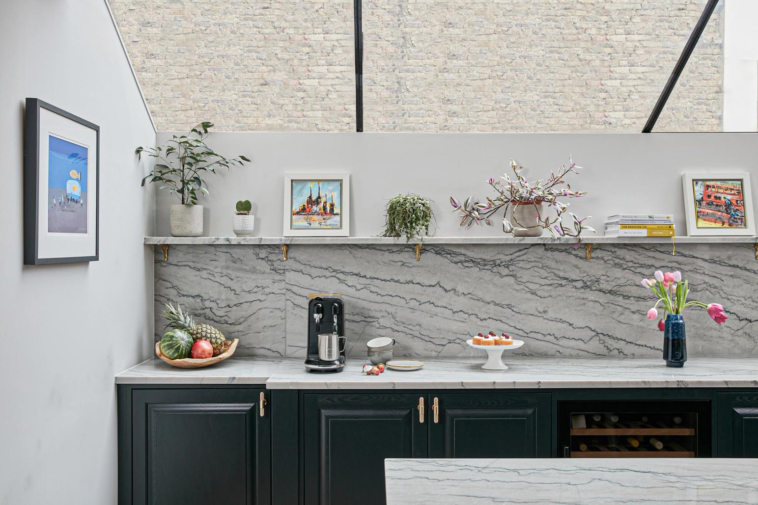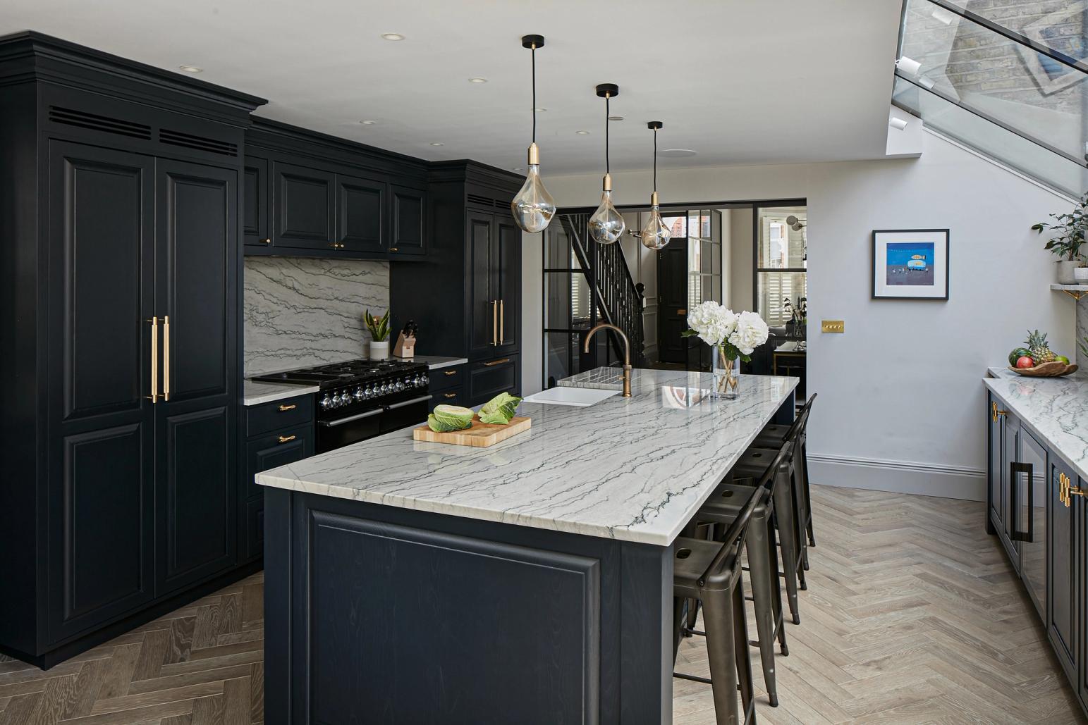 Finishing touches: Farrow & Ball's Railings blue colour was chosen to colour-match with the veining of the quartz as much as it was to emphasis the beauty of the fine architectural detailing on the cabinetry.