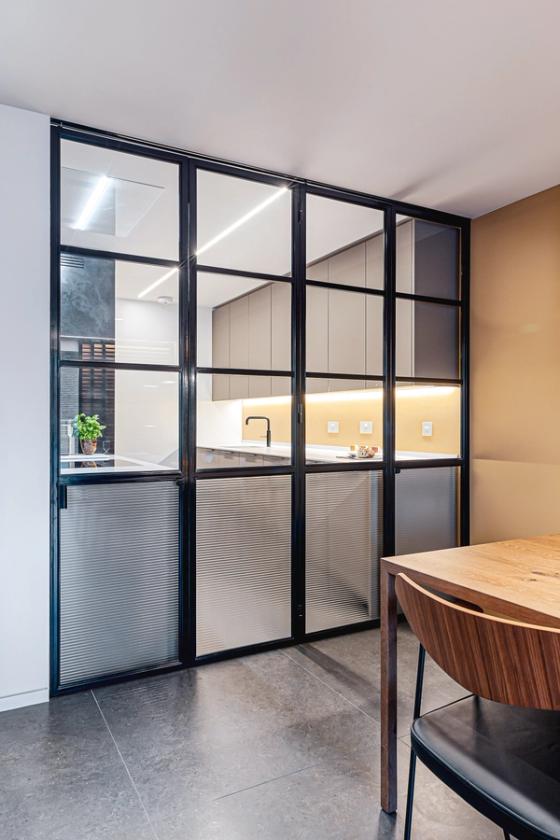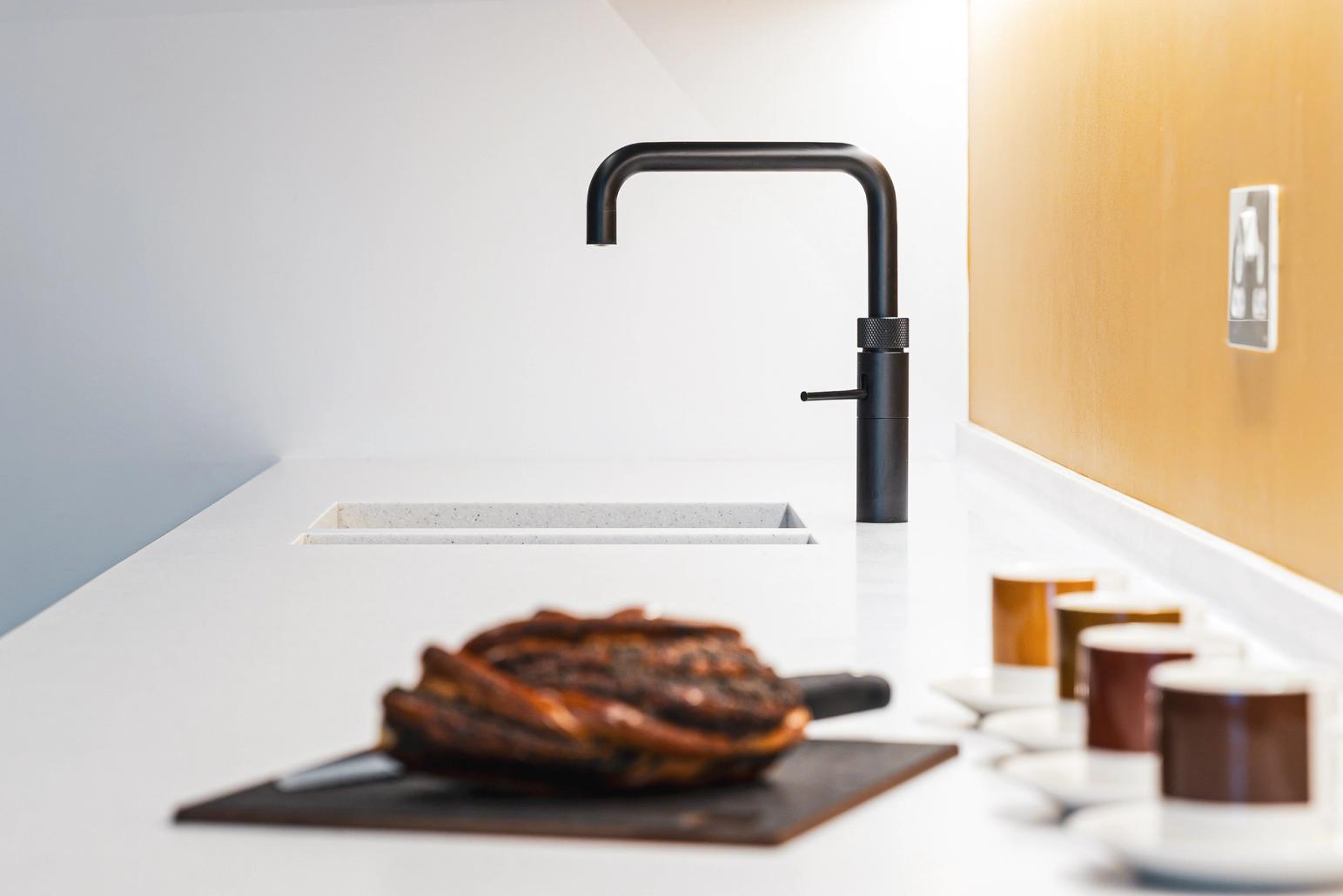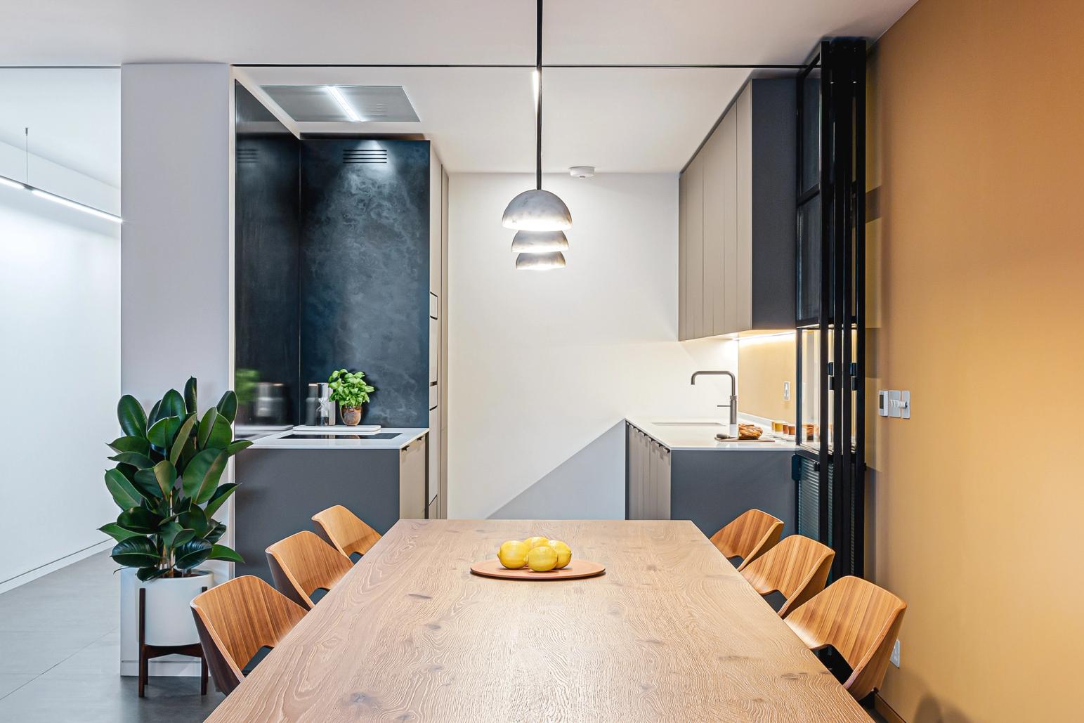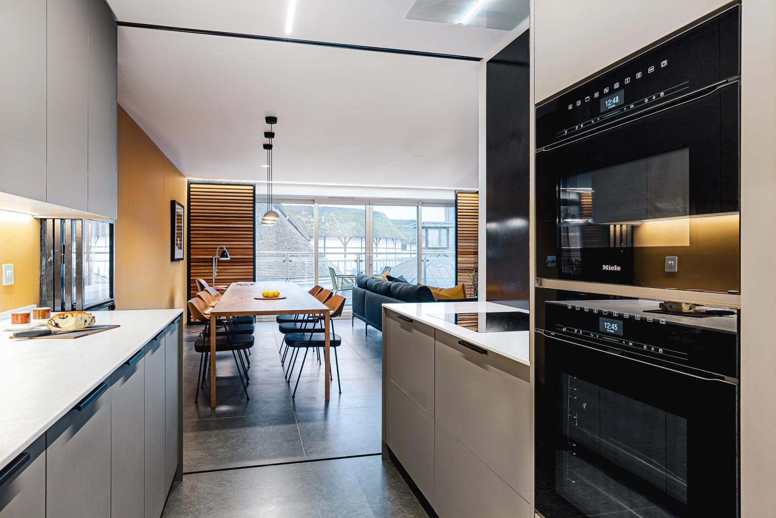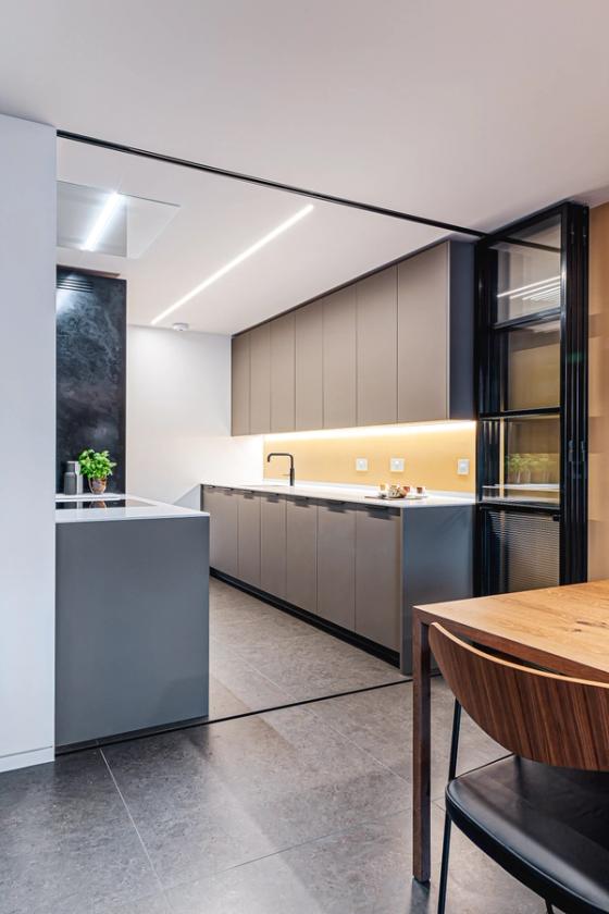 The designer's solution artfully uses optical illusions to make this compact space look and feel higher and wider than it really is, with a neutral colour palette so it melts away into the background regardless of whether the glazed, folding Crittall-style door is closed or not. Taking its cue from professional galley kitchens, the grey laminated cabinetry is arranged along both sides of the long, narrow space and the sleek flat-fronted doors reach all the way up to the ceiling, to accentuate the height. To make the space feel open and welcoming, and with no awkward massing to jar the simplicity of the scheme, just one run of wall-mounted cabinets is used, and the hob is situated at the front end of the galley with a powerful extraction vent flush in the ceiling. Beyond, tall cabinets enclose the fridge-freezer and double ovens, and these, together with the sink tap in the otherwise clutter-free Corian worktop on the other wall, draw the eye along the length of the galley.