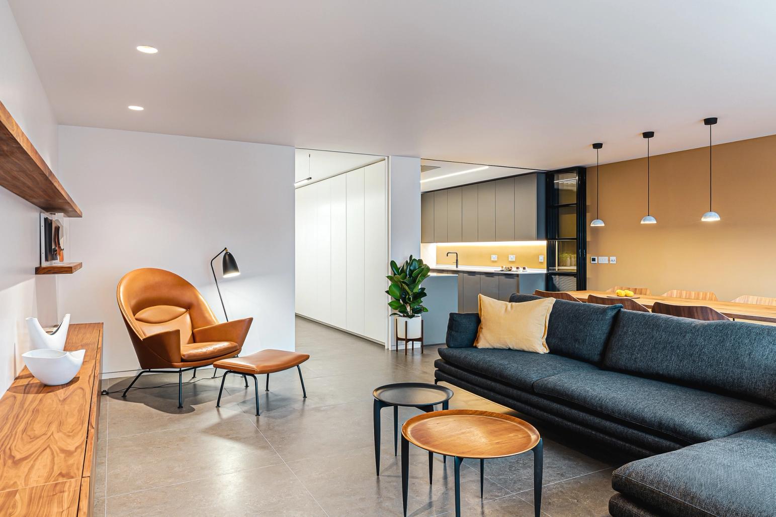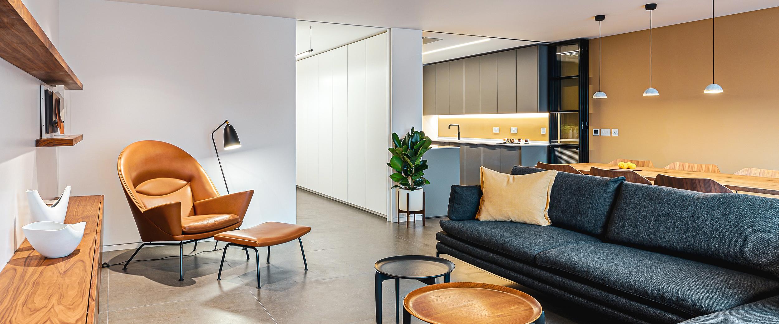 Clever zoning and minimalist styling are key to making this open-plan living room and home office work with premium efficiency.