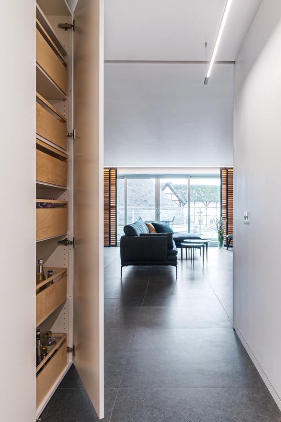 Hidden drawers: a single column of bespoke pantry drawers has been hidden behind a push-to-open door in the all-white-painted corridor that runs behind the hob wall.