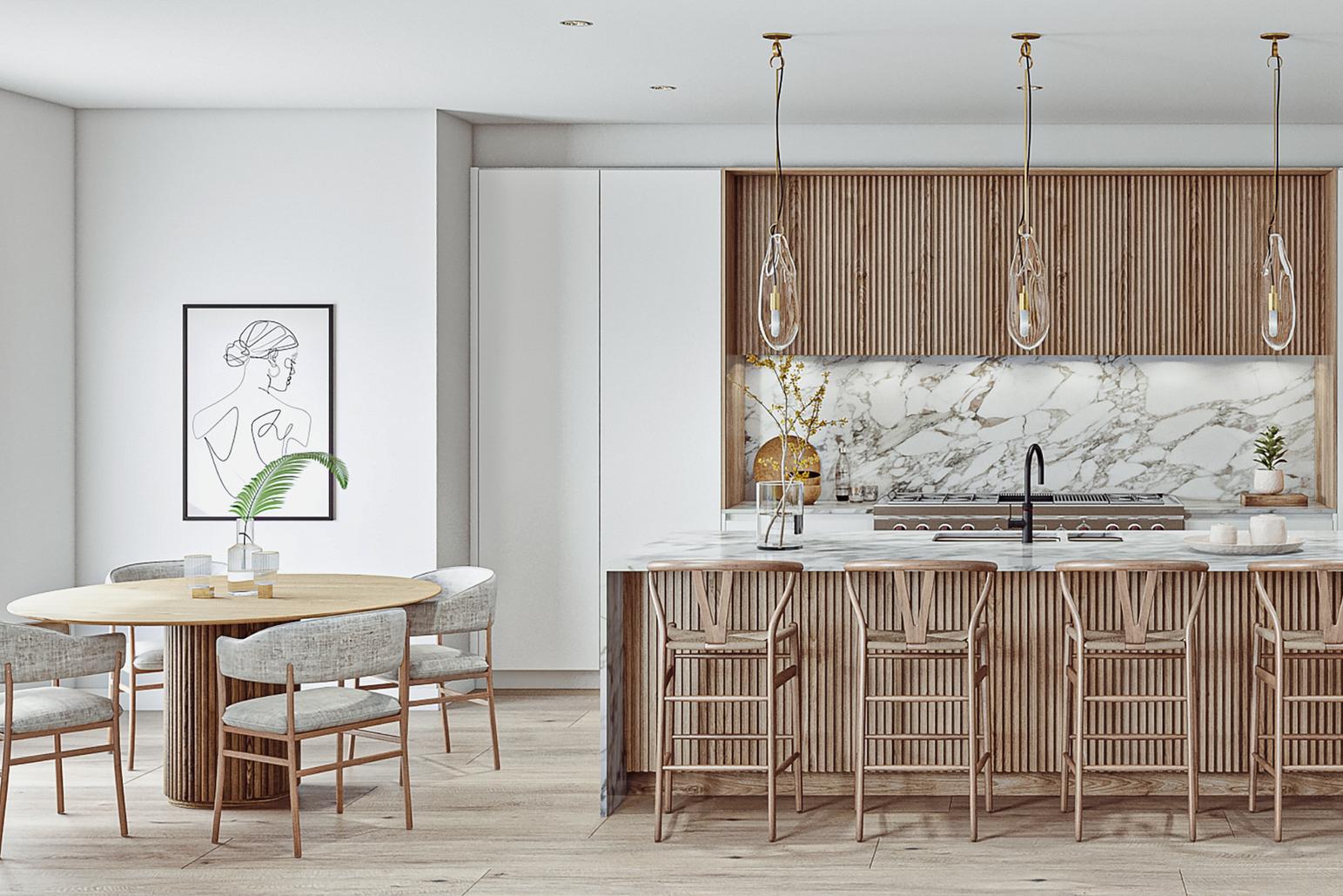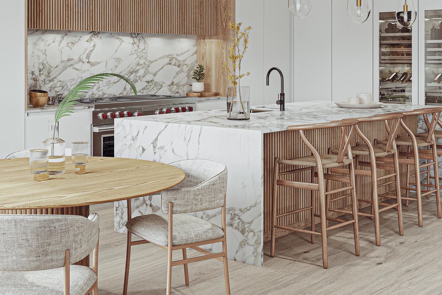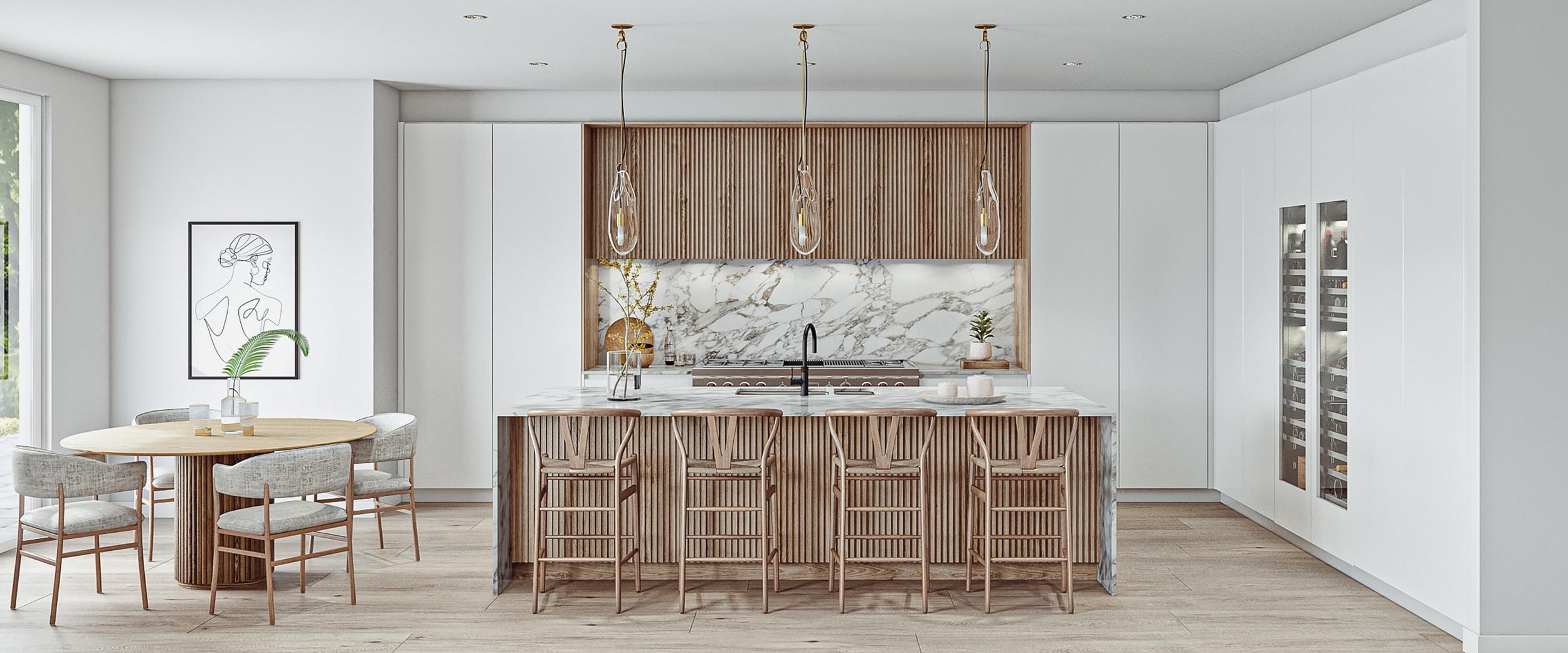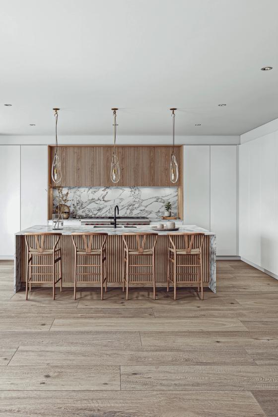 The designer's solution uses the pale wood beauty of Sola Kitchen's signature style Skog, with its thin, vertical slats and grooves in white-oiled oak, to add texture and depth to the scheme and elegantly elevate the necessary functional aspects of the kitchen, as well as focus attention on the beating heart of the room. The waterfall island in white marble is beautiful and is a workhorse for visiting chefs as it is scratch-, heat- and liquid-resistant and inset with a double sink and Quooker tap. It is also a talking point and a chef's table (or means of direct service) for guests. The sleek, white-painted cabinets with outframe doors and integrated handles, enclose plenty of storage and an integrated high-performance Gaggenau fridge-freezer, with more storage in the drawers on the working side of the island.