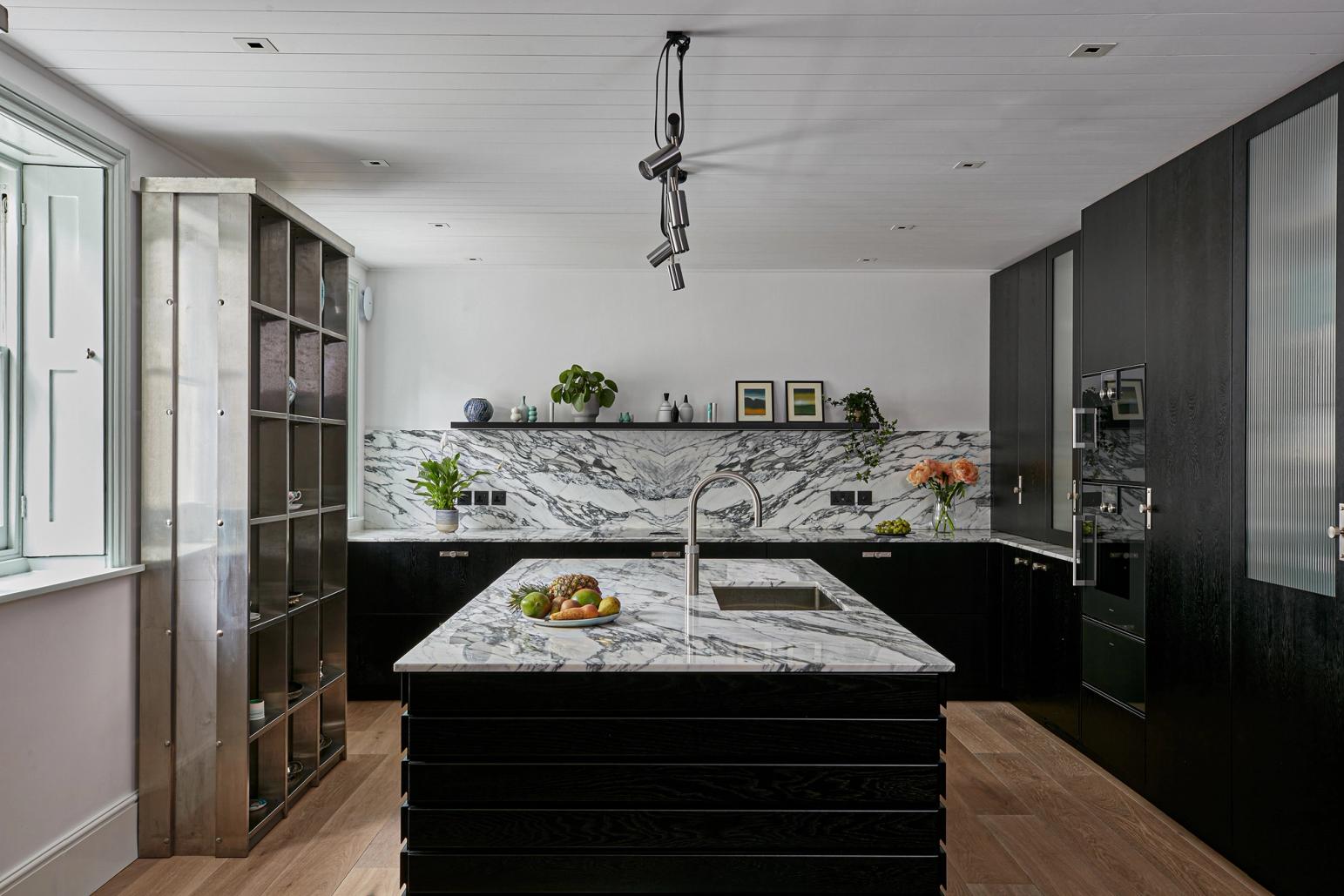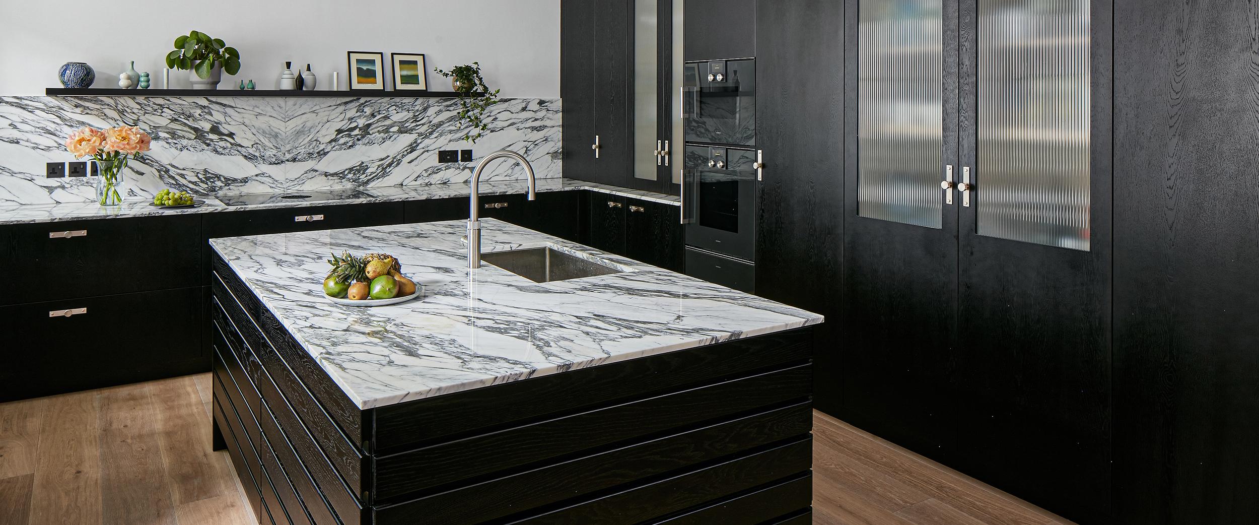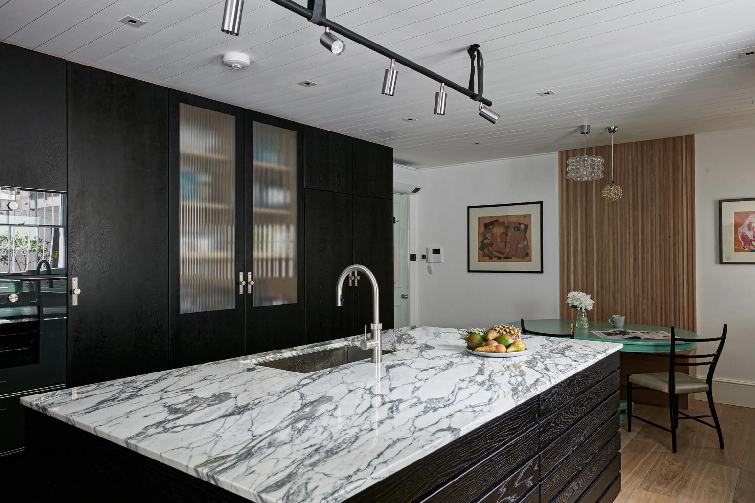 The designer's solution incorporates two of Sola Kitchen's signature styles, Hygge and Skog, to create a scheme with clearly defined zones for cooking, food storage, eating, and entertaining. The working kitchen embodies a Japandi aesthetic with black-stained oak-veneered flat fronts and slats of the Hygge cabinetry, showcasing the natural wood grain. The striking Calcutta marble with its rich veining, personally selected by the client, and the distinctively designed stainless-steel handles by Armac Martin elevate the space. At the owner's request, the Blanco sink is integrated into the island so she can enjoy views of the garden, with easy access to the pantry, featuring fluted glass doors, and a Gaggenau fridge behind. The dining area, at the opposite end of the room, is given its own unique identity with a full-height wall panel of Skog panel serving as a statement backdrop for the client's green-painted dining table.