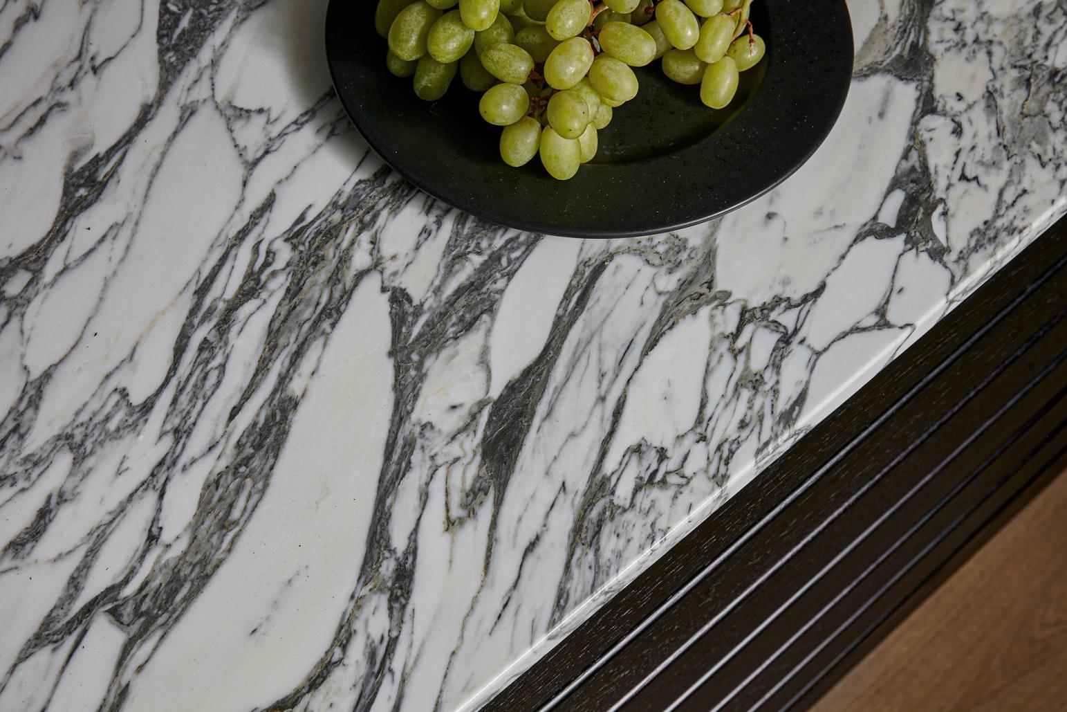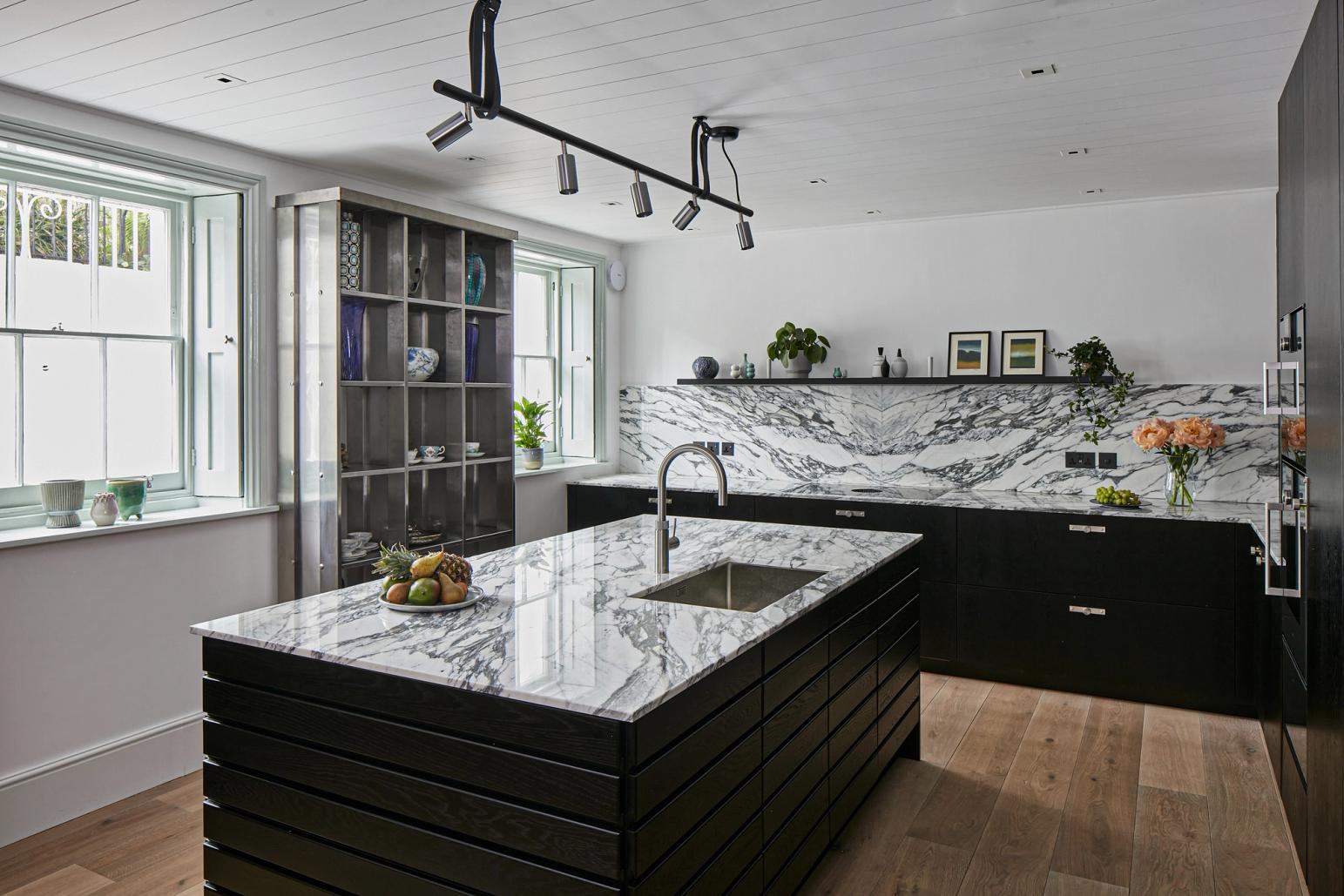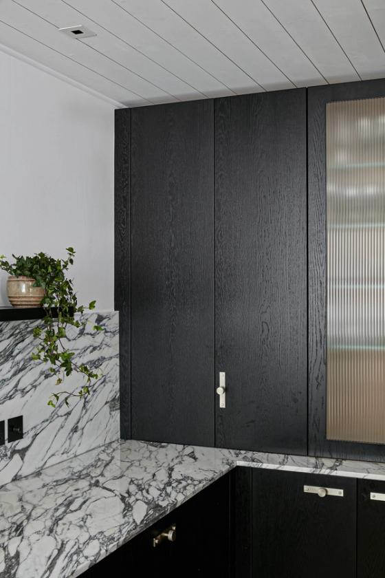 The designer's solution incorporates two of Sola Kitchen's signature styles, Hygge and Skog, to create a scheme with clearly defined zones for cooking, food storage, eating, and entertaining. The working kitchen embodies a Japandi aesthetic with black-stained oak-veneered flat fronts and slats of the Hygge cabinetry, showcasing the natural wood grain. The striking Calcutta marble with its rich veining, personally selected by the client, and the distinctively designed stainless-steel handles by Armac Martin elevate the space. At the owner's request, the Blanco sink is integrated into the island so she can enjoy views of the garden, with easy access to the pantry, featuring fluted glass doors, and a Gaggenau fridge behind. The dining area, at the opposite end of the room, is given its own unique identity with a full-height wall panel of Skog panel serving as a statement backdrop for the client's green-painted dining table.