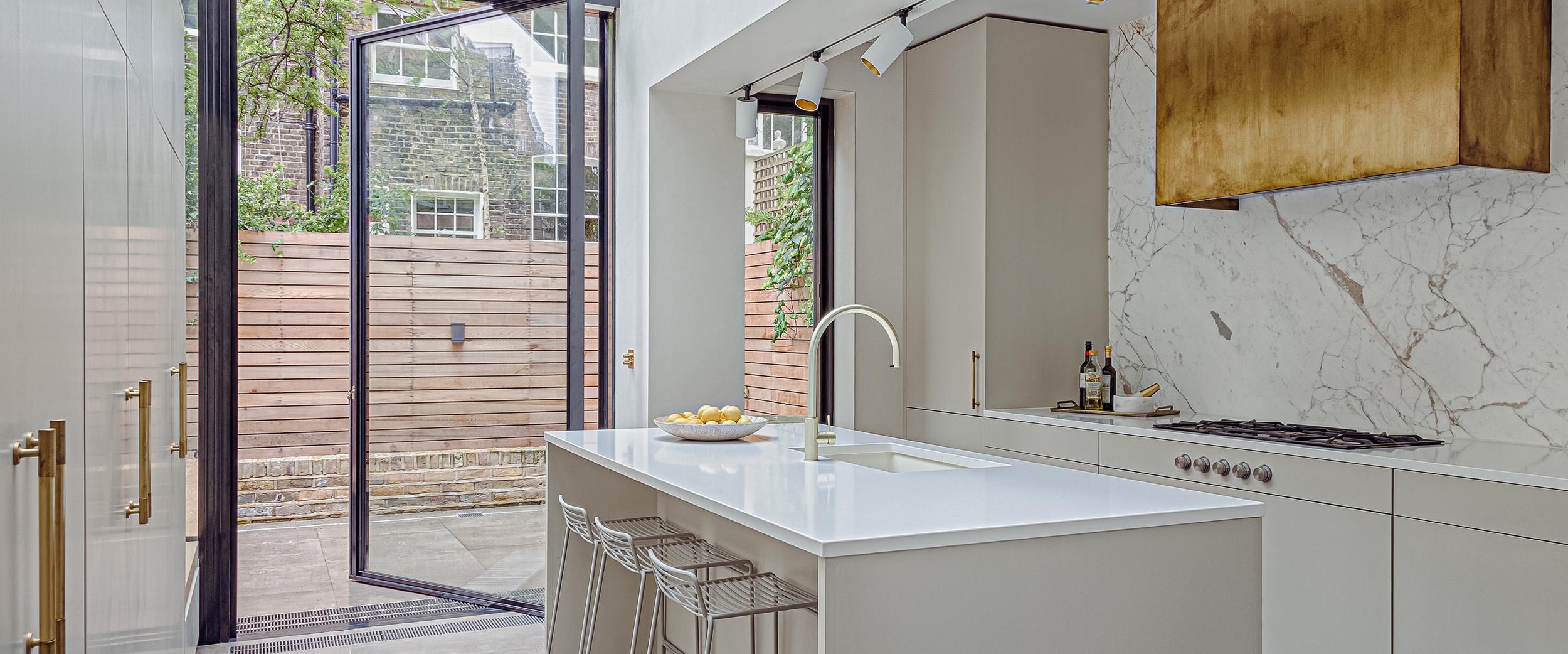 The designer's solution features full-height wall cabinets with brass bar handles, drawing attention to the impressive high ceilings while providing ample storage to keep all kitchen essentials neatly tucked away. Tall base drawers offer space for larger pans, and the two ovens are cleverly concealed within a tall cabinet opposite the island, equipped with a pocket door that slides out of sight when in use. However, the standout element of the space is a stunning three-metre-wide piece of Calacatta marble, which was carefully lowered through the house on a specially built track and securely mounted on the wall before the kitchen installation began. This marble masterpiece truly elevates the entire design.